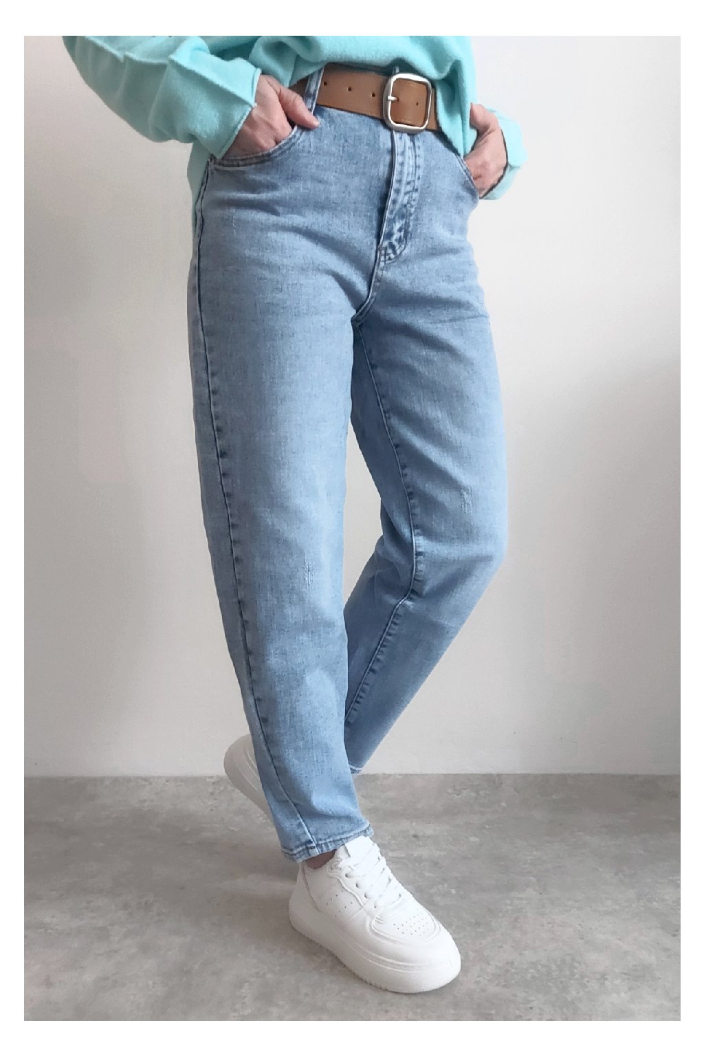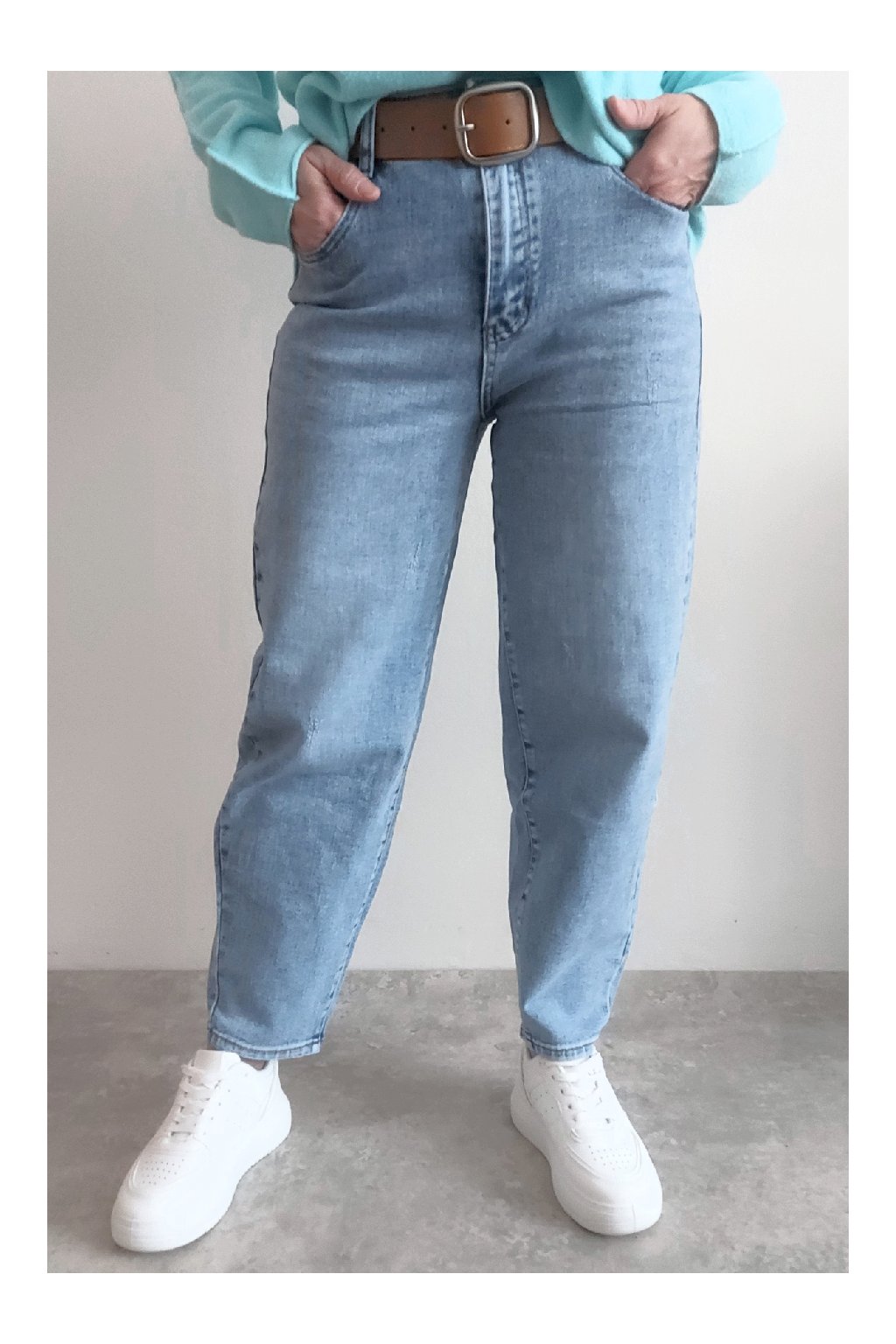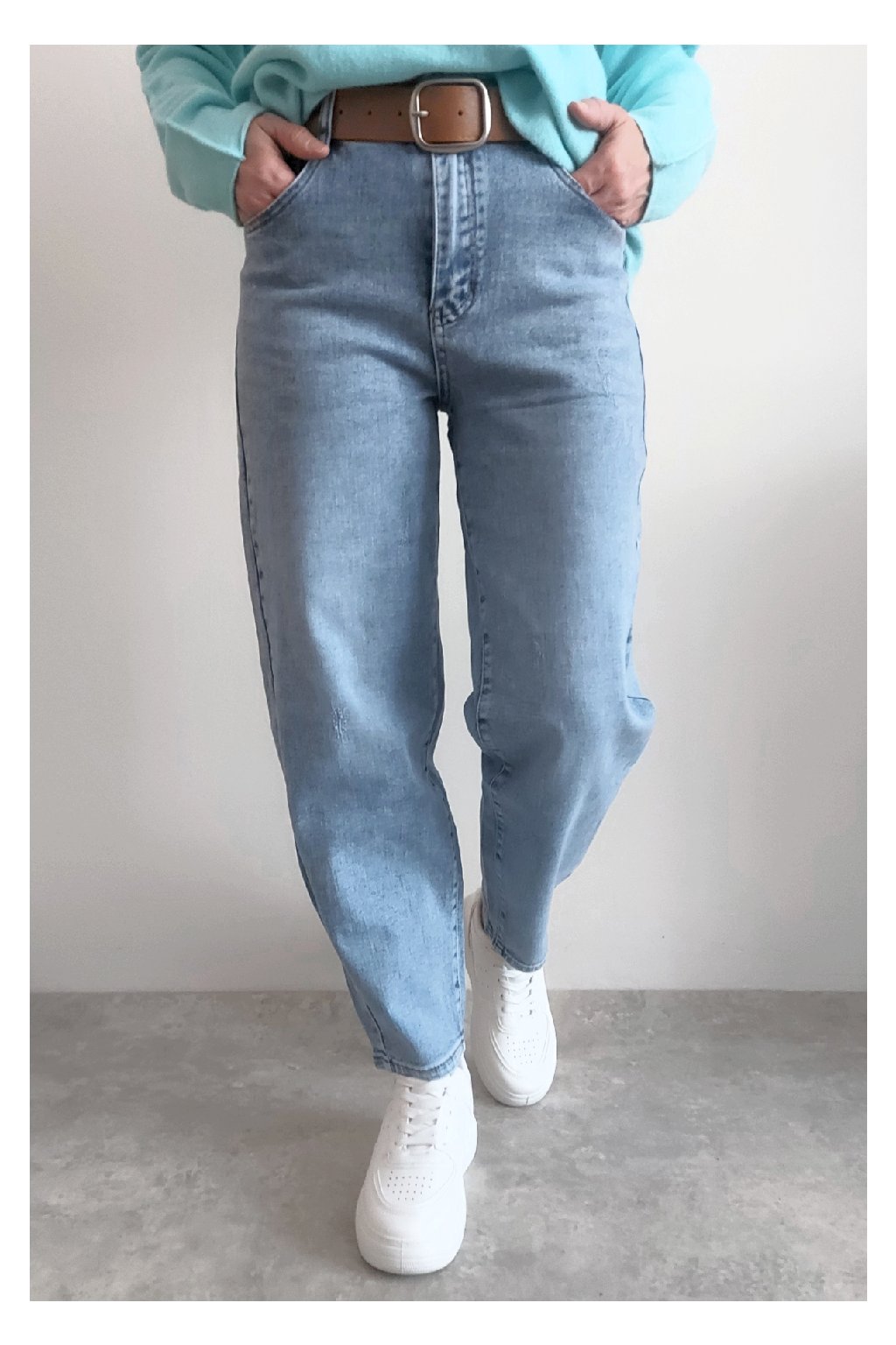 Skvělé džíny balonového střihu značka Moon Girl. Místy efektní dření, světle modrá barva. Pásek součástí. Přední i zadní kapsy. Materiál kvalitní a mírně pružný. Velikosti odpovídají, ale kdo má rád volnější - berte o číslo větší než běžně nosíte. Vel. S focena na vel. XS, výška 156cm.