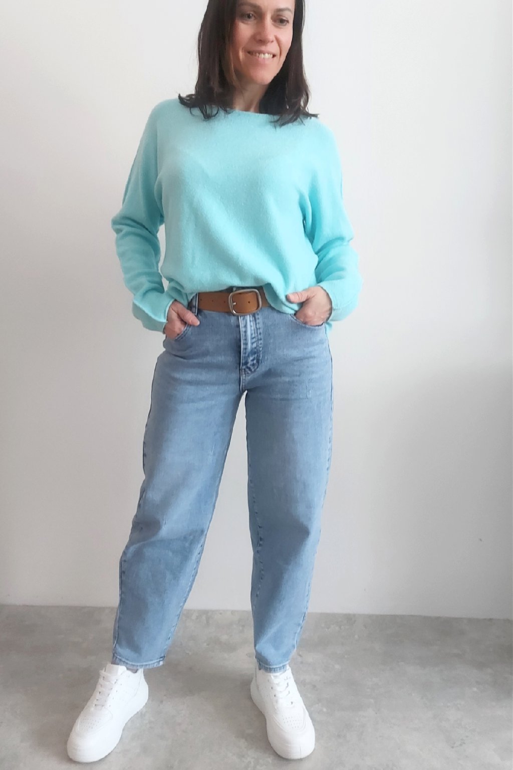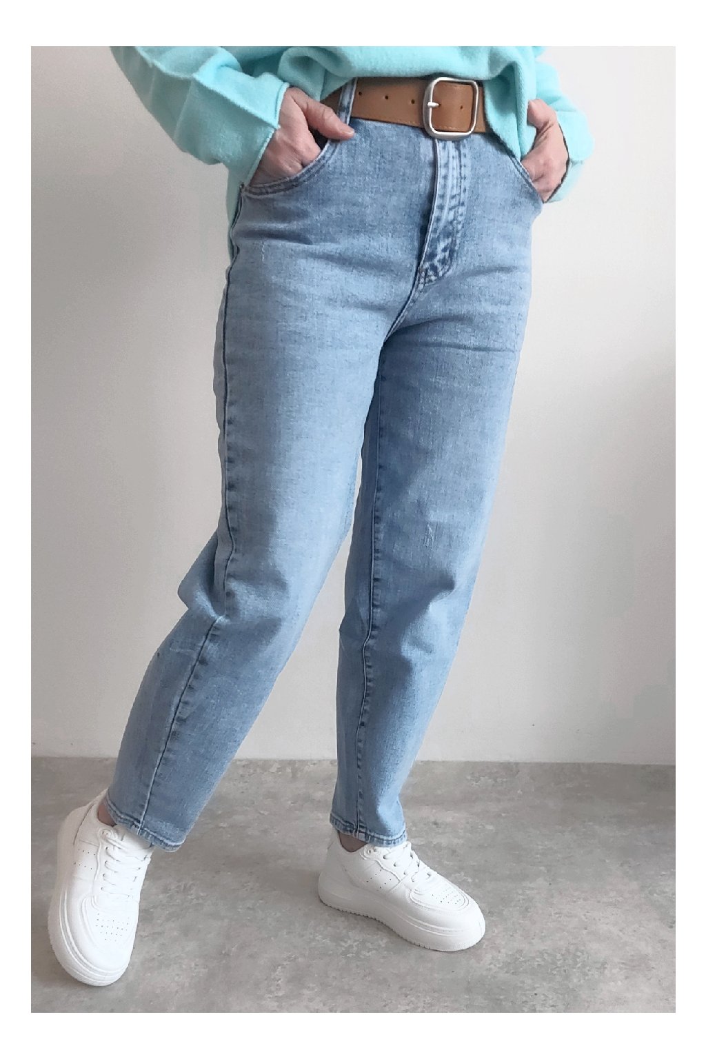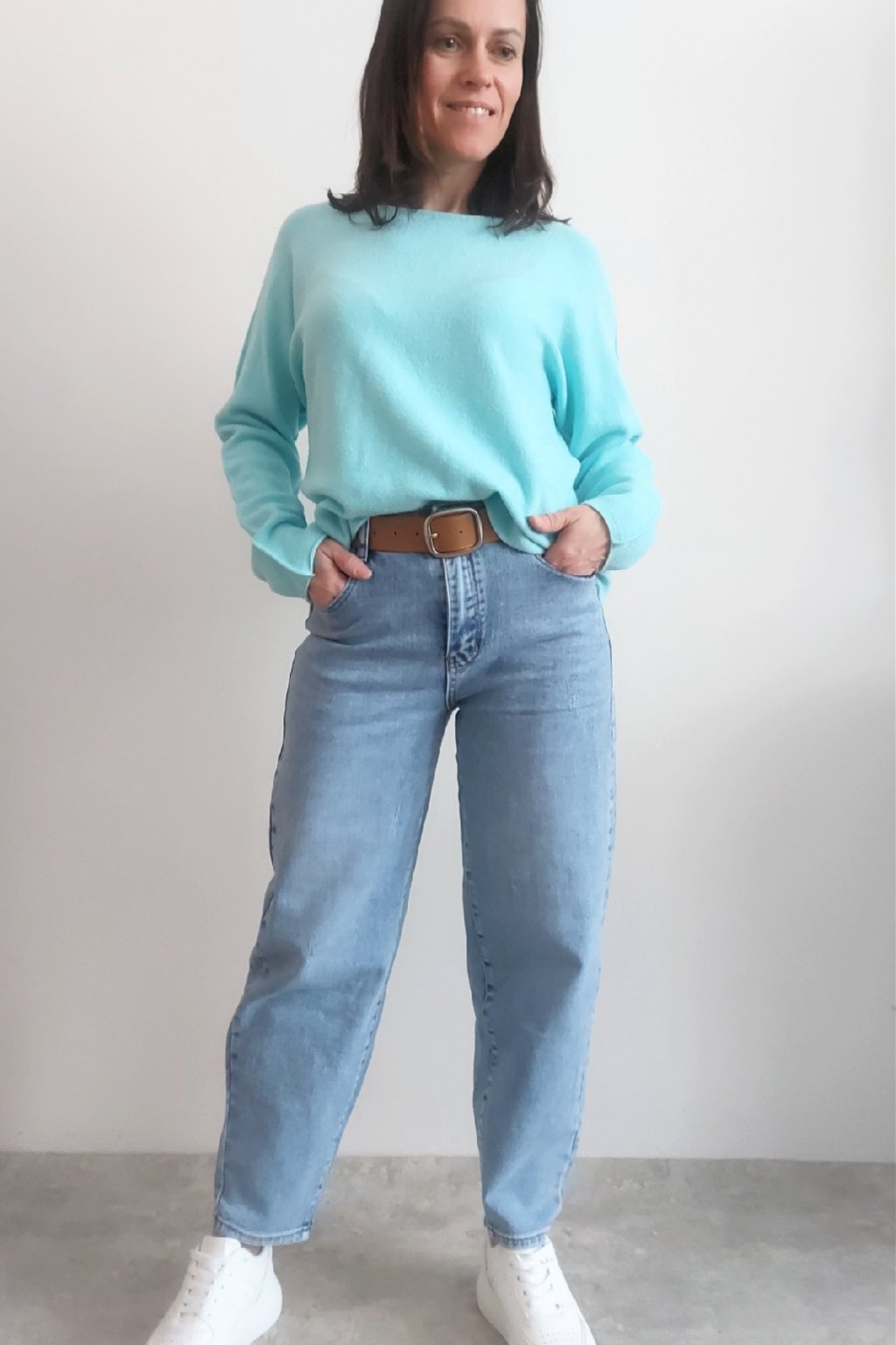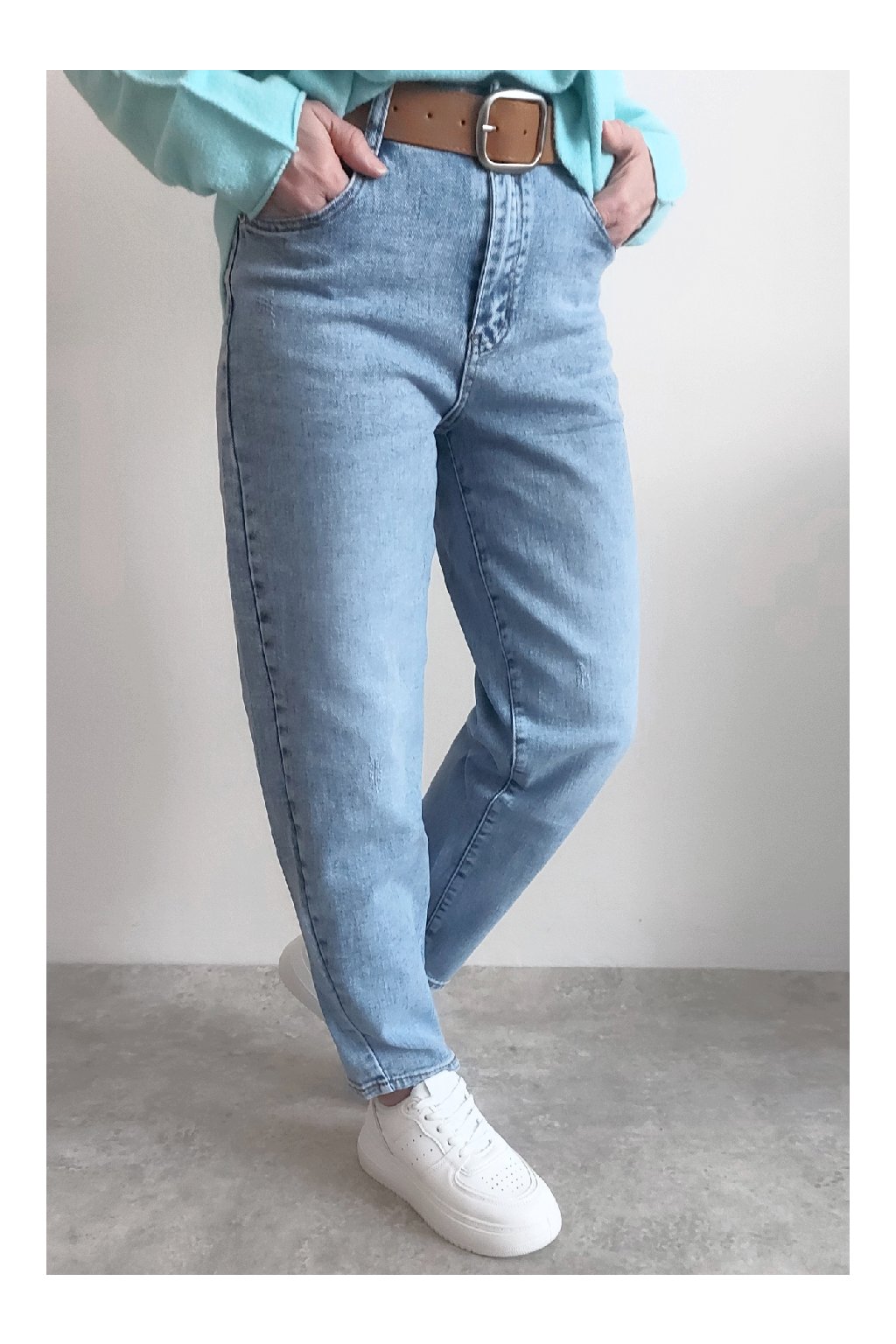 Skvělé džíny balonového střihu značka Moon Girl. Místy efektní dření, světle modrá barva. Pásek součástí. Přední i zadní kapsy. Materiál kvalitní a mírně pružný. Velikosti odpovídají, ale kdo má rád volnější - berte o číslo větší než běžně nosíte. Vel. S focena na vel. XS, výška 156cm.
