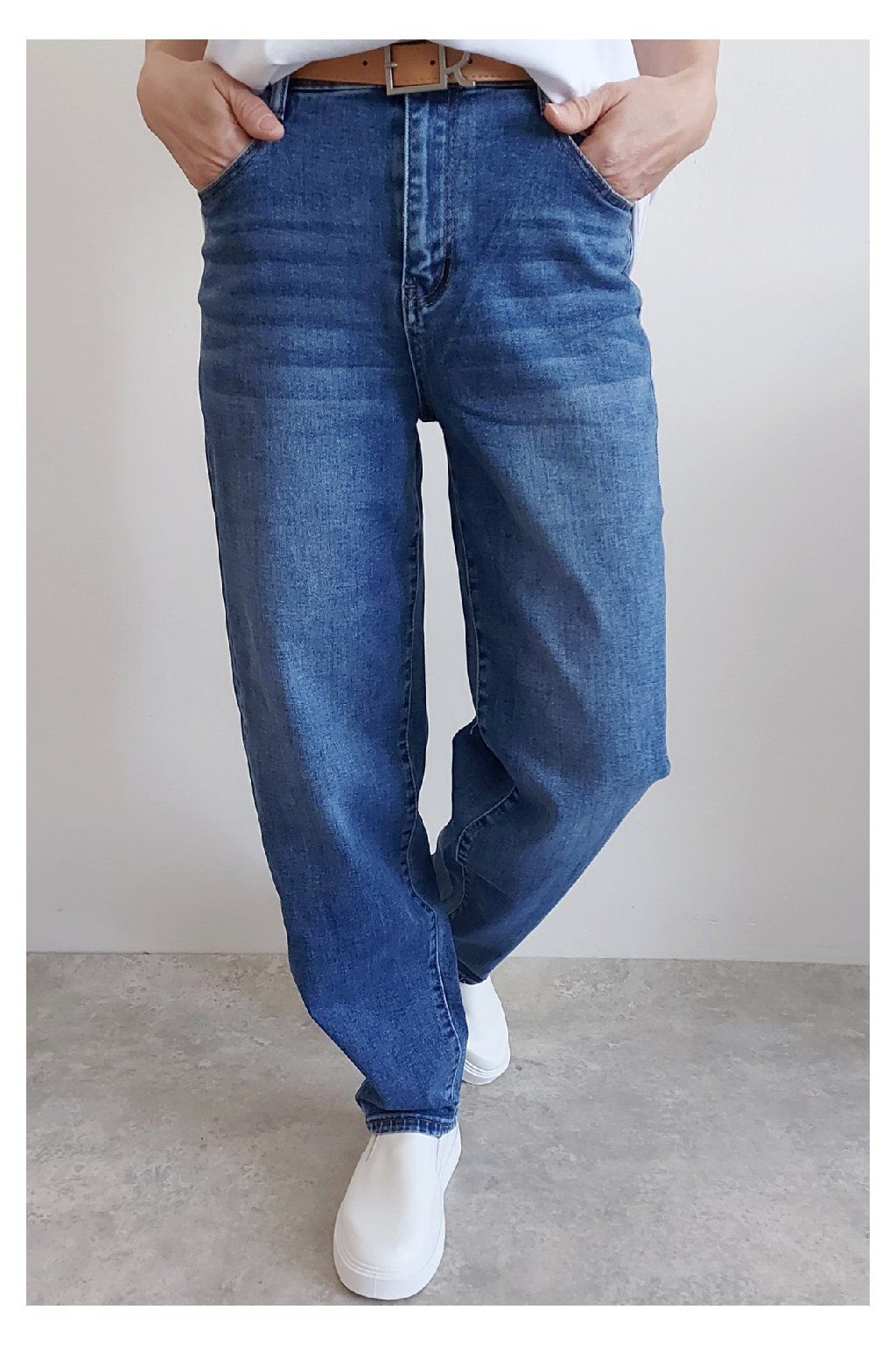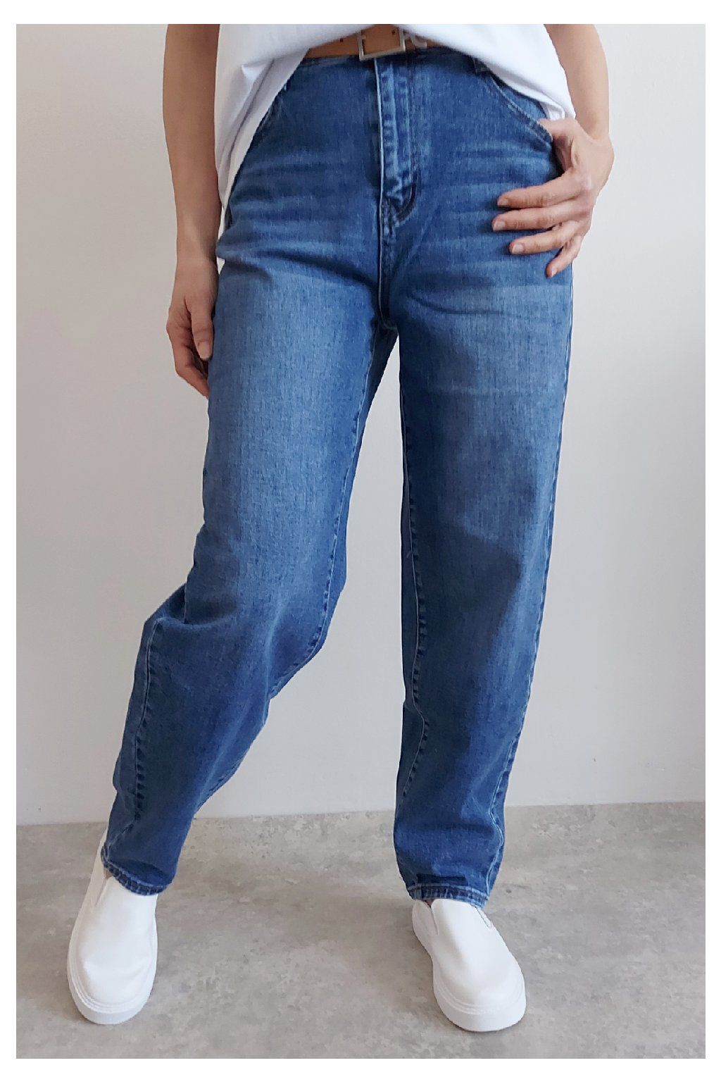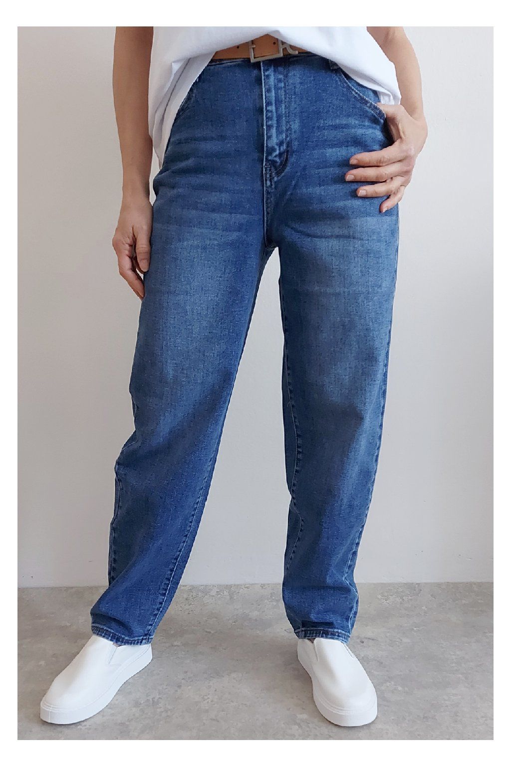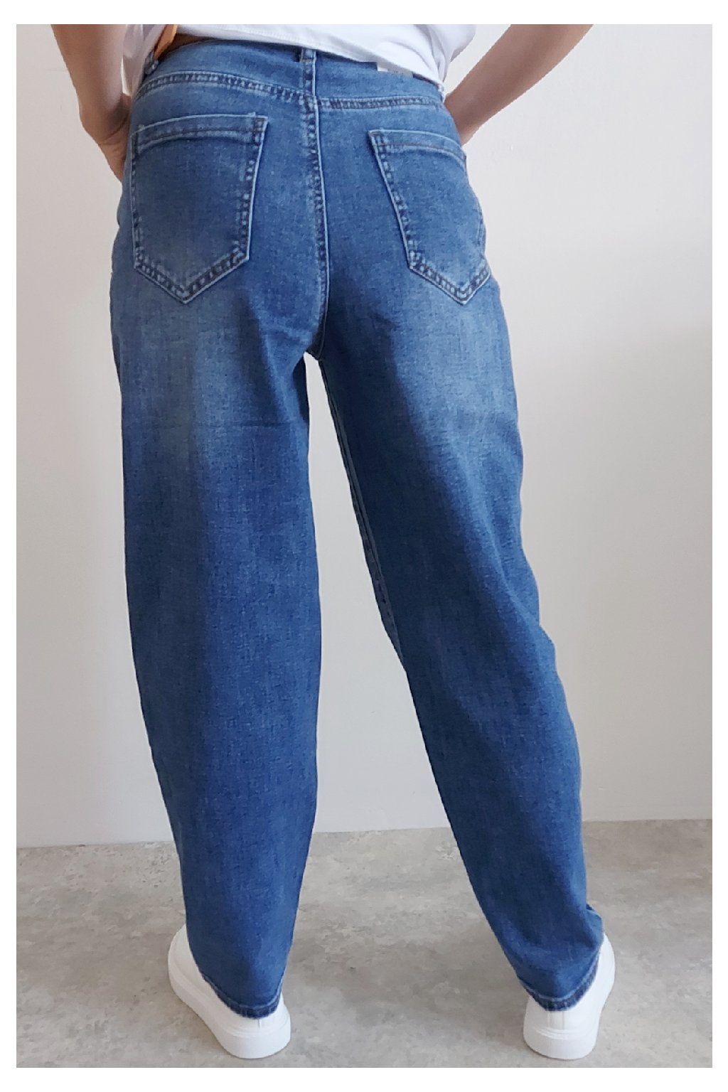 Skvělé džíny lehce balonového střihu značka Moon Girl. Tmavší modrá denim barva, místy šisovaná. Pásek součástí. Přední i zadní kapsy. Materiál kvalitní a mírně pružný. Velikosti odpovídají, ale kdo má rád volnější - berte o číslo větší než běžně nosíte. Vel. S focena na vel. XS, výška 156cm.