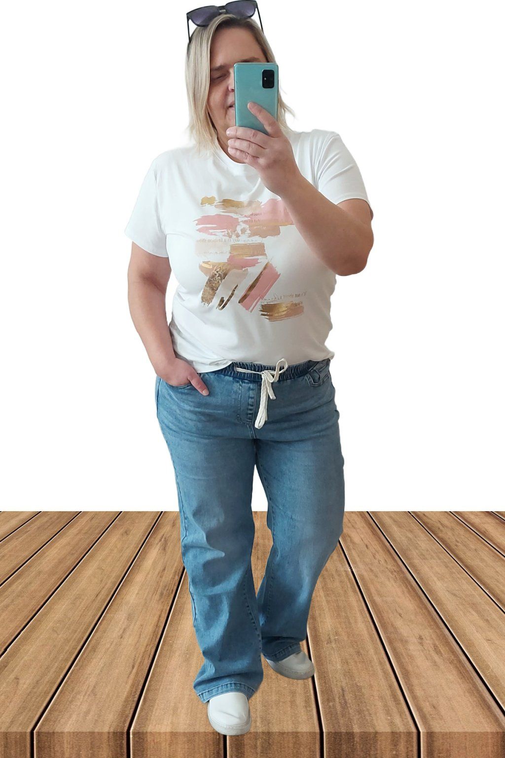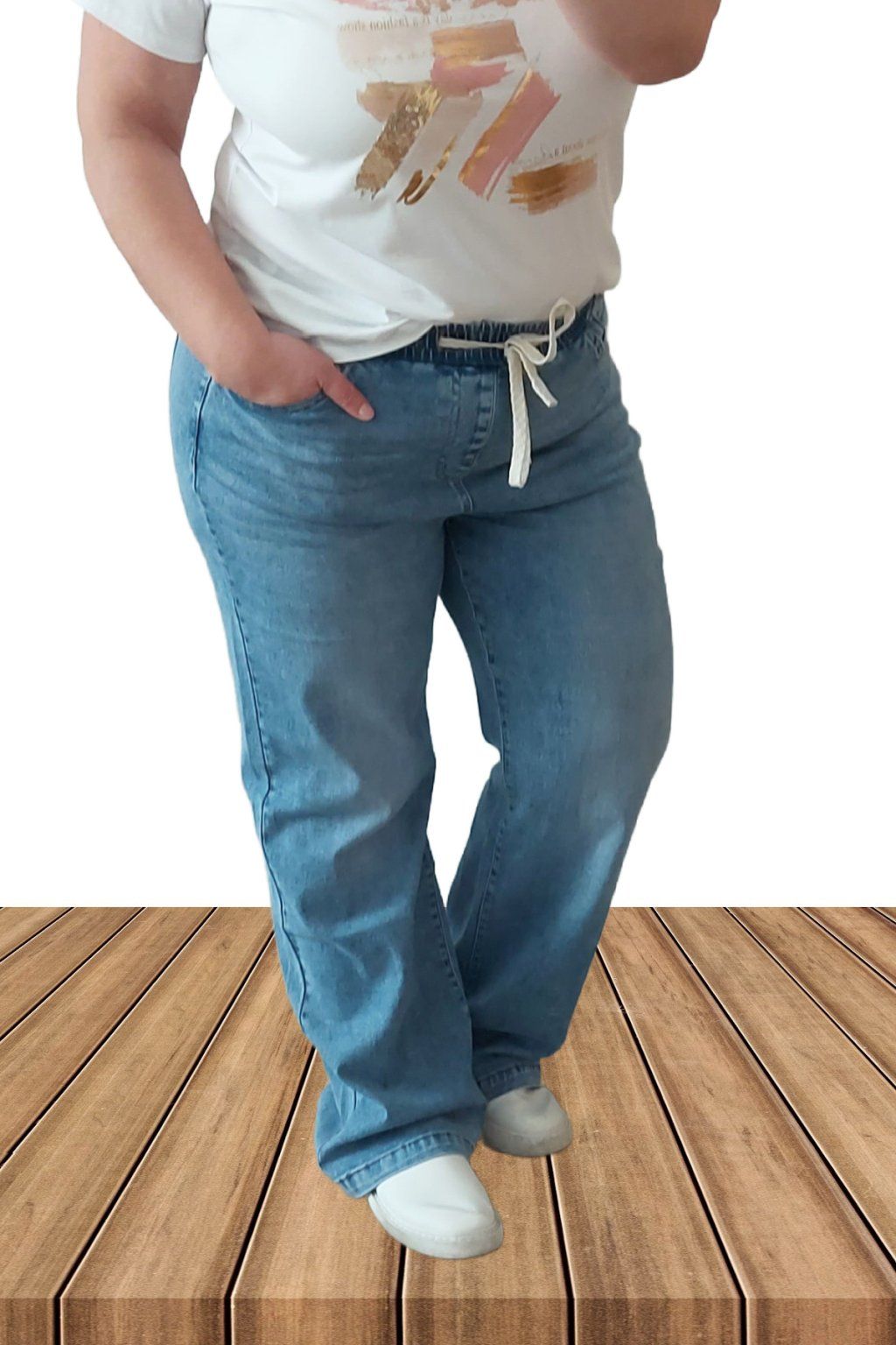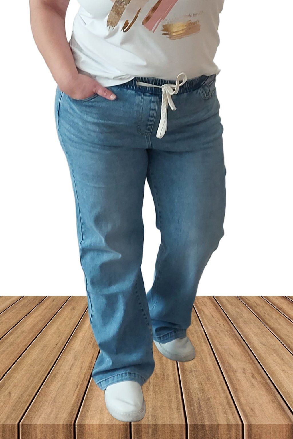 9Topkové džíny s rovnými širšími nohavicemi. V pase guma šňůrka pro stažení obvodu. Přední a zadní kapsy. Sed klasický. Materiál kvalitní a velmi pružný. Světlejší modrá denim barva místy šisovaná.  Vel. 2XL focena i na vel. 2XL (pas 112cm, boky 120cm), výška 165cm.
