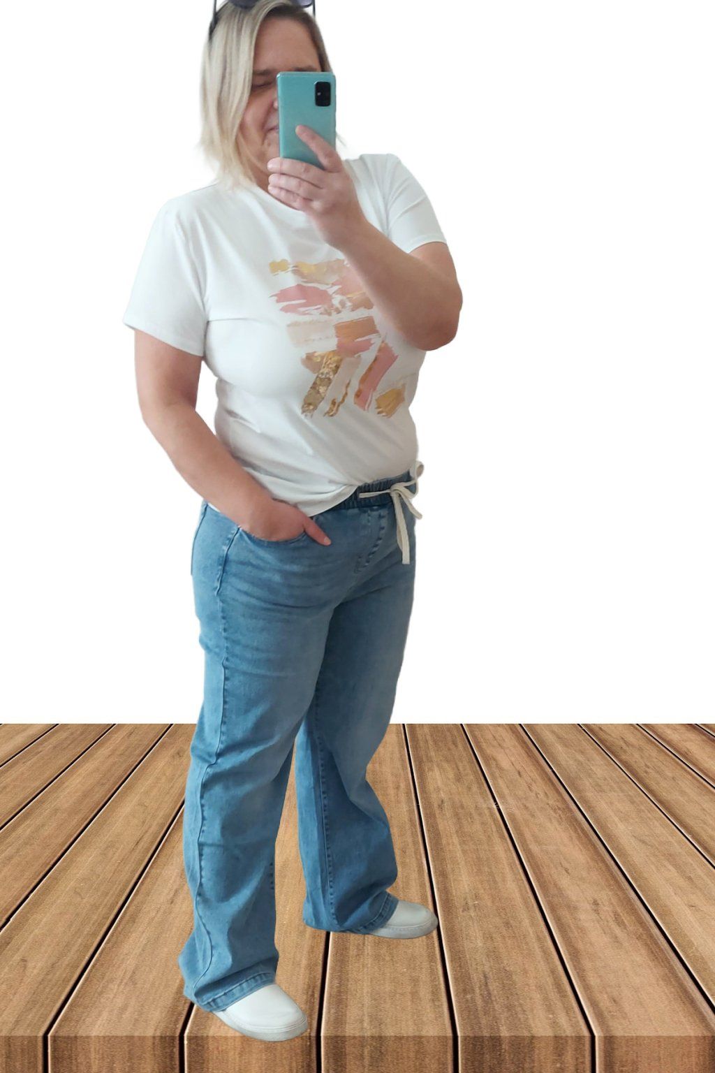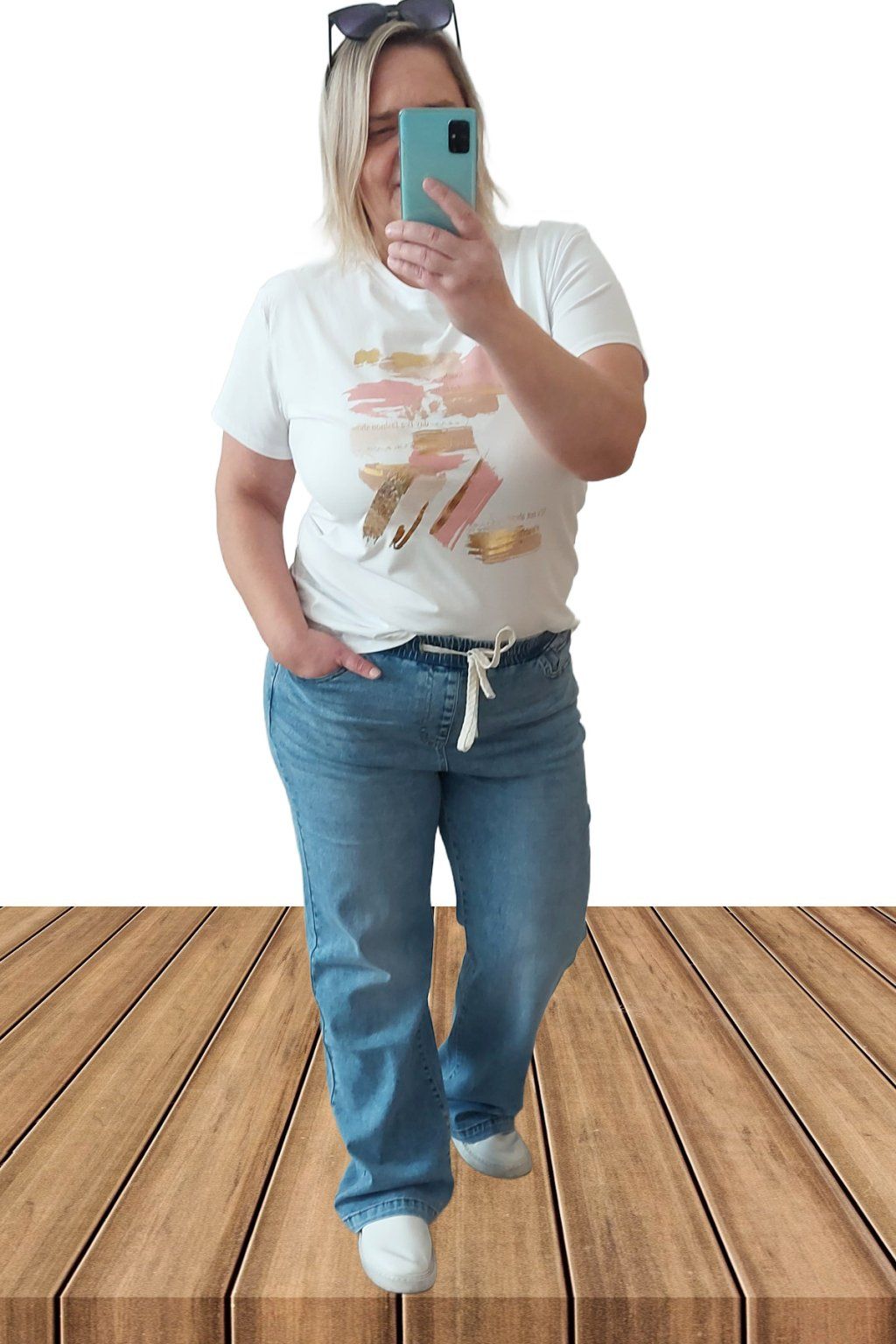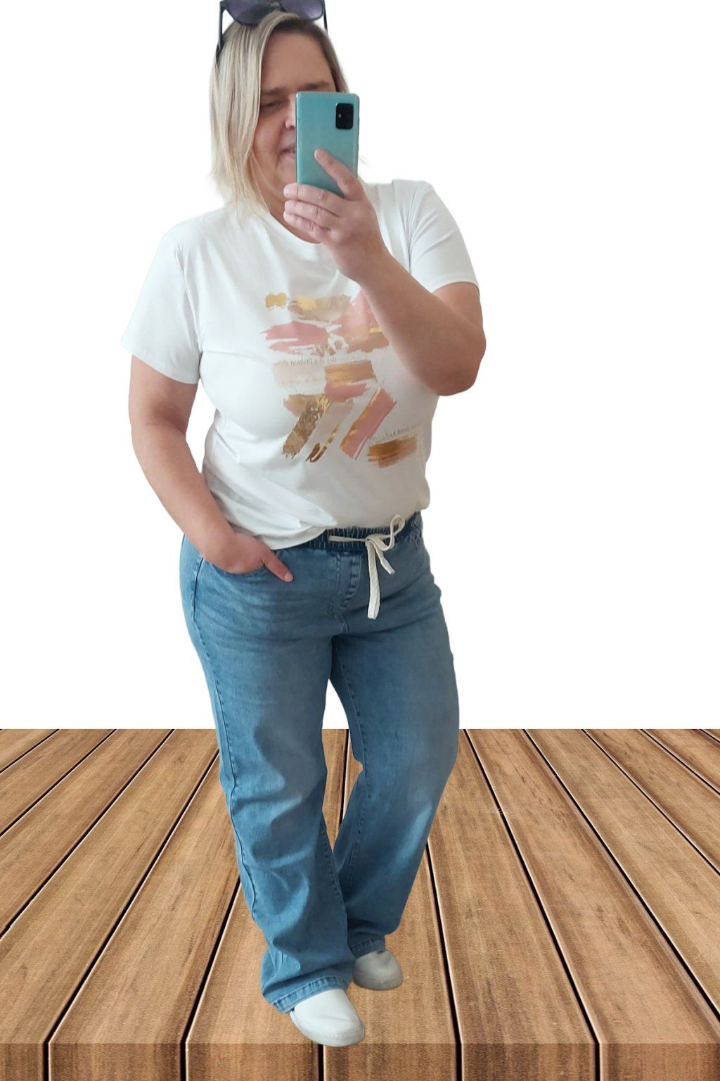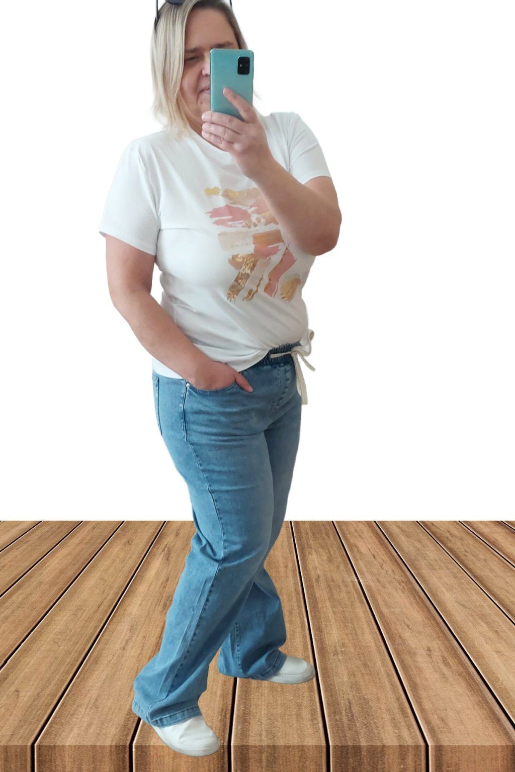 9Topkové džíny s rovnými širšími nohavicemi. V pase guma šňůrka pro stažení obvodu. Přední a zadní kapsy. Sed klasický. Materiál kvalitní a velmi pružný. Světlejší modrá denim barva místy šisovaná.  Vel. 2XL focena i na vel. 2XL (pas 112cm, boky 120cm), výška 165cm.