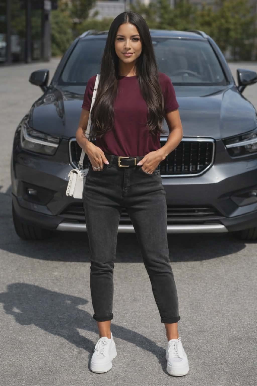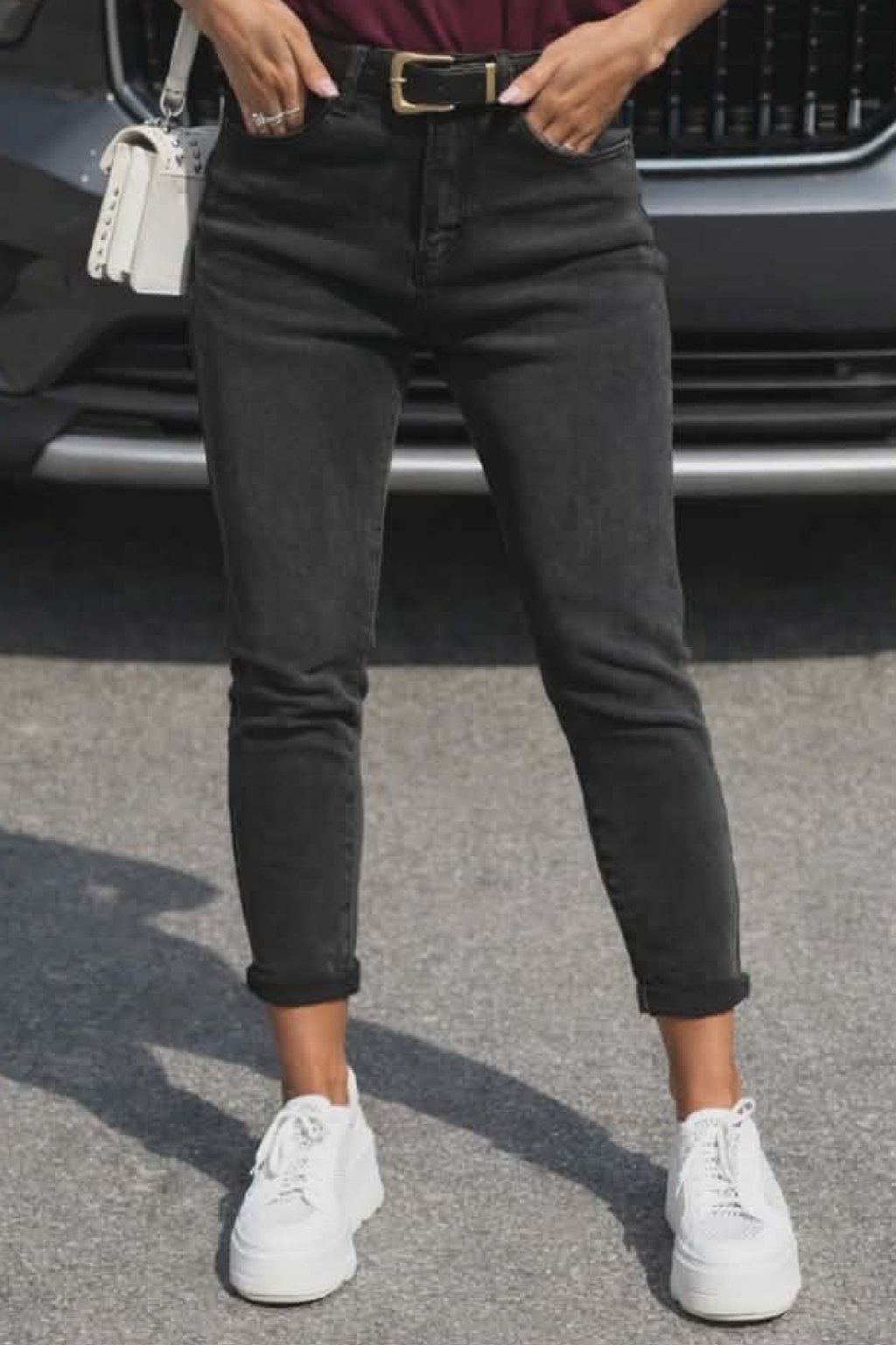 Luxusní džíny střihu mom fit v tmavě šedém provedení - místy šisované. V pase knoflík a zip. Přední a zadní kapsy. Součástí je i pásek, ale pozor je kratší - větší velikosti ho v pase nedopnou. Skvěle vypadají s ohrnutými nohavicemi. Vysoká kvalita a střih, který zaručeně sedne. Materiál je velice pružný. Vel. 2XL i 3XL focena na vel. 2XL/3XL (pas 110cm, boky 119cm), výška 165cm. Na vel. S focena menší velikost S.