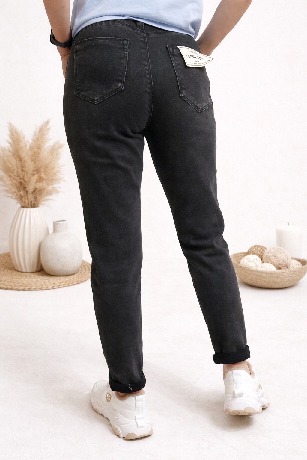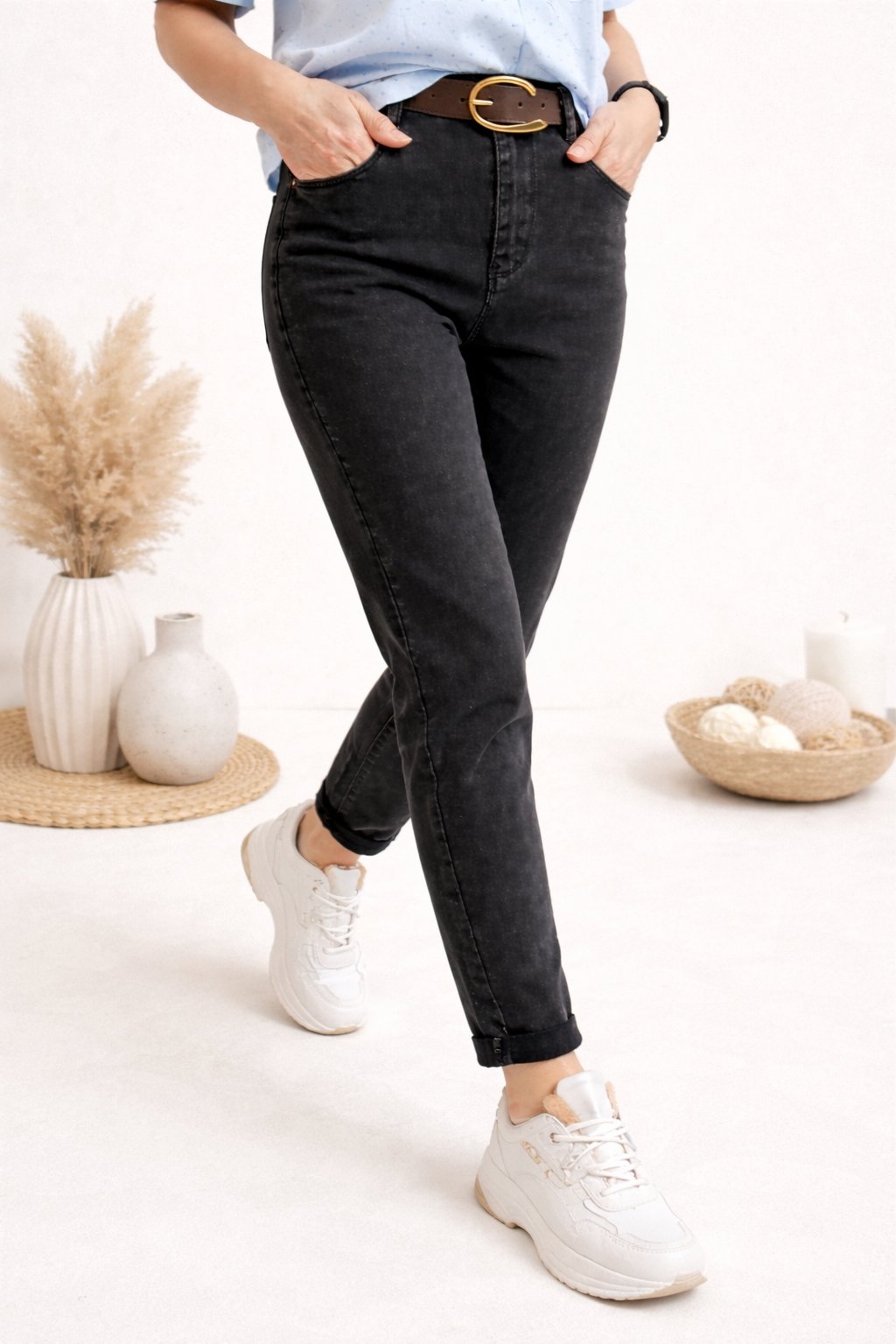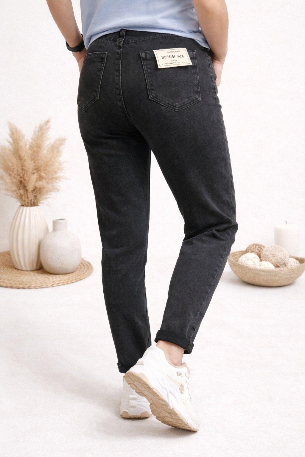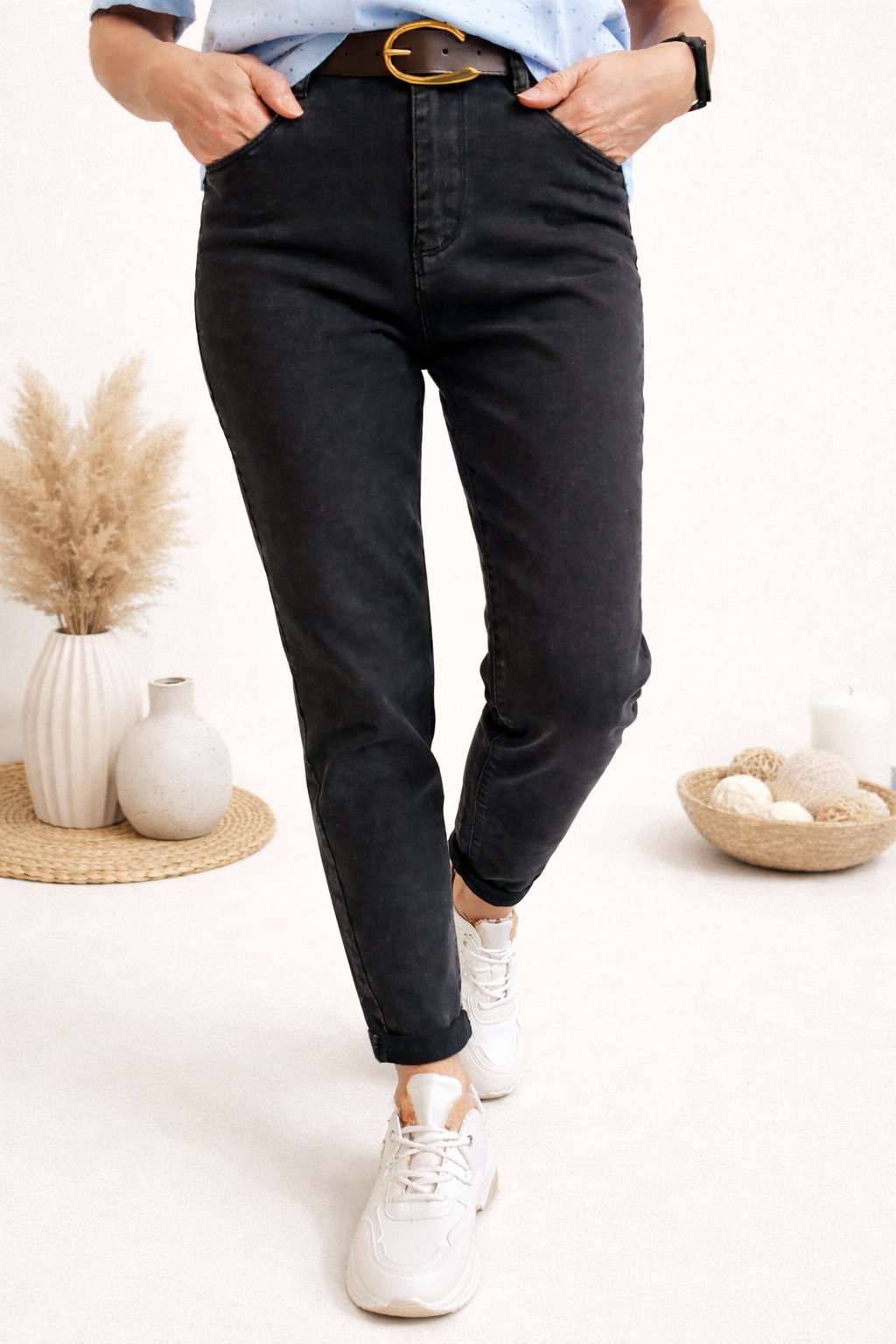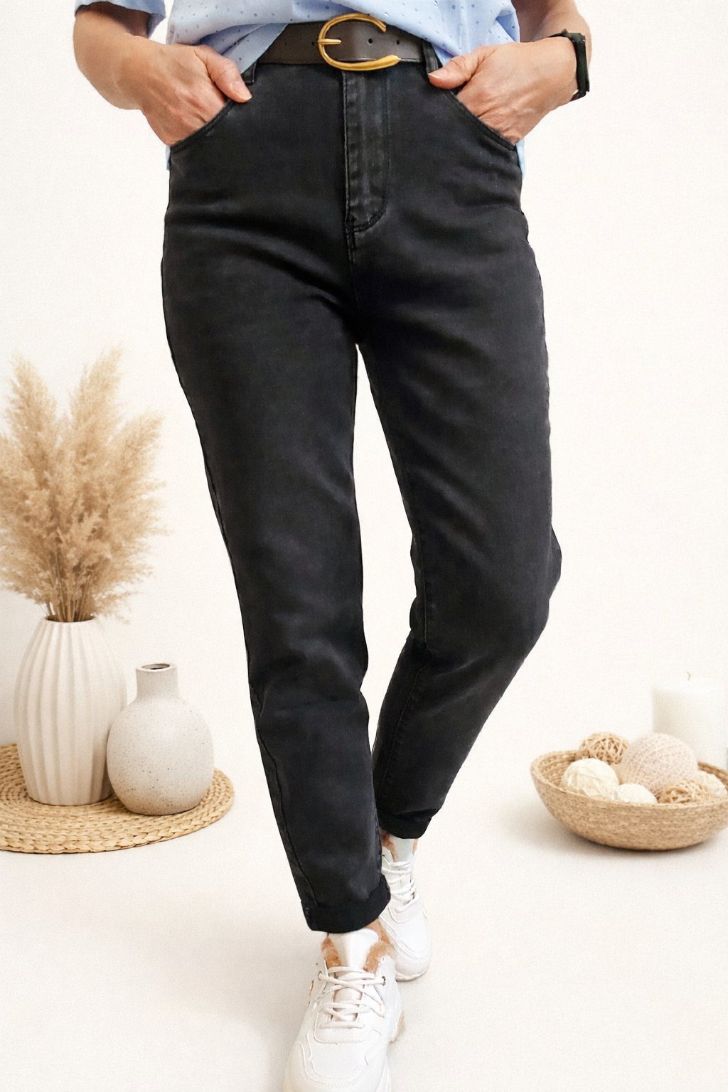 Luxusní džíny střihu mom fit černošedém provedení. V pase knoflík a zip. Přední a zadní kapsy. Součástí je i pásek . ten může být typově jiný - liší se v závislosti na dodávce. Skvěle vypadají s ohrnutými nohavicemi. Vysoká kvalita a střih, který zaručeně sedne. Materiál tzv.máslový - jemný , na těle velmi příjemný a hodně pružný. Doporučujeme brát o velikost až dvě menší než běžně nosíte. Vel. XS focena na vel XS, výška 156cm.