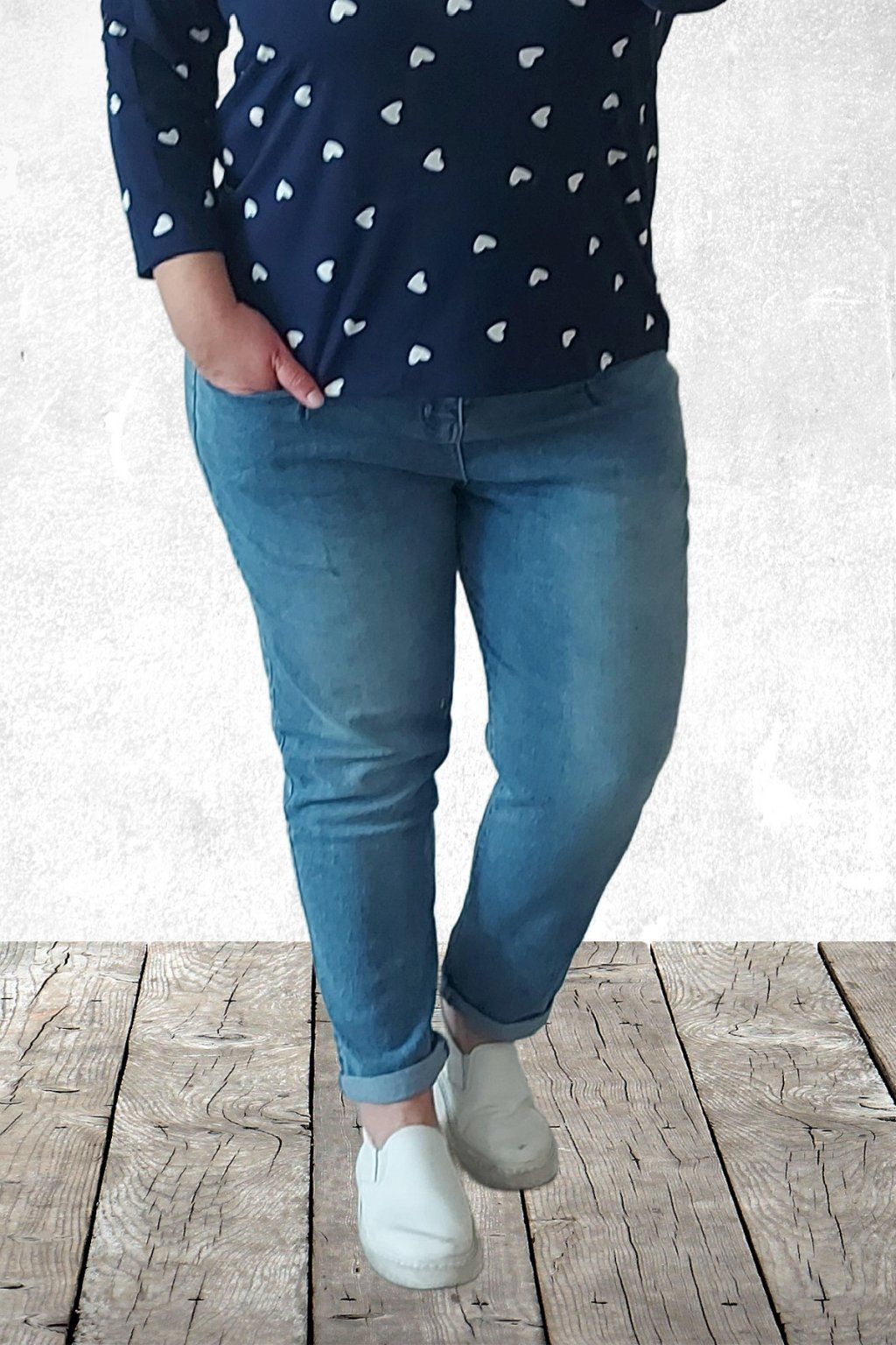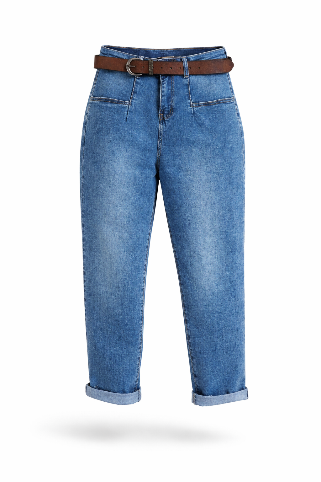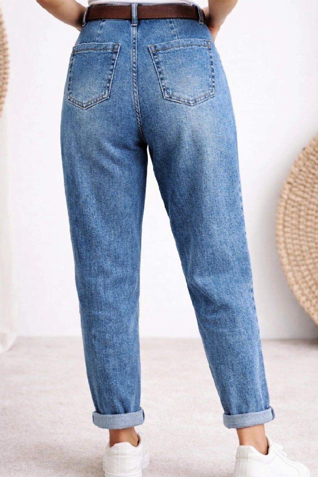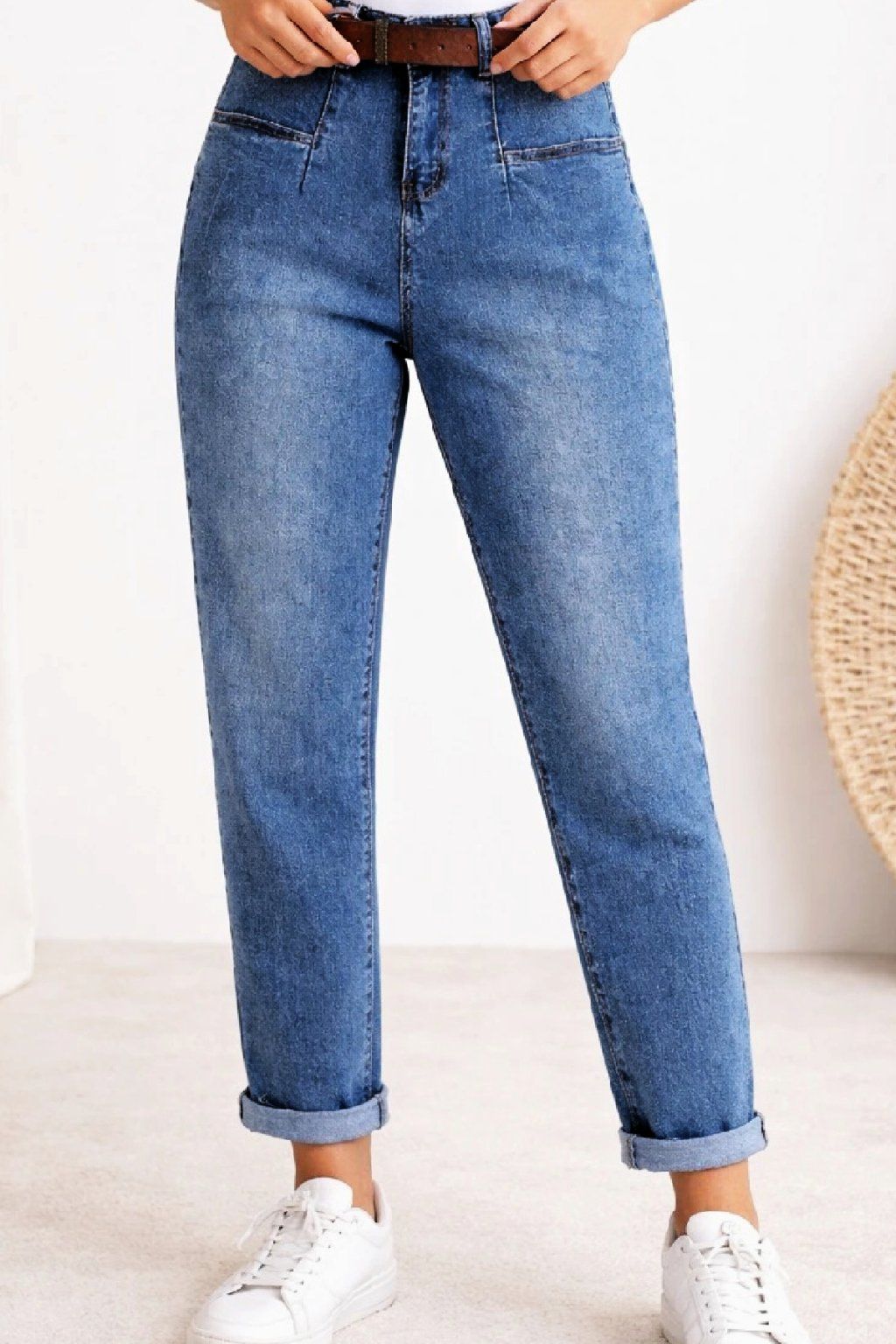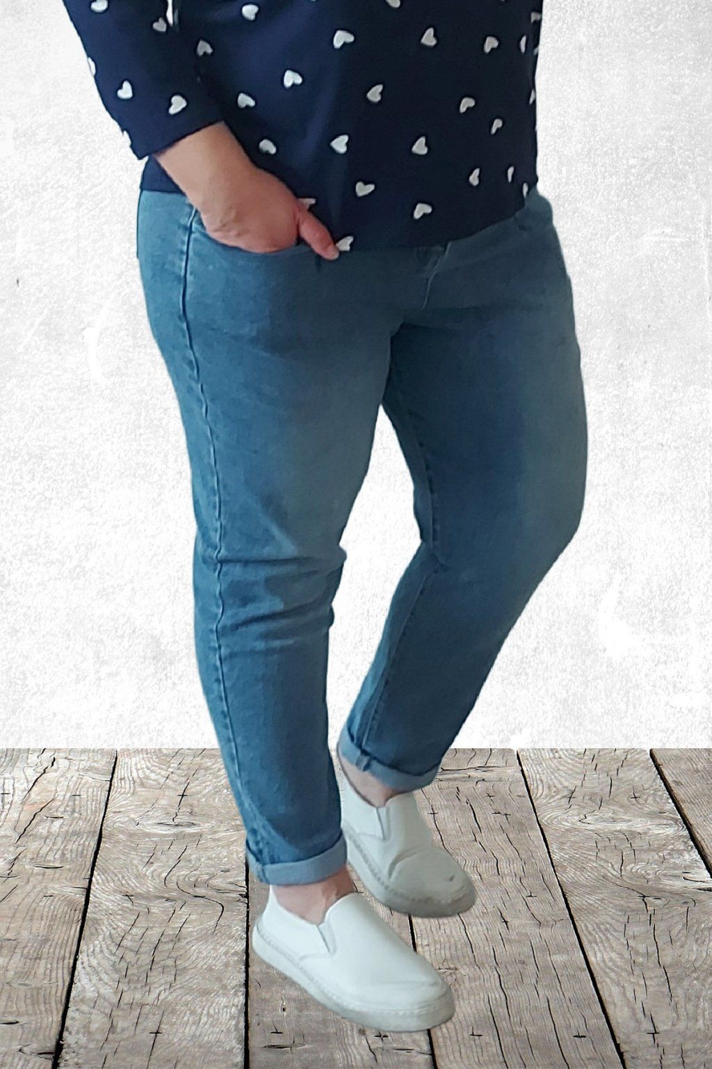Luxusní džíny s páskem v tom modrém šisovaném denimu. Jsou jedinečné díky kapsám, které jsou vpředu na nohavicích a jsou ohraničené kontrastním švem. Vzadu jsou kapsy klasické. Sed lehce vyšší. Díky mom fit střihu jsou v oblasti stehen volnější a směrem dolů se nohavice zužují. Vysoká kvalita materiálu, měkká a pružní riflovina, to je to, proč si tyto džíny oblíbíte. Vel. XL focena na vel. 2XL (pas 106cm, boky 121cm), výška 165cm.