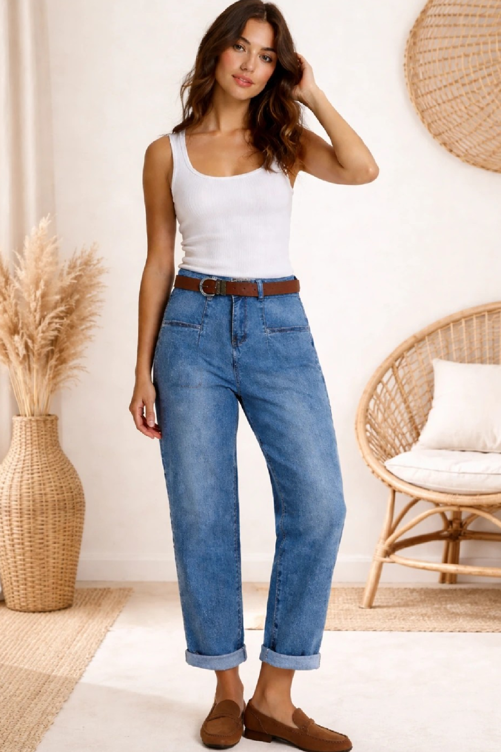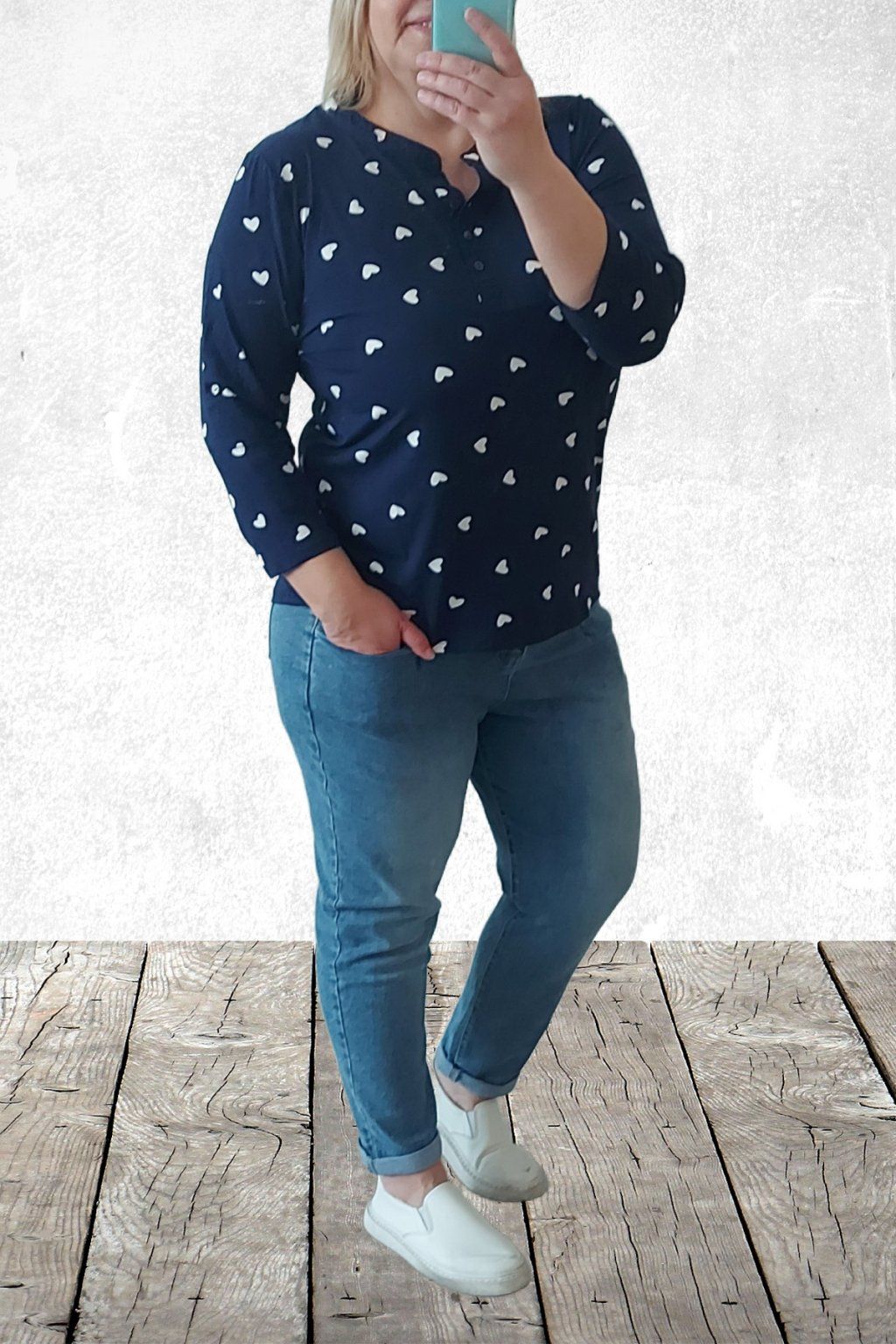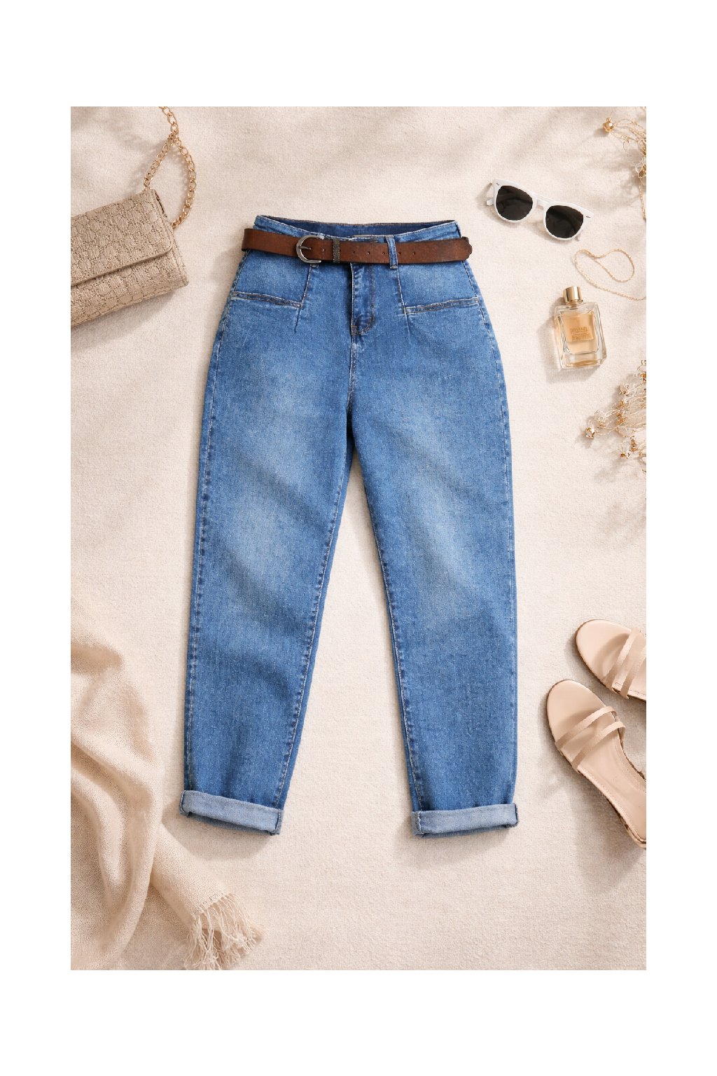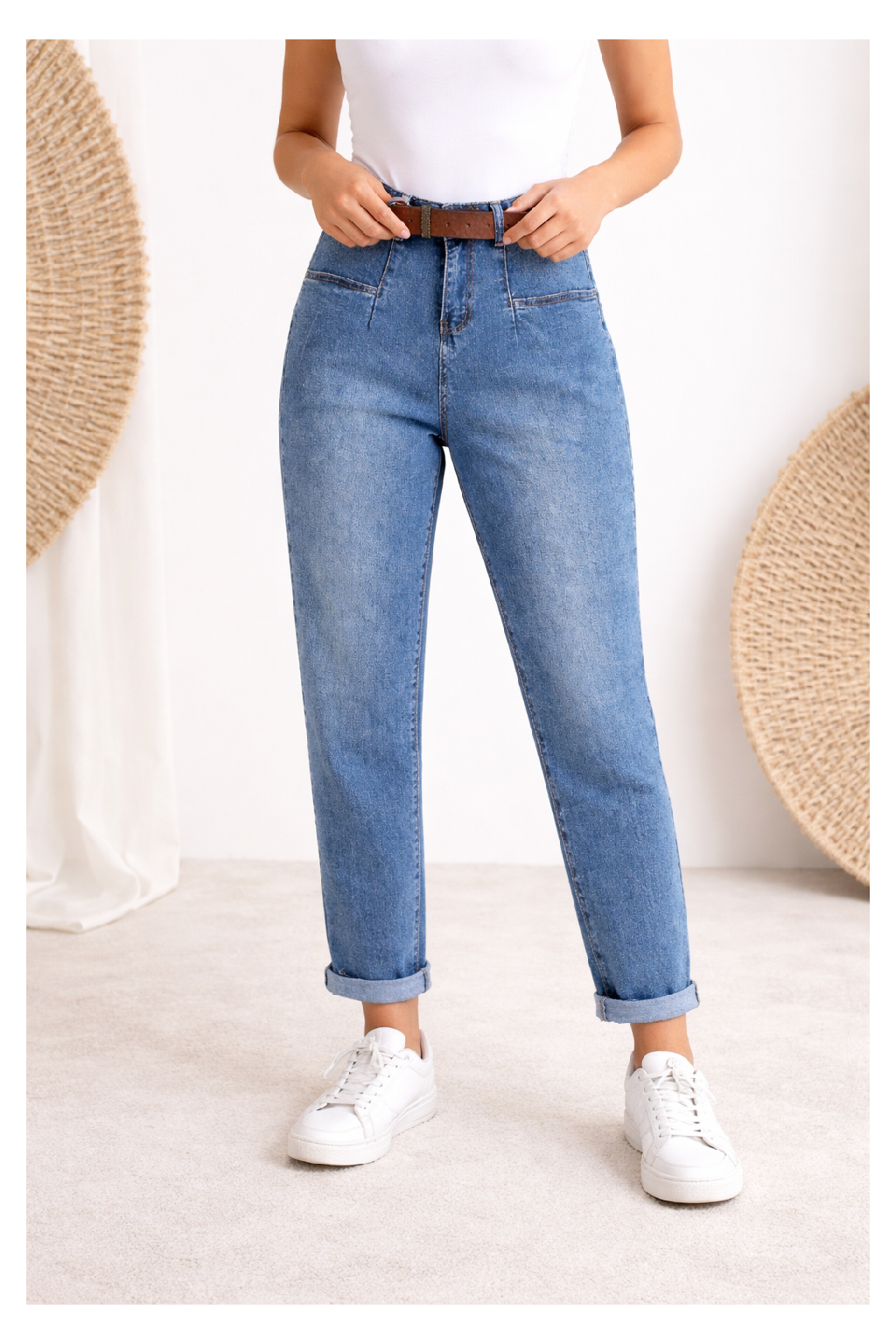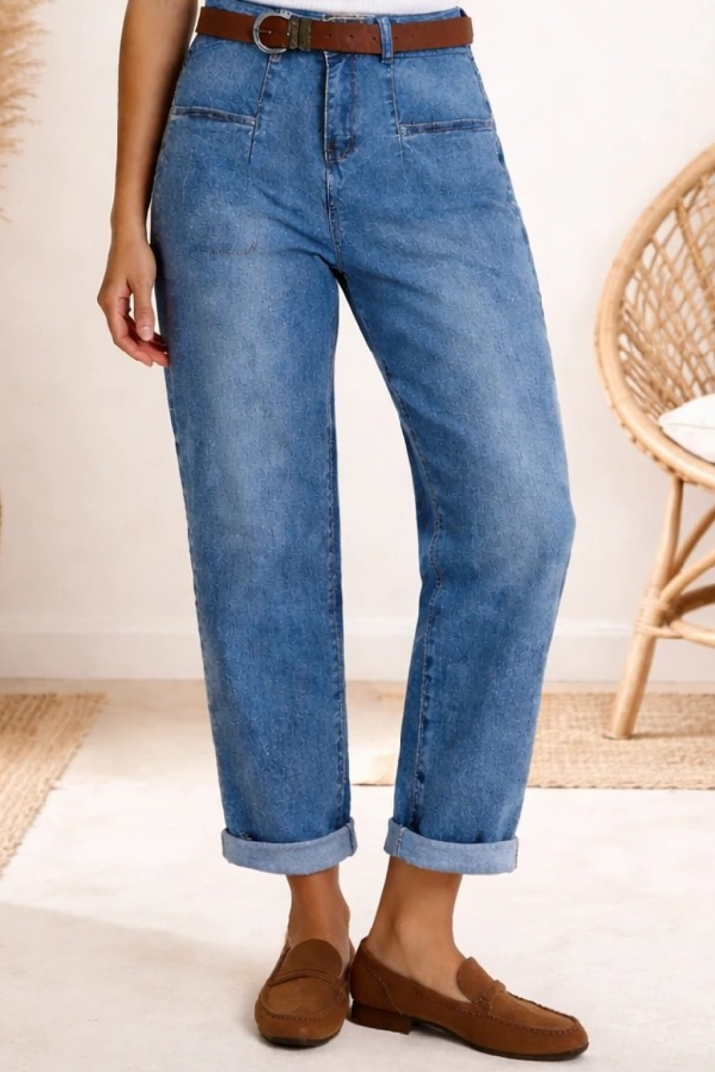 Luxusní džíny s páskem v tom modrém šisovaném denimu. Jsou jedinečné díky kapsám, které jsou vpředu na nohavicích a jsou ohraničené kontrastním švem. Vzadu jsou kapsy klasické. Sed lehce vyšší. Díky mom fit střihu jsou v oblasti stehen volnější a směrem dolů se nohavice zužují. Vysoká kvalita materiálu, měkká a pružní riflovina, to je to, proč si tyto džíny oblíbíte. Vel. XL focena na vel. 2XL (pas 106cm, boky 121cm), výška 165cm.
