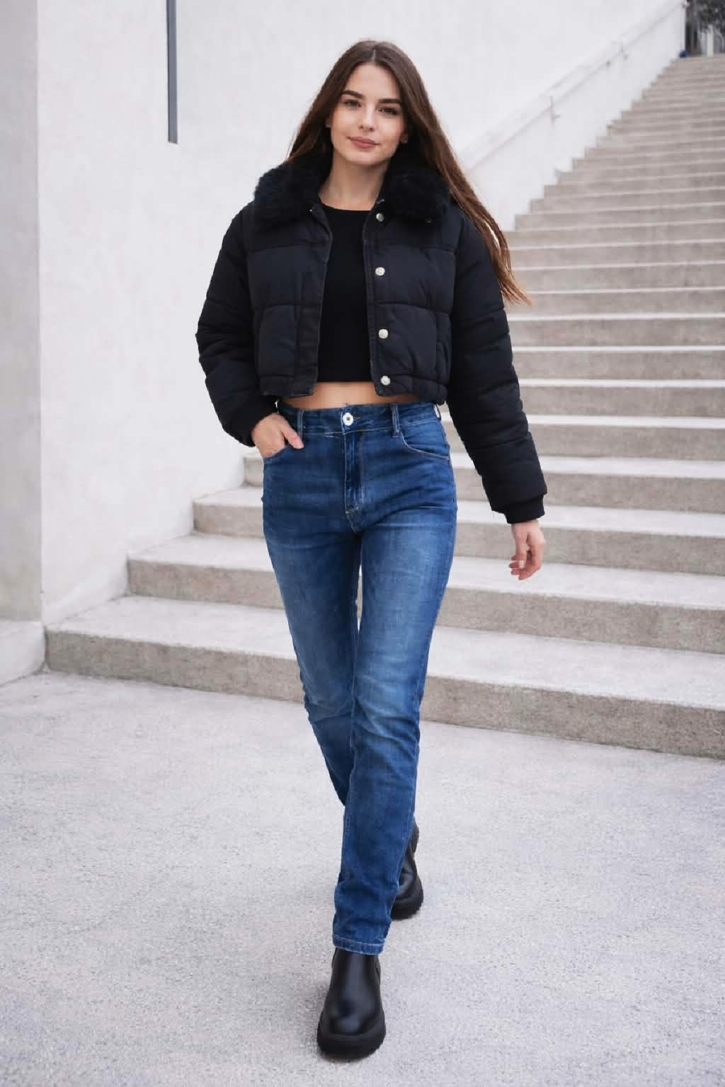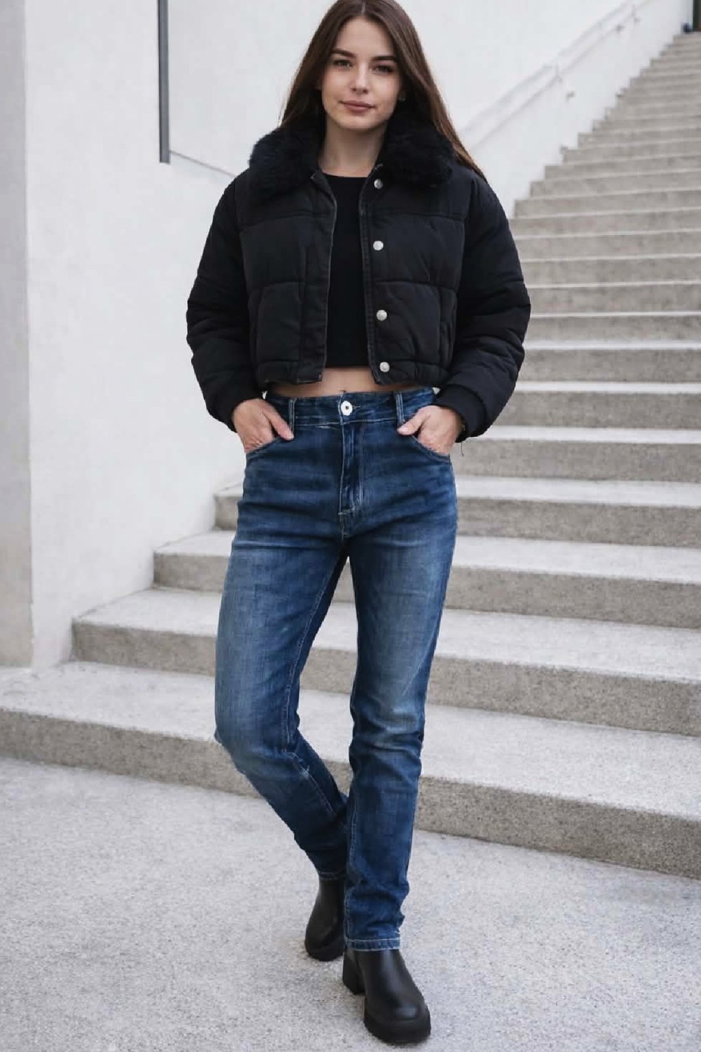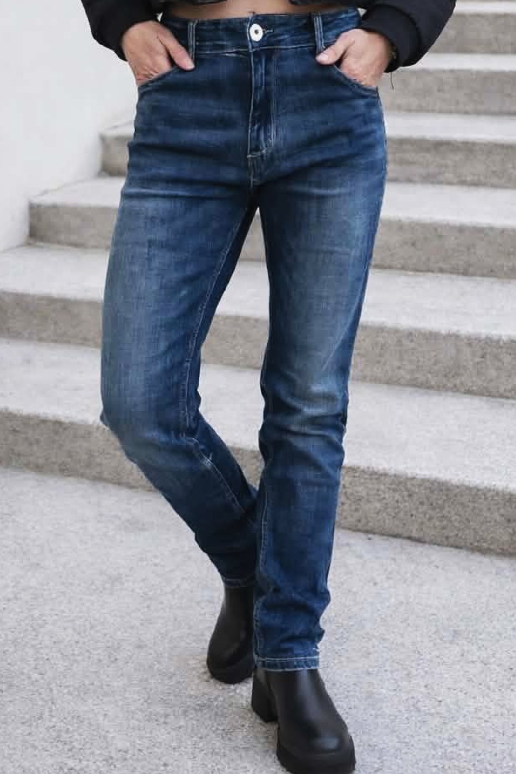 Skinny džíny v tmavě modré barvě, místy šisované. Zapínání na knoflík a zip. Pásek NENÍ součástí. Přední a zadní kapsy, sed klasický. Značka Itaimaska - pružné.