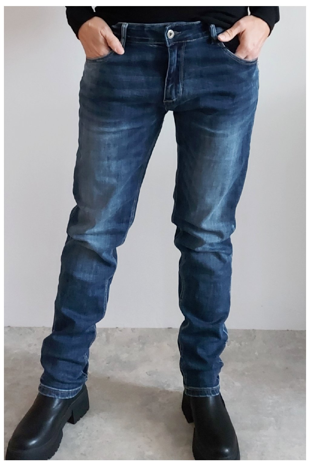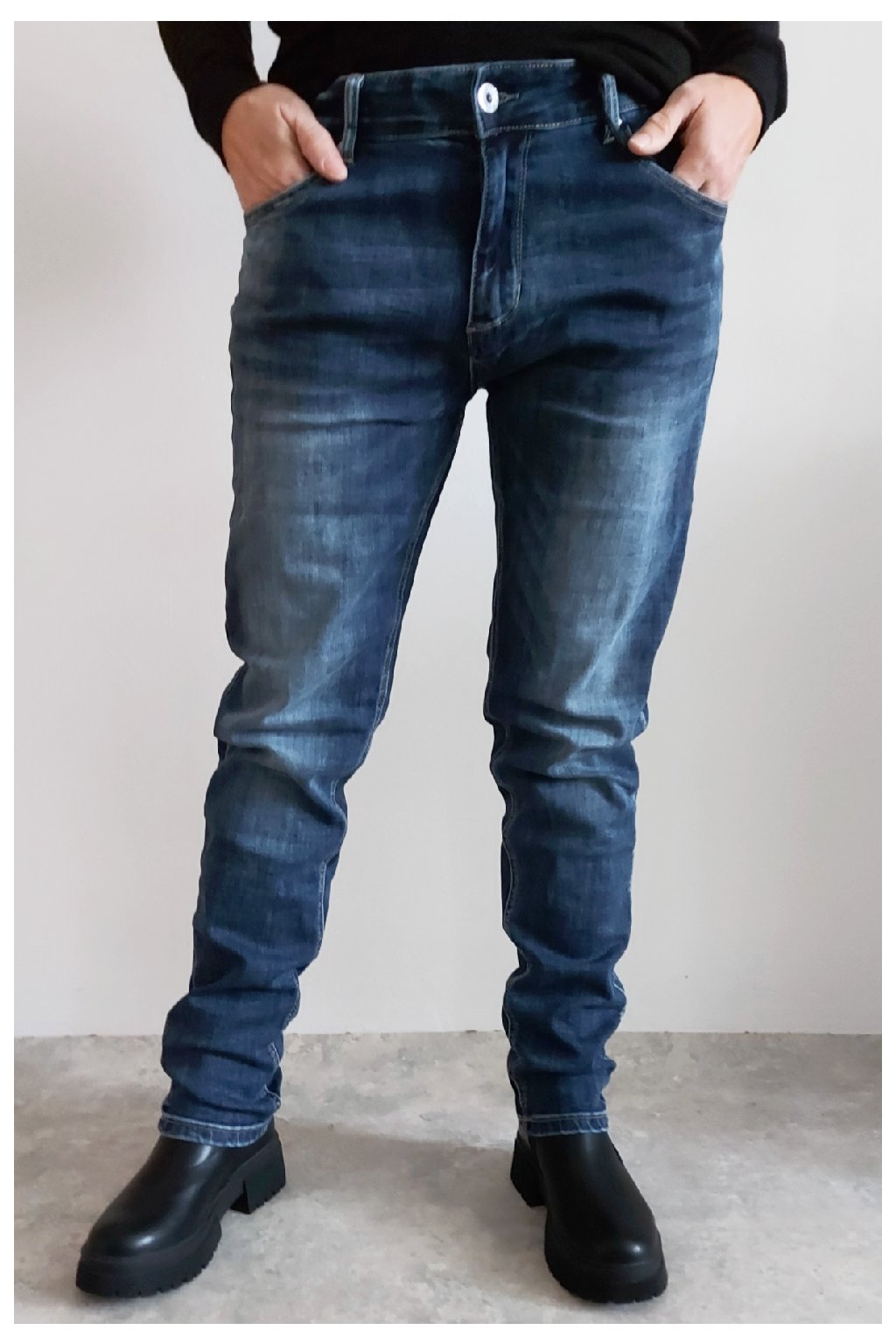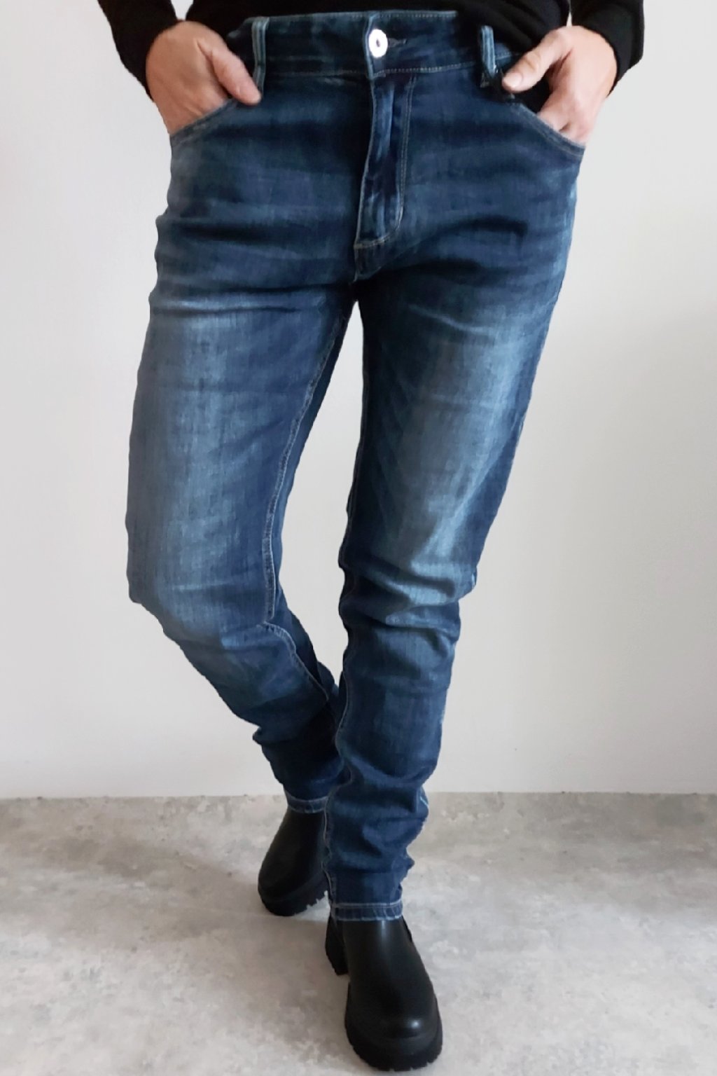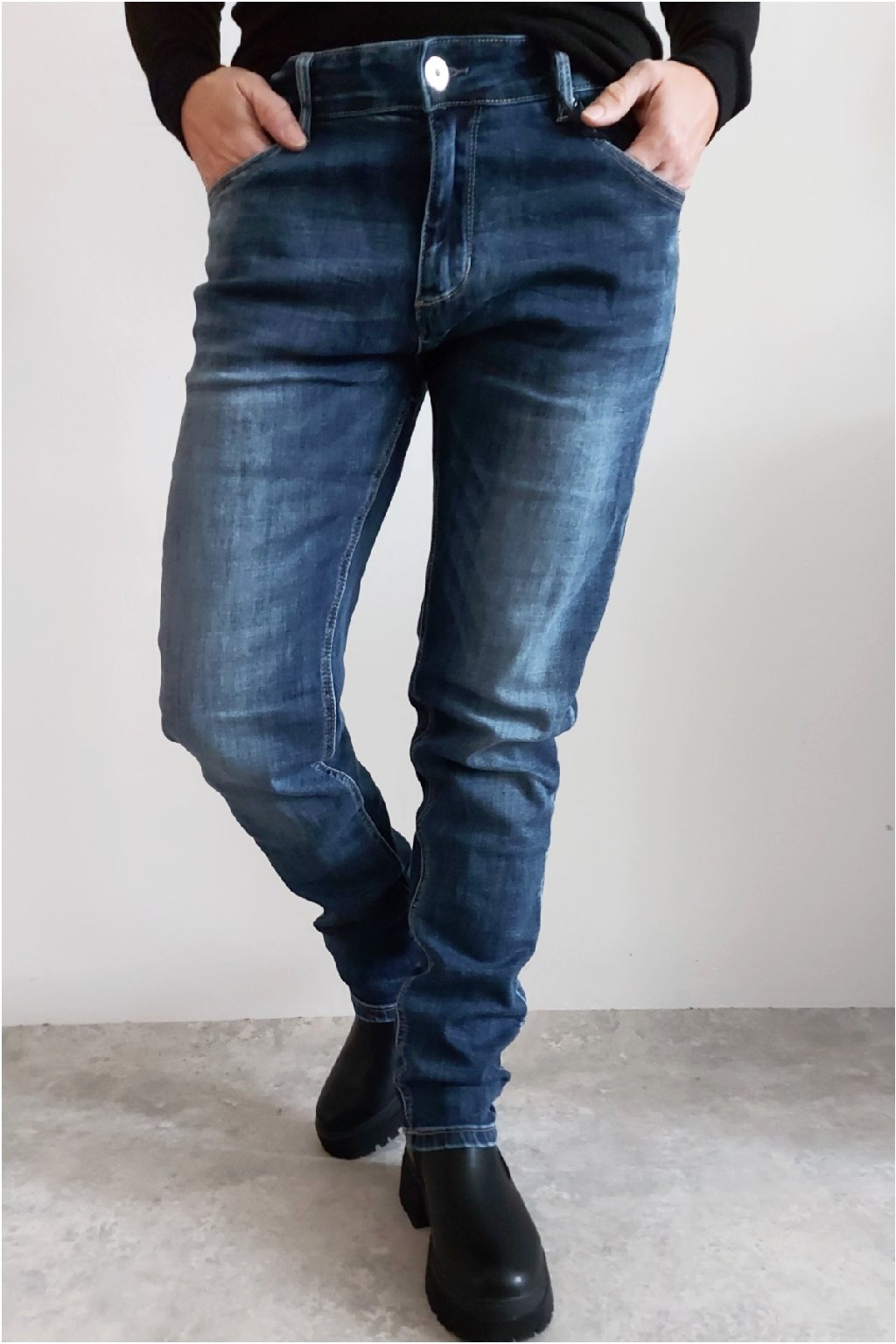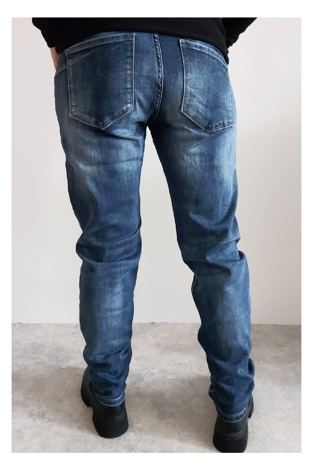 Skinny džíny v tmavě modré barvě, místy šisované. Zapínání na knoflík a zip. Pásek NENÍ součástí. Přední a zadní kapsy, sed klasický. Značka Itaimaska - pružné.