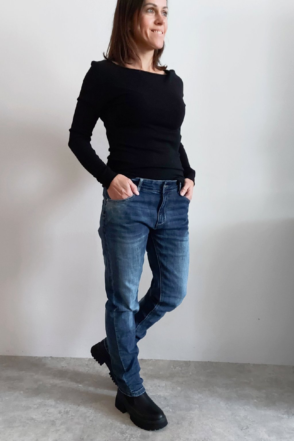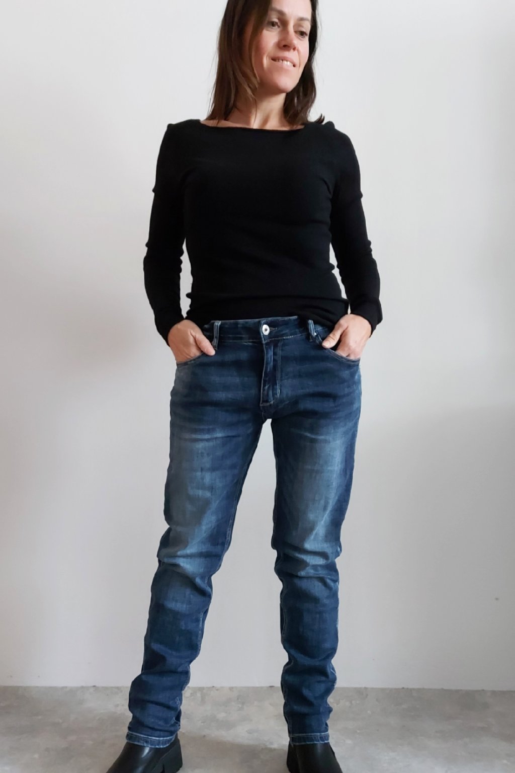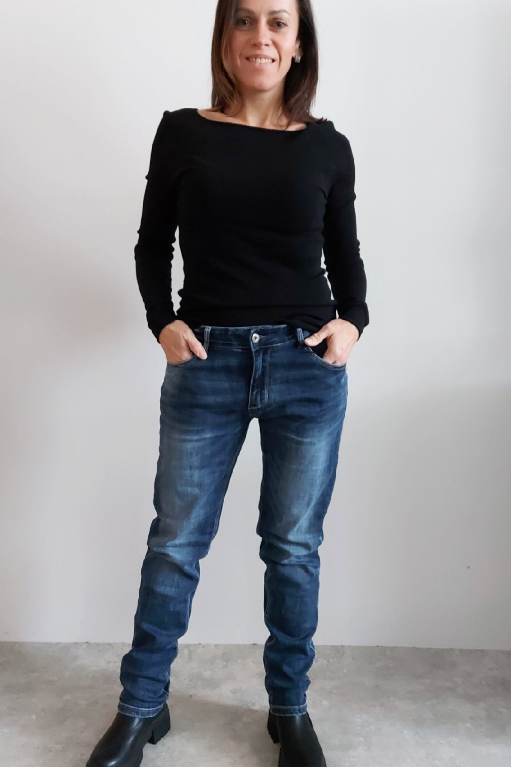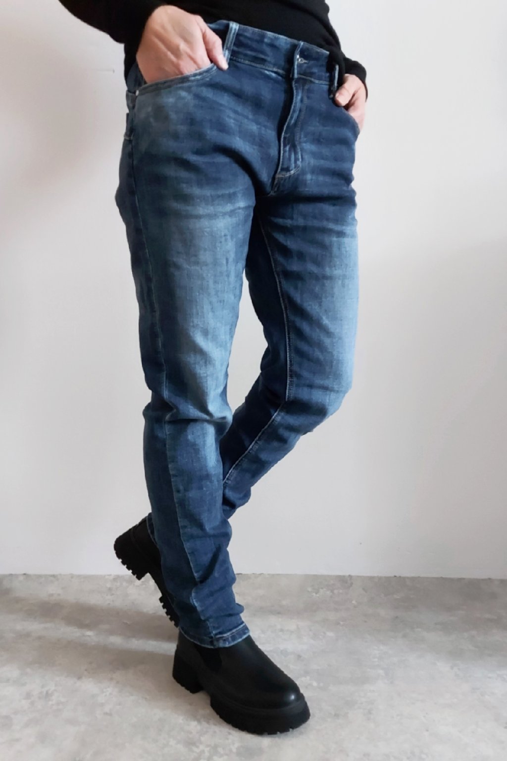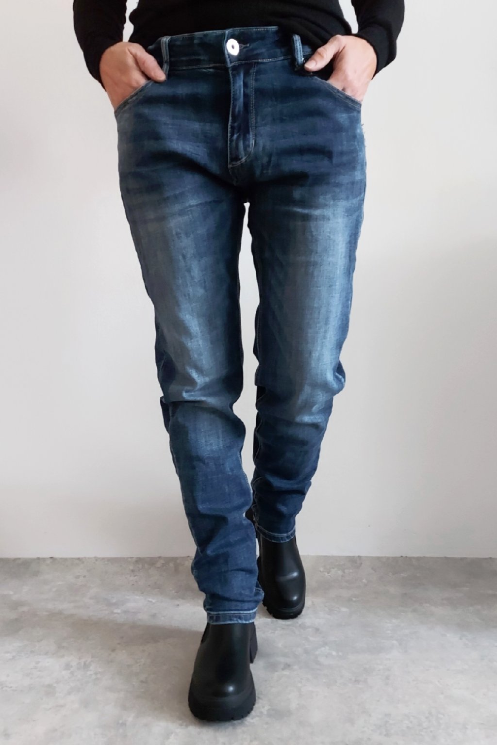 Skinny džíny v tmavě modré barvě, místy šisované. Zapínání na knoflík a zip. Pásek NENÍ součástí. Přední a zadní kapsy, sed klasický. Značka Itaimaska - pružné.