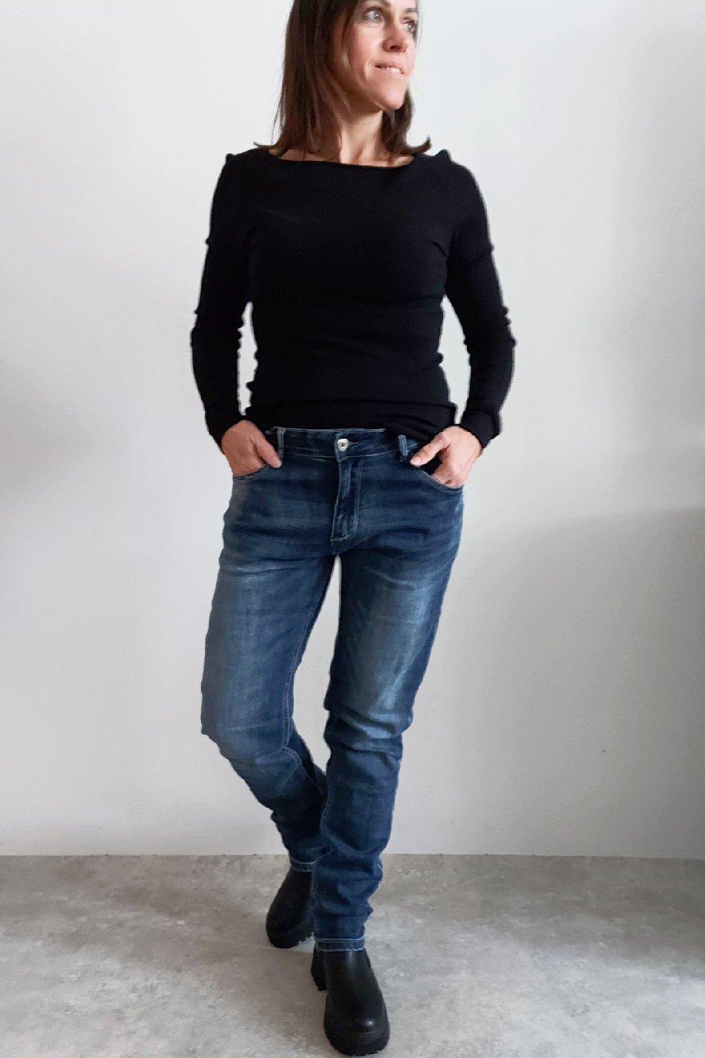 Na vel. 3XL (pas 110cm, boky 120cm), sedí vel. 50 (3XL). Džíny jsou číslované ve vel. 42 až 52 (v popisu je u každé velikosti v závorce uvedeno jakému číslu odpovídají. Vel. 46(XL) focena na vel. XS, výška 156cm.