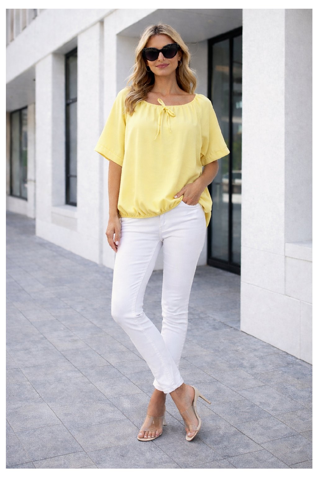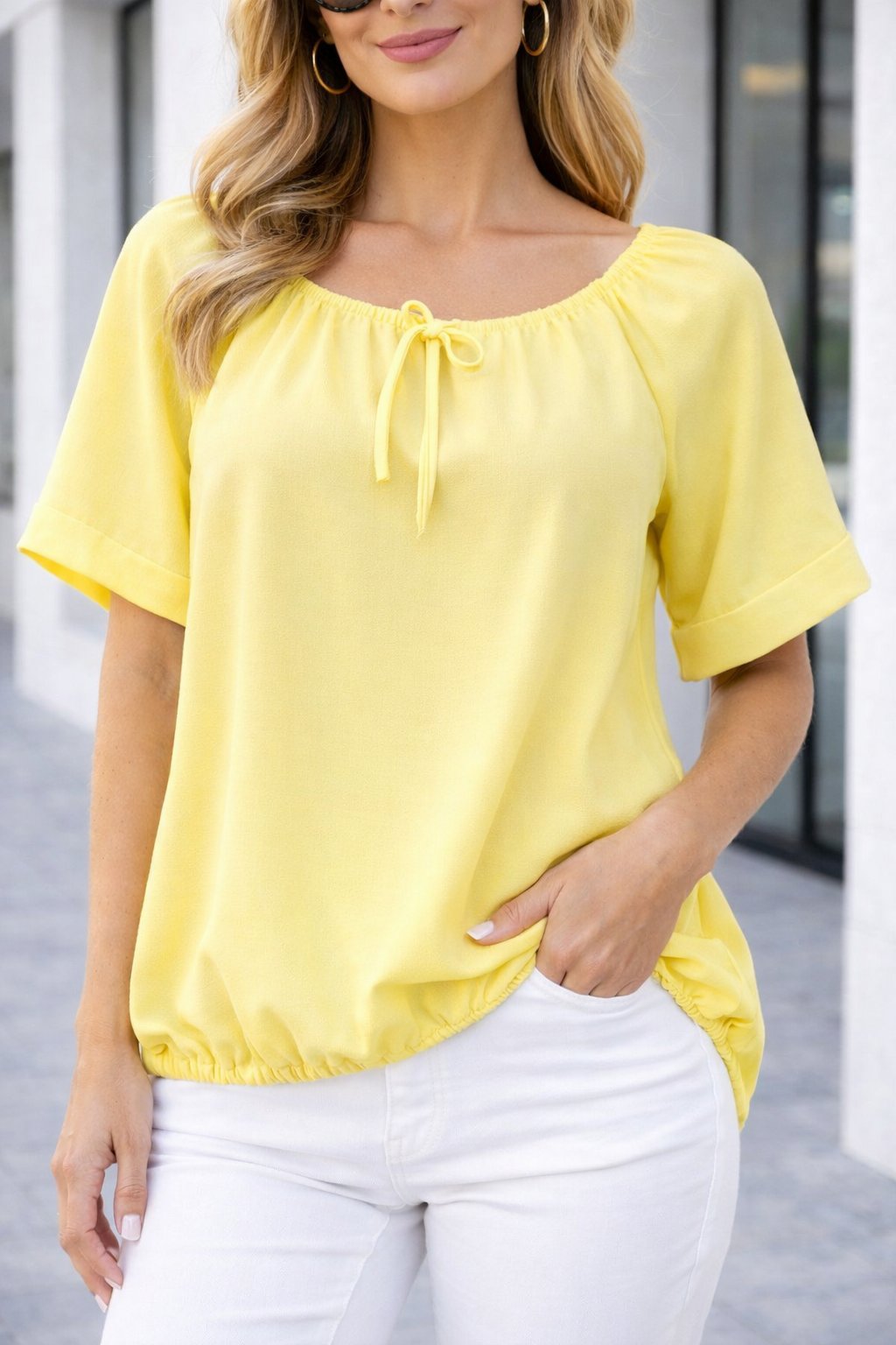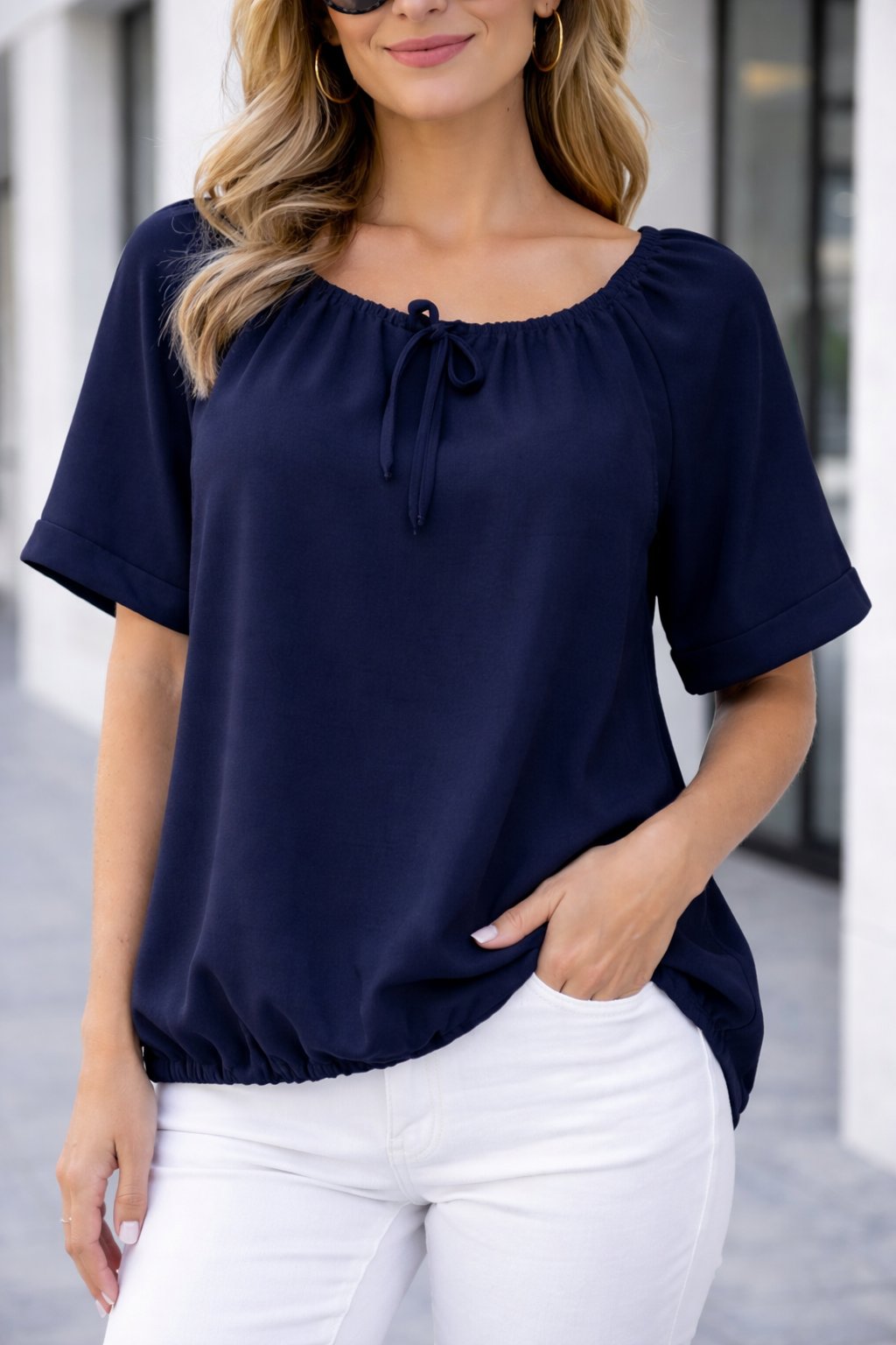 Halenka z velmi příjemného vzdušného materiálu. Ve spodní části je ukončena gumkou. Díky nařasení tak dokáže skrýt i případné nedostatky v okolí bříška. Top kousek vhodný i k slavnostnější příležitosti. Rukávy krátké. Vpředu ve výstřihu našitá ozdobná mašlička.