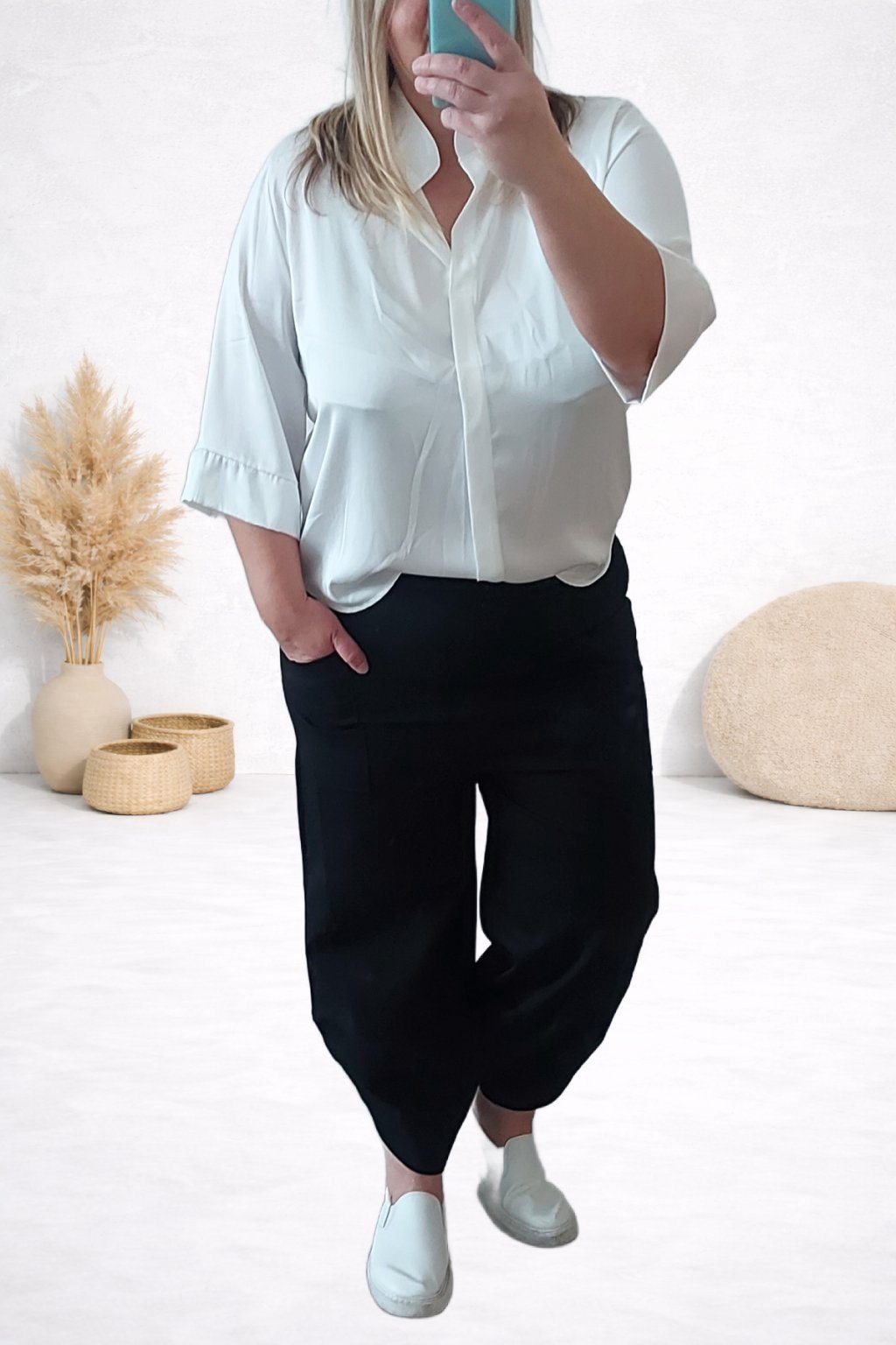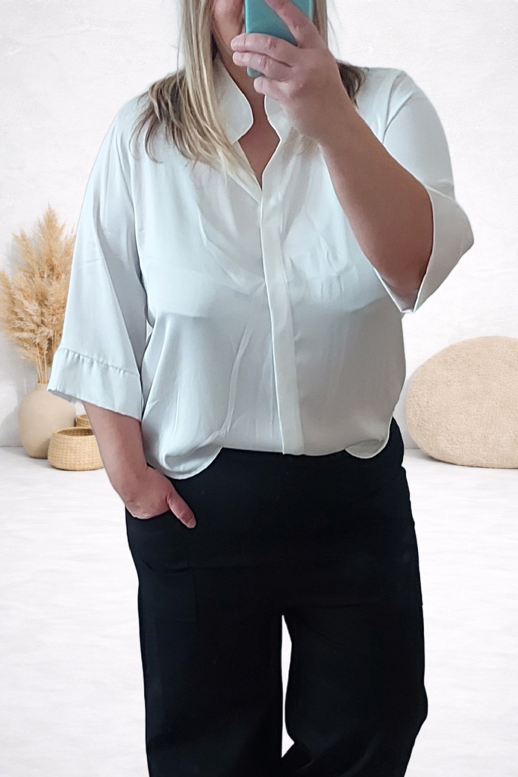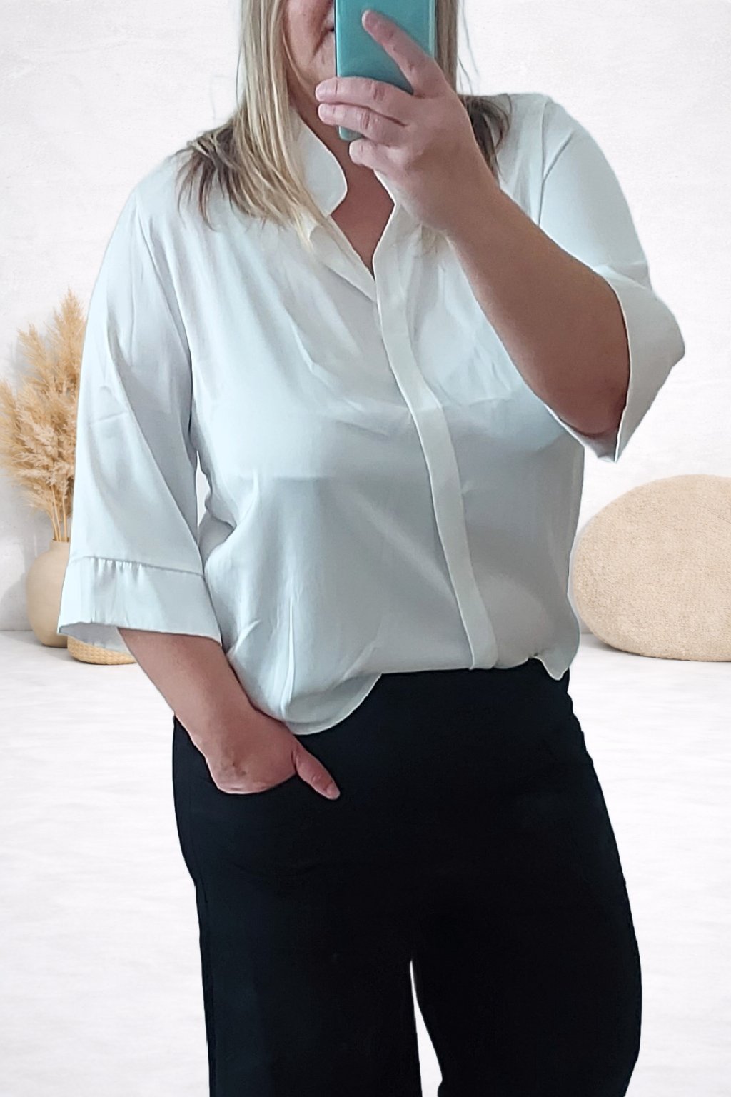 Halenka s véčkovým výstřihem a stojáčkem. Saténový materiál, není elastický. Lehoučká, vzdušná, vhodná i pro slavnostní příležitos. Rukávy jsou 3/4, široké, ukončené širší manžetou. Zadní strana je maličko delší. Bez zapínání, vpředu po celé délce ozdobný lem ze zdvojené látky. Foceno na vel. S i na vel. 2XL (prsa 116cm, boky 120cm).