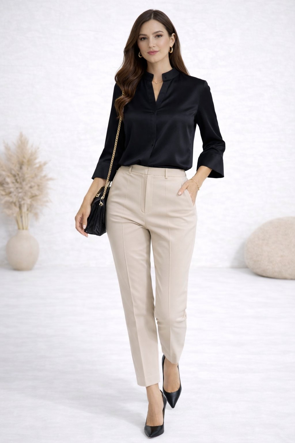 Elegantní saténová halenka s véčkovým výstřihem a 3/4 rukávem
