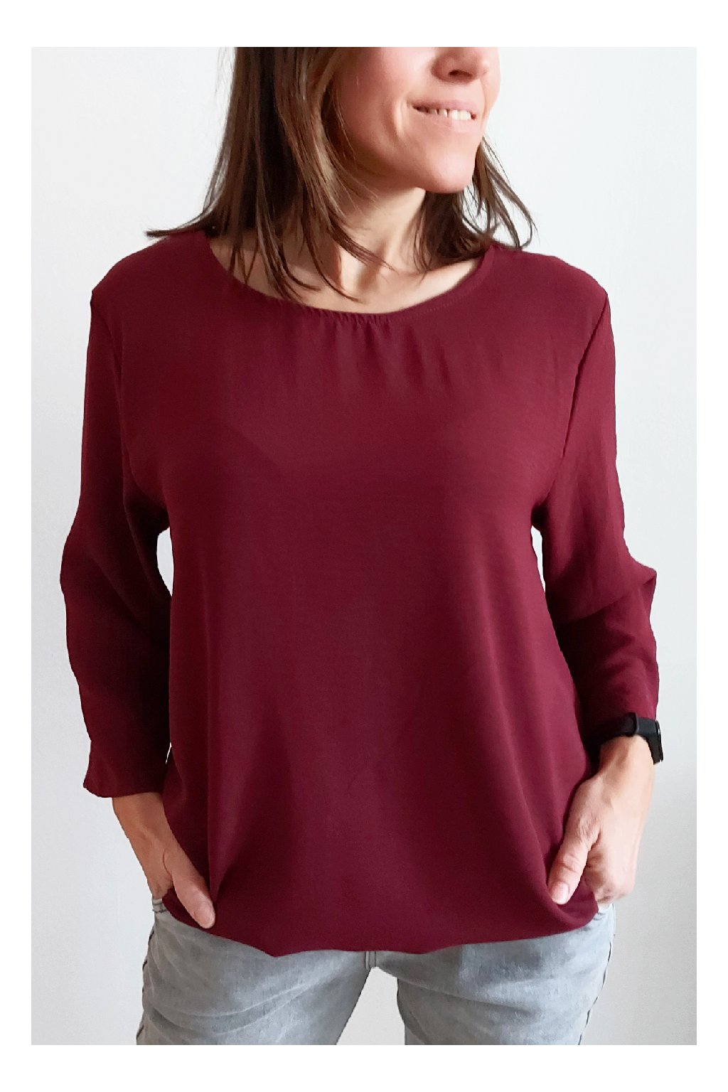 Halenka z velmi příjemného vzdušného materiálu. Ve spodní části je ukončena gumkou. POZOR - rukávy jsou, u dodávky 2025, 3/4 a bez gumky - nová kolekce je řešena jinak.. Díky nařasení tak dokáže skrýt i případné nedostatky v okolí bříška. Top kousek vhodný i k slavnostnější příležitosti. Foceno na vel. XS i na vel. 2XL (focen loňský model s dlouhými rukávy s gumkou).