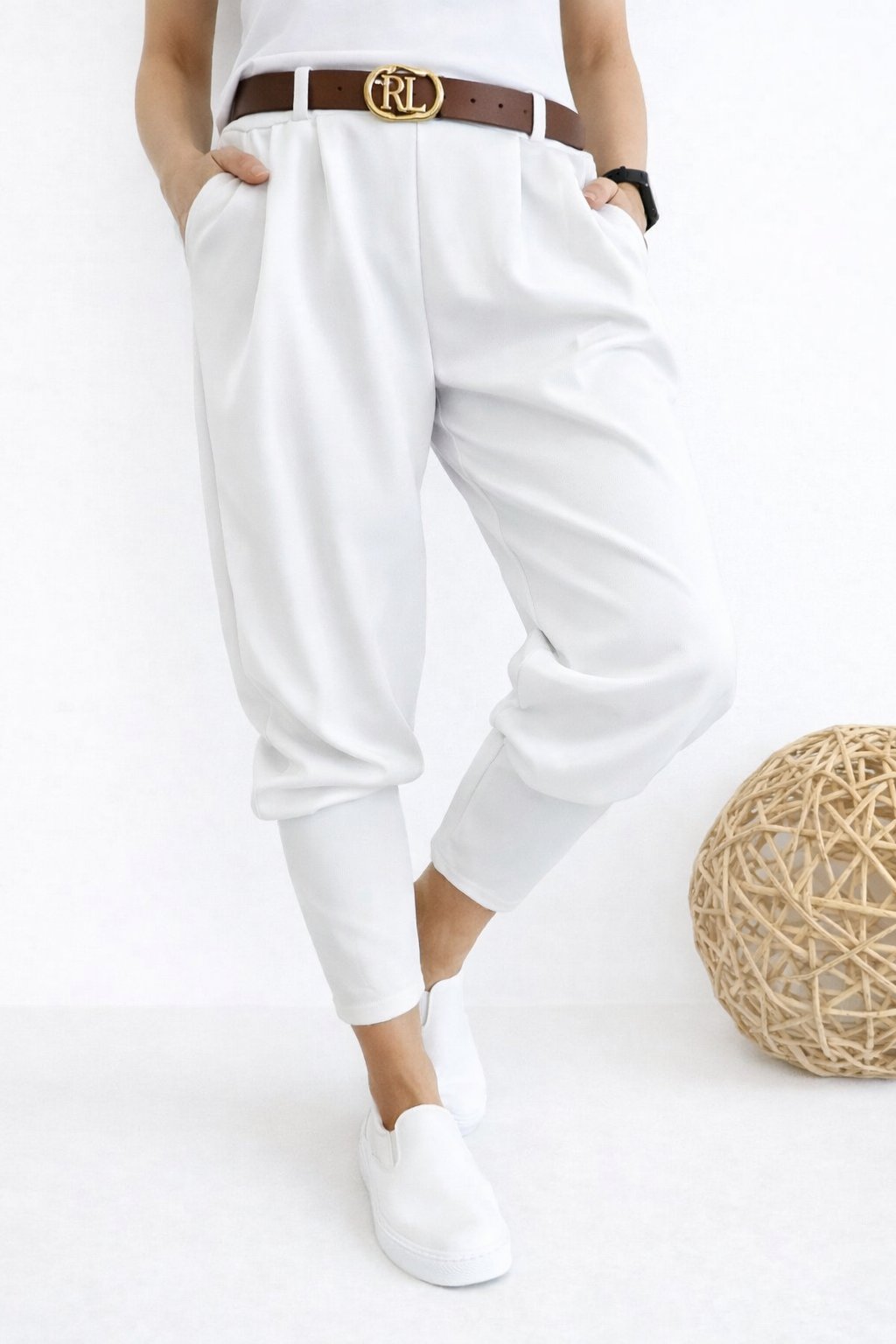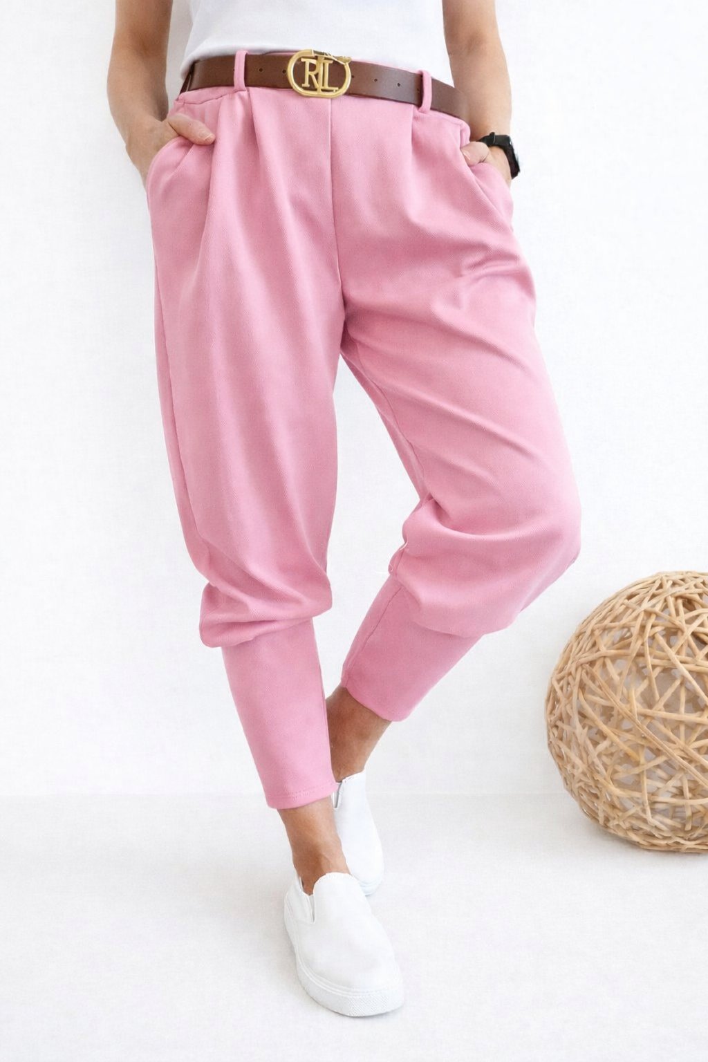 Skvělé kalhoty s širokými manžetami na konci nohavic. Pásek je součástí - spona se liší. V pase do gumy. Přední kapsy, vzadu bez kapes. Materiál silnější, pružný. Foceno na vel. XS, výška 156cm.