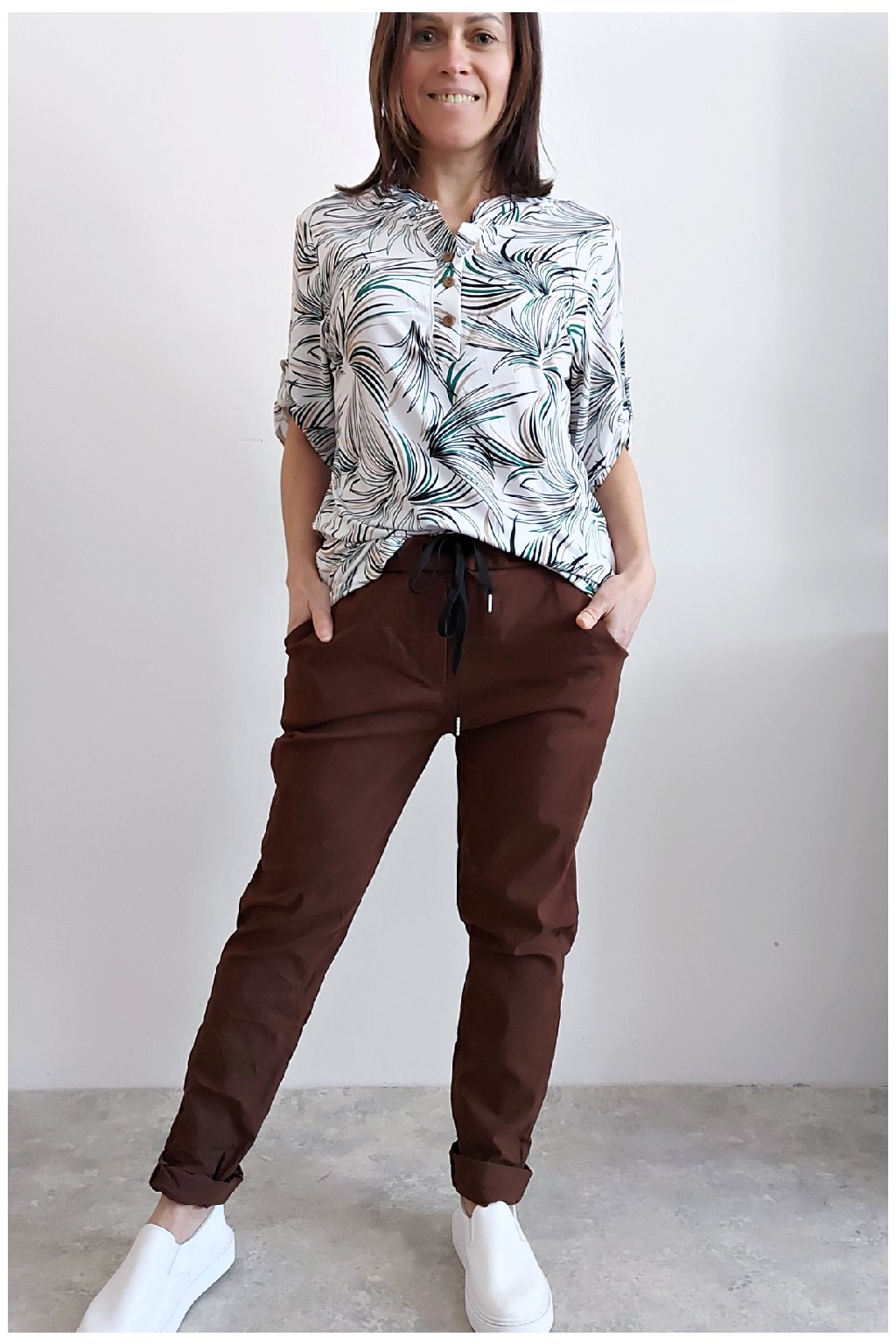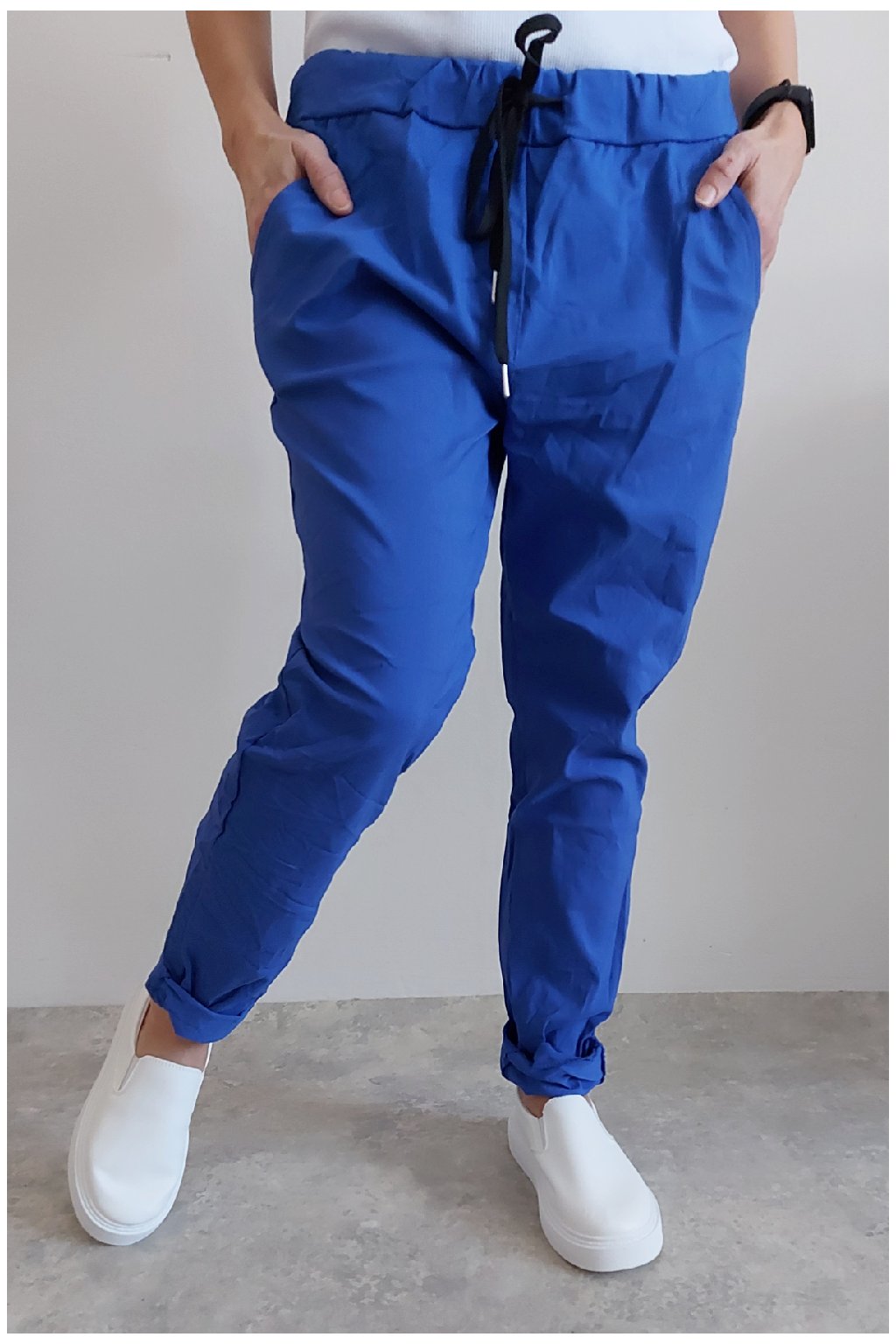 Super strečové, plátěné kalhoty v pase do gumy a šňůrky na stažení obvodu. Boční kapsy, vzadu bez kapes. Foceno na vel. XS, výška 156cm i na vel. 446pas 108cm, boky 119cm).