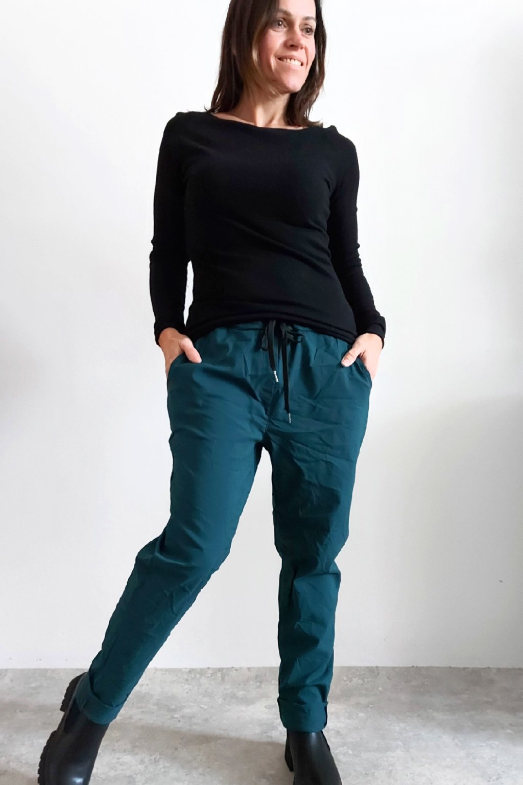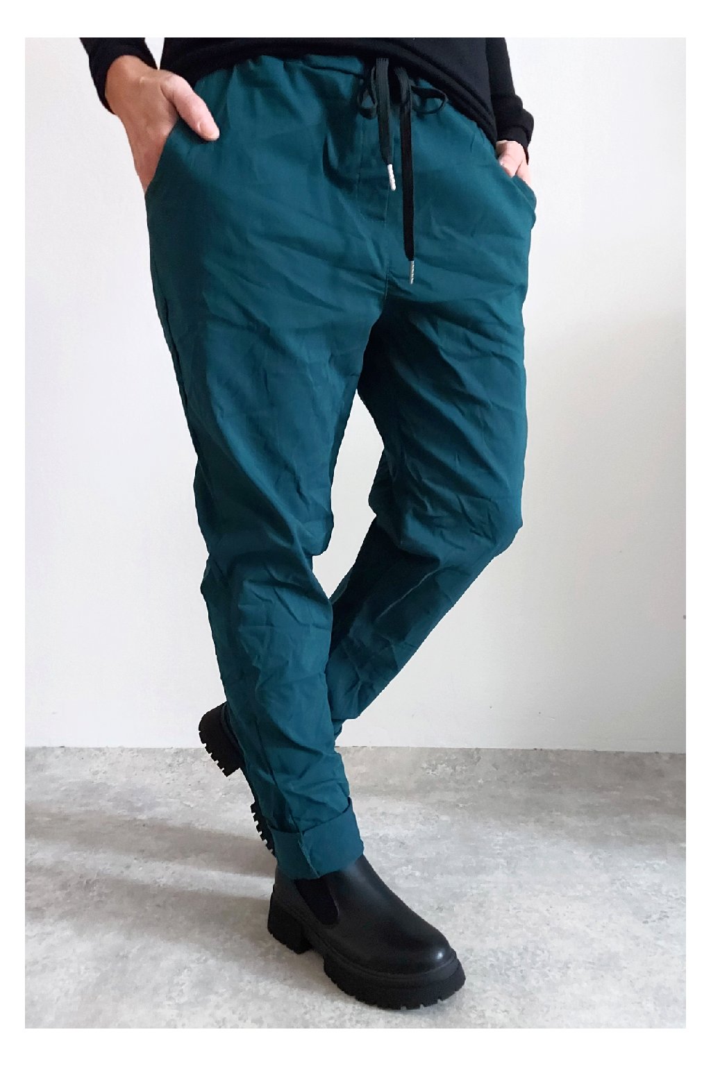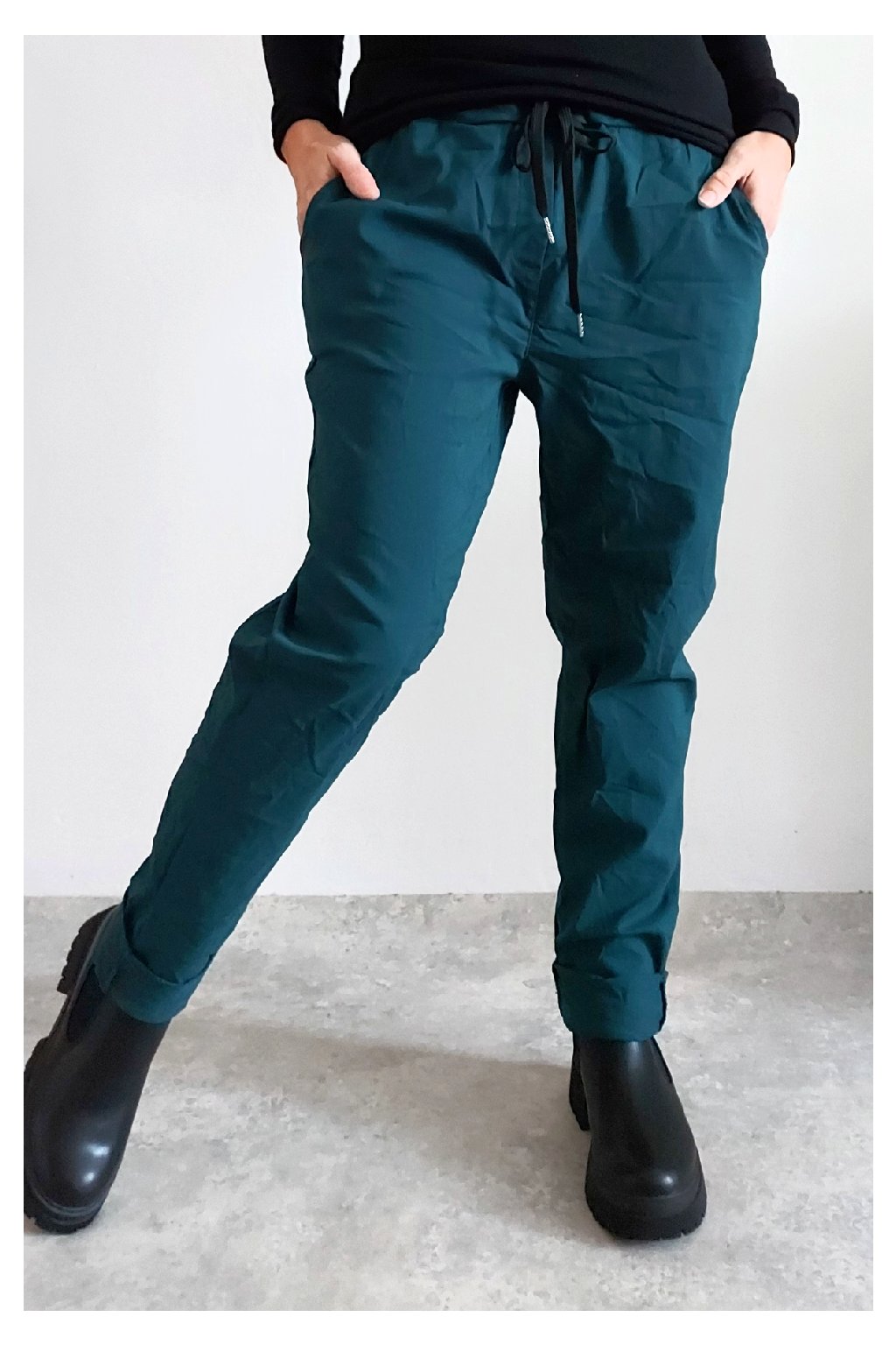 Super strečové, plátěné kalhoty v pase do gumy a šňůrky na stažení obvodu. Boční kapsy, vzadu bez kapes. Foceno na vel. XS, výška 156cm i na vel. 446pas 108cm, boky 119cm).