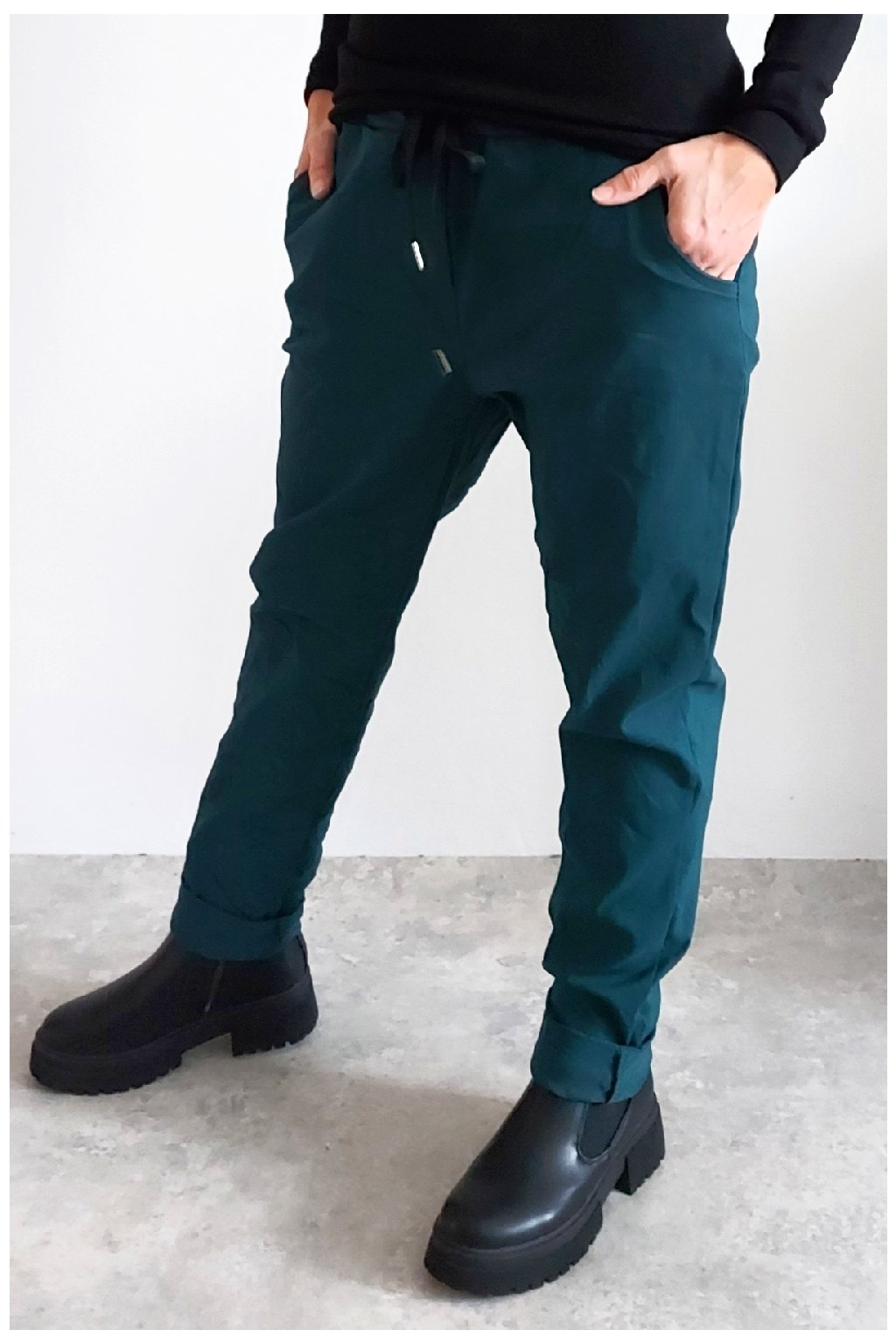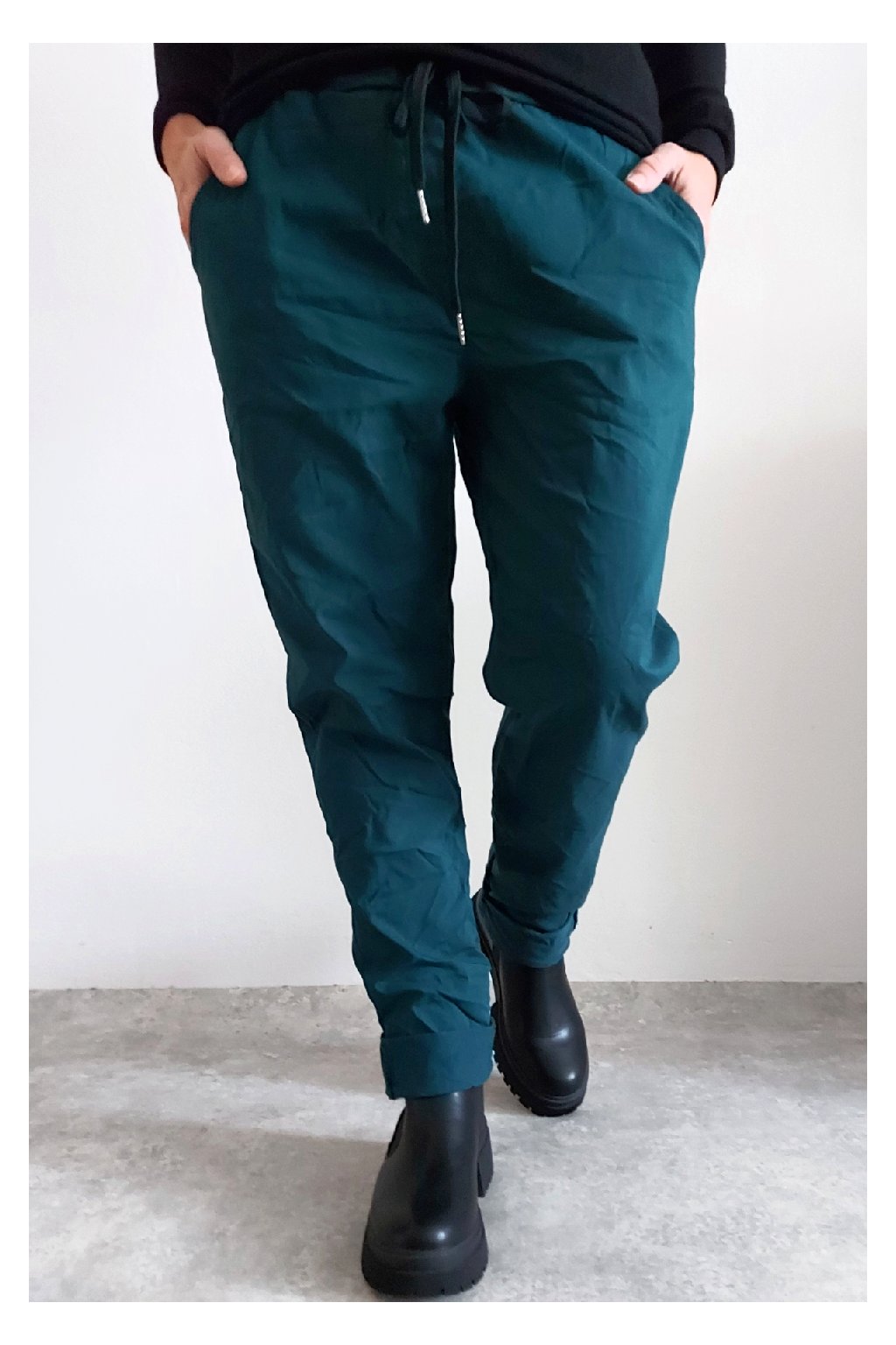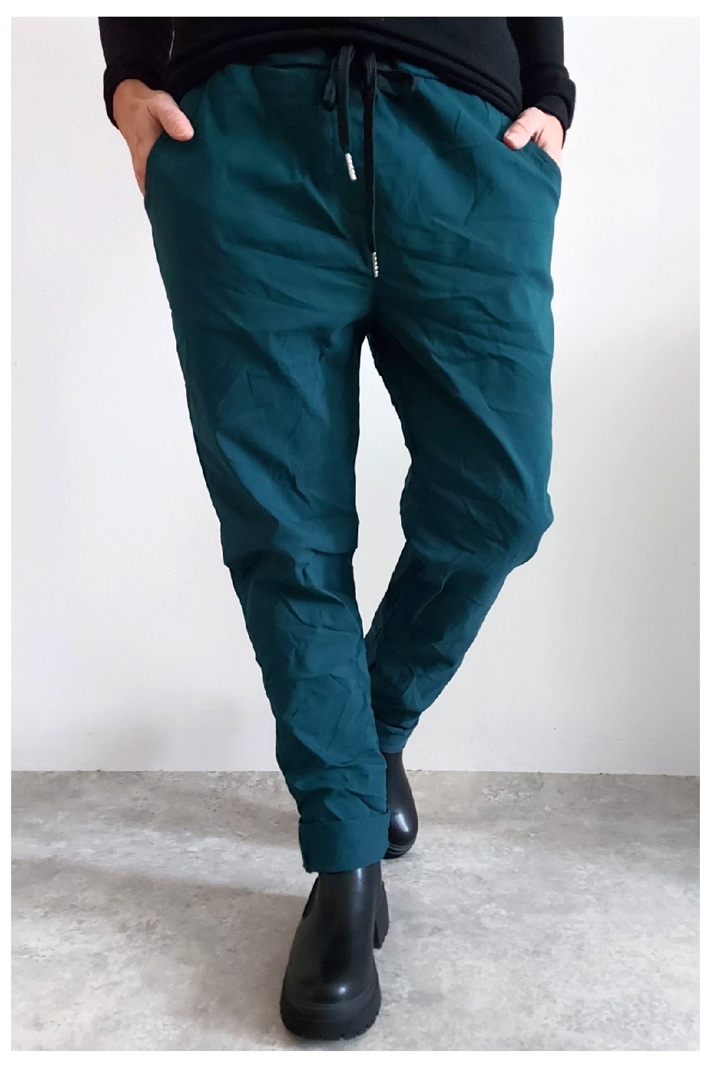 Super strečové, plátěné kalhoty v pase do gumy a šňůrky na stažení obvodu. Boční kapsy, vzadu bez kapes. Foceno na vel. XS, výška 156cm i na vel. 446pas 108cm, boky 119cm).
