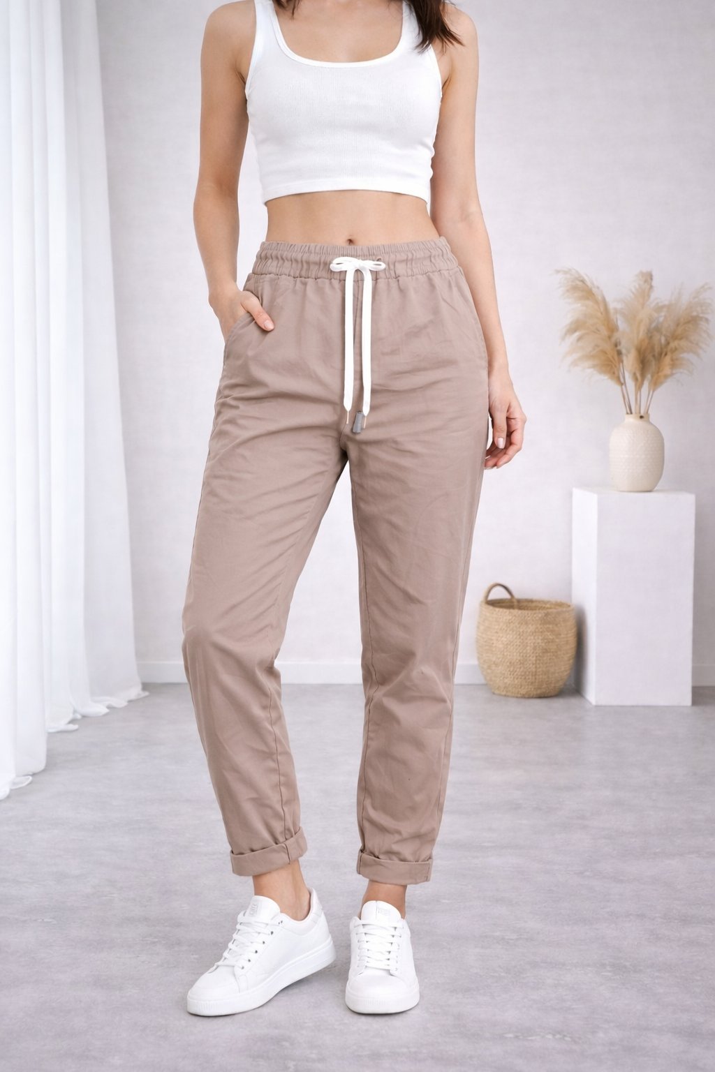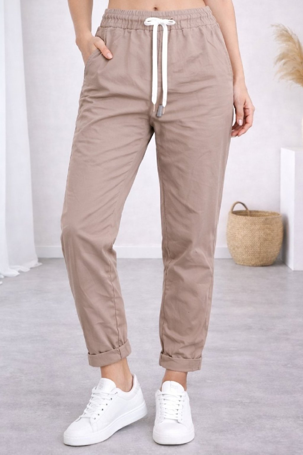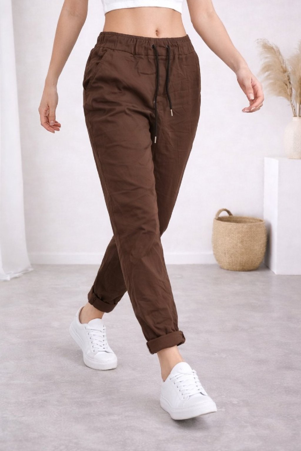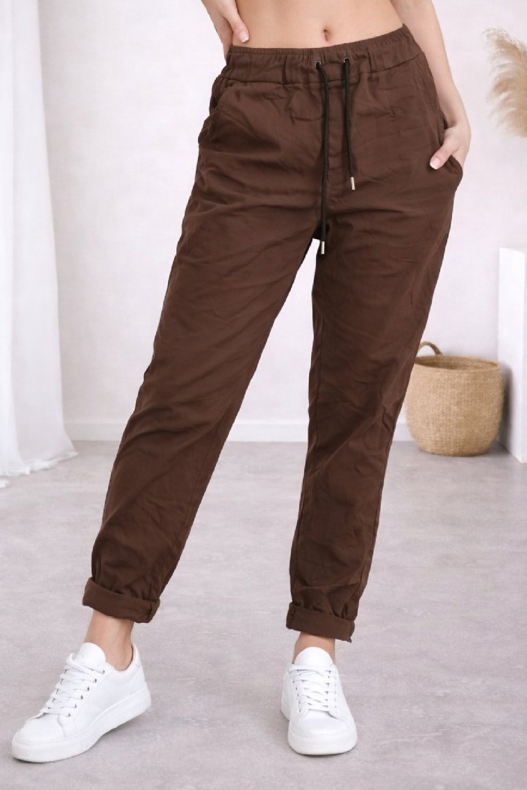Super strečové, plátěné kalhoty v pase do gumy a šňůrky na stažení obvodu. Šnůrka se může barevně lišit buď černá nebo bílá - záleží na dodávce. Boční kapsy, vzadu bez kapes. Foceno na vel. XS, výška 156cm i na vel. 44(pas 108cm, boky 119cm).