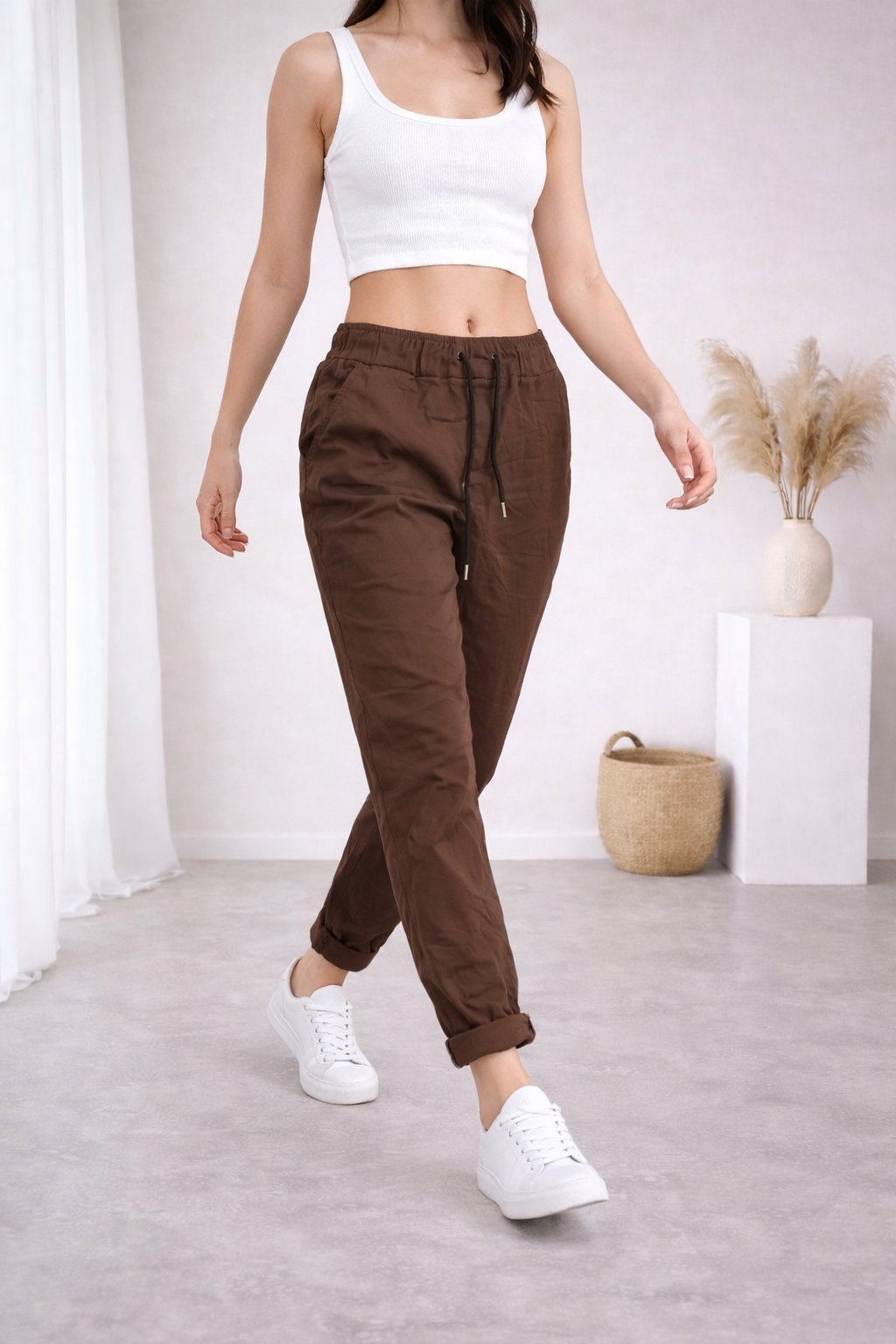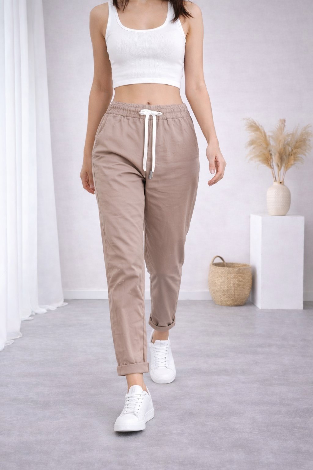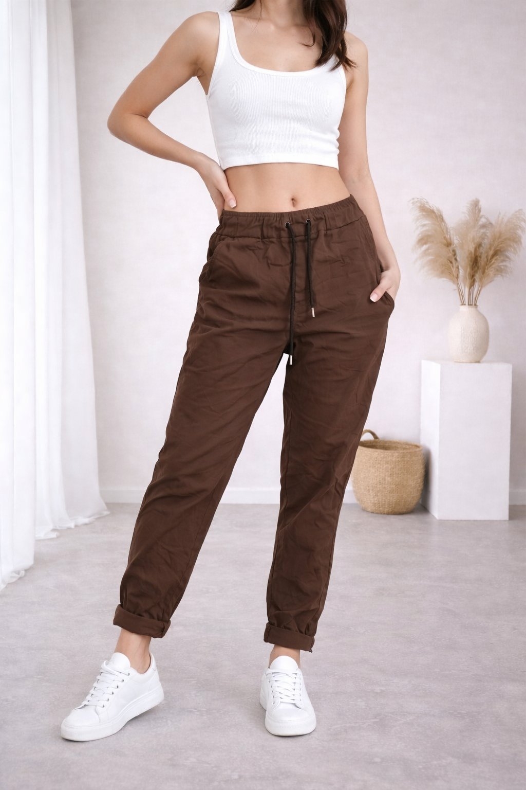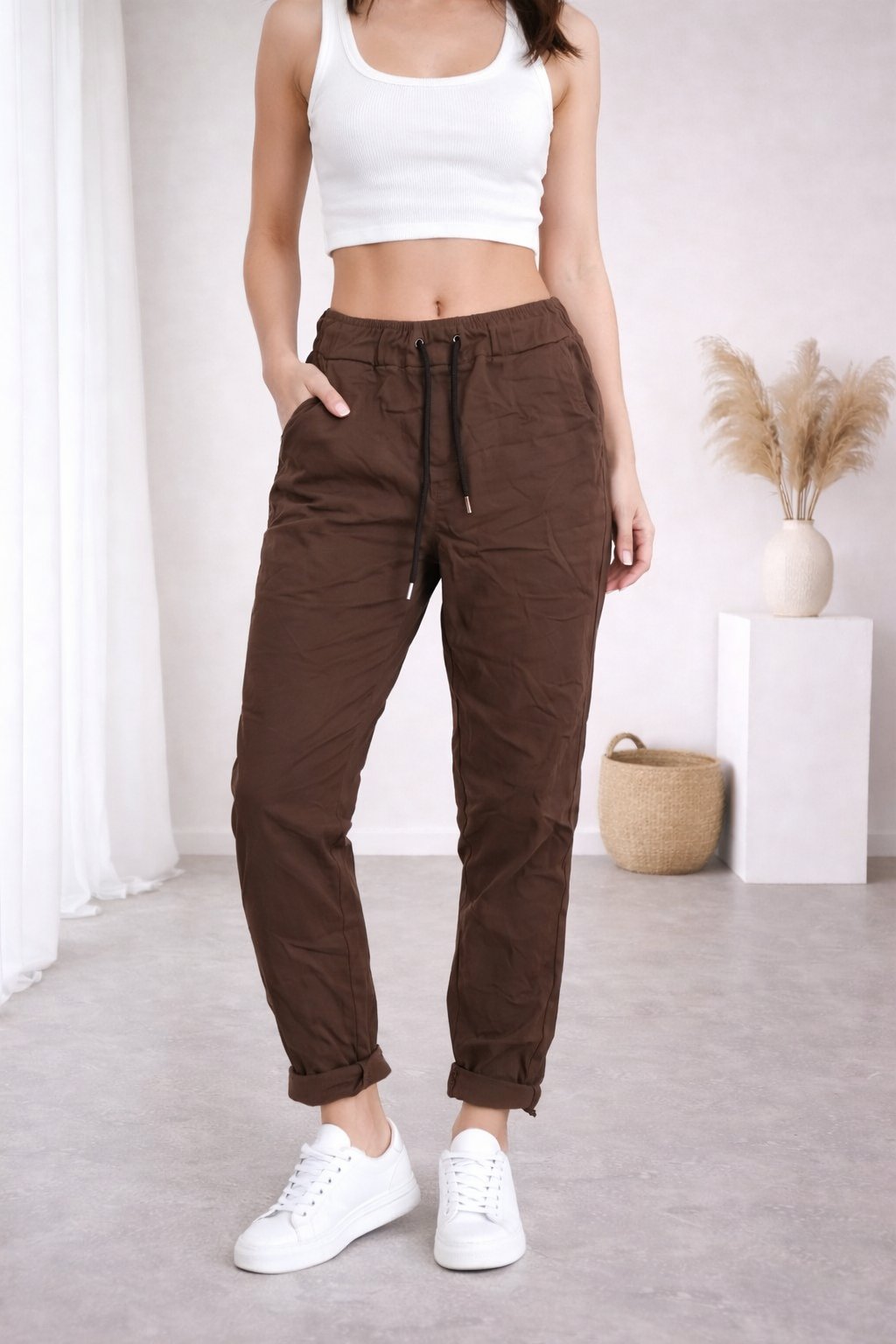 Super strečové, plátěné kalhoty v pase do gumy a šňůrky na stažení obvodu. Šnůrka se může barevně lišit buď černá nebo bílá - záleží na dodávce. Boční kapsy, vzadu bez kapes. Foceno na vel. XS, výška 156cm i na vel. 44(pas 108cm, boky 119cm).