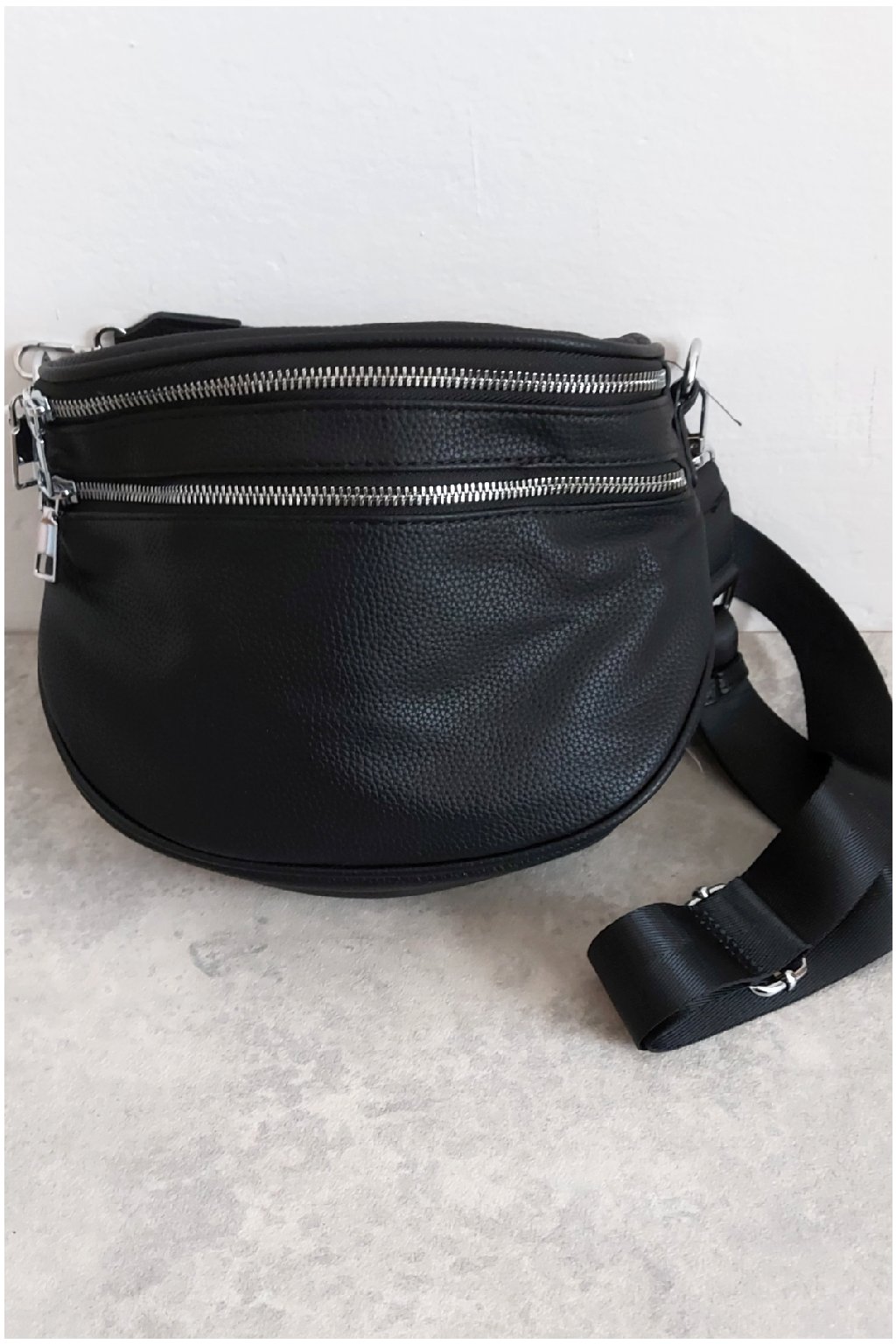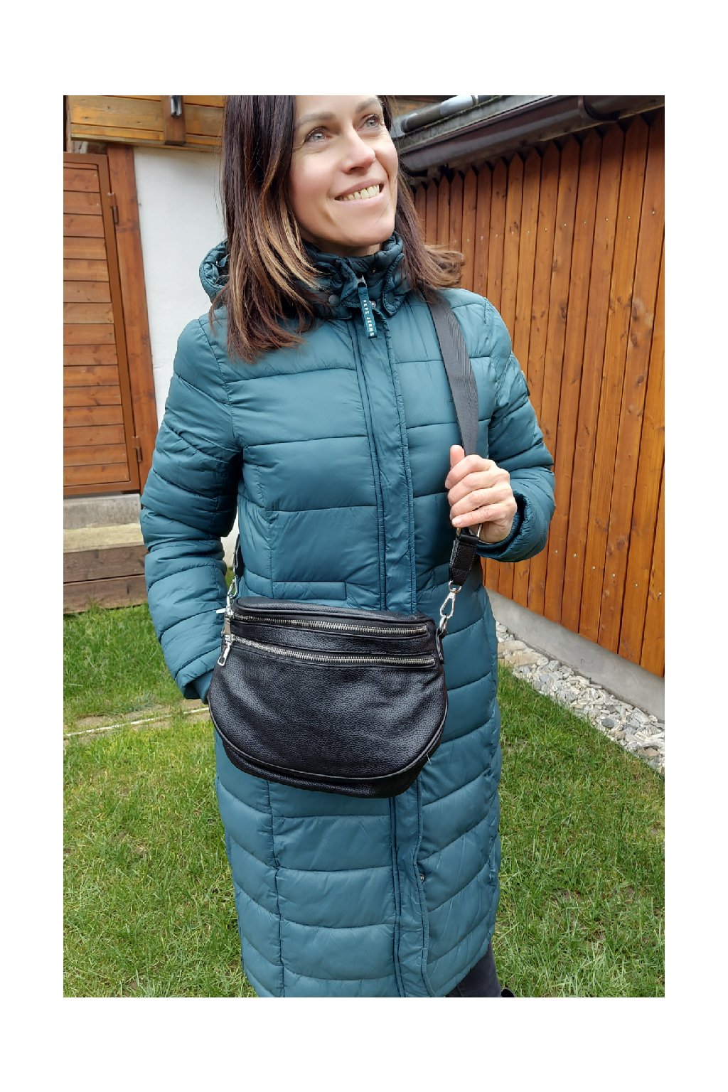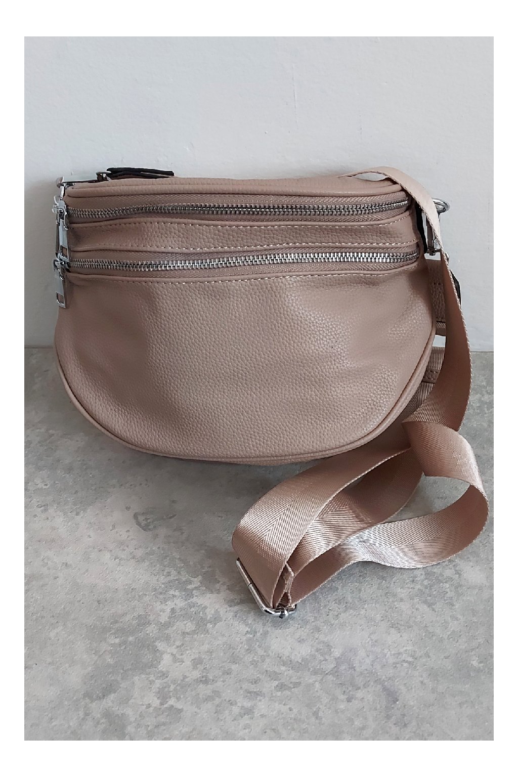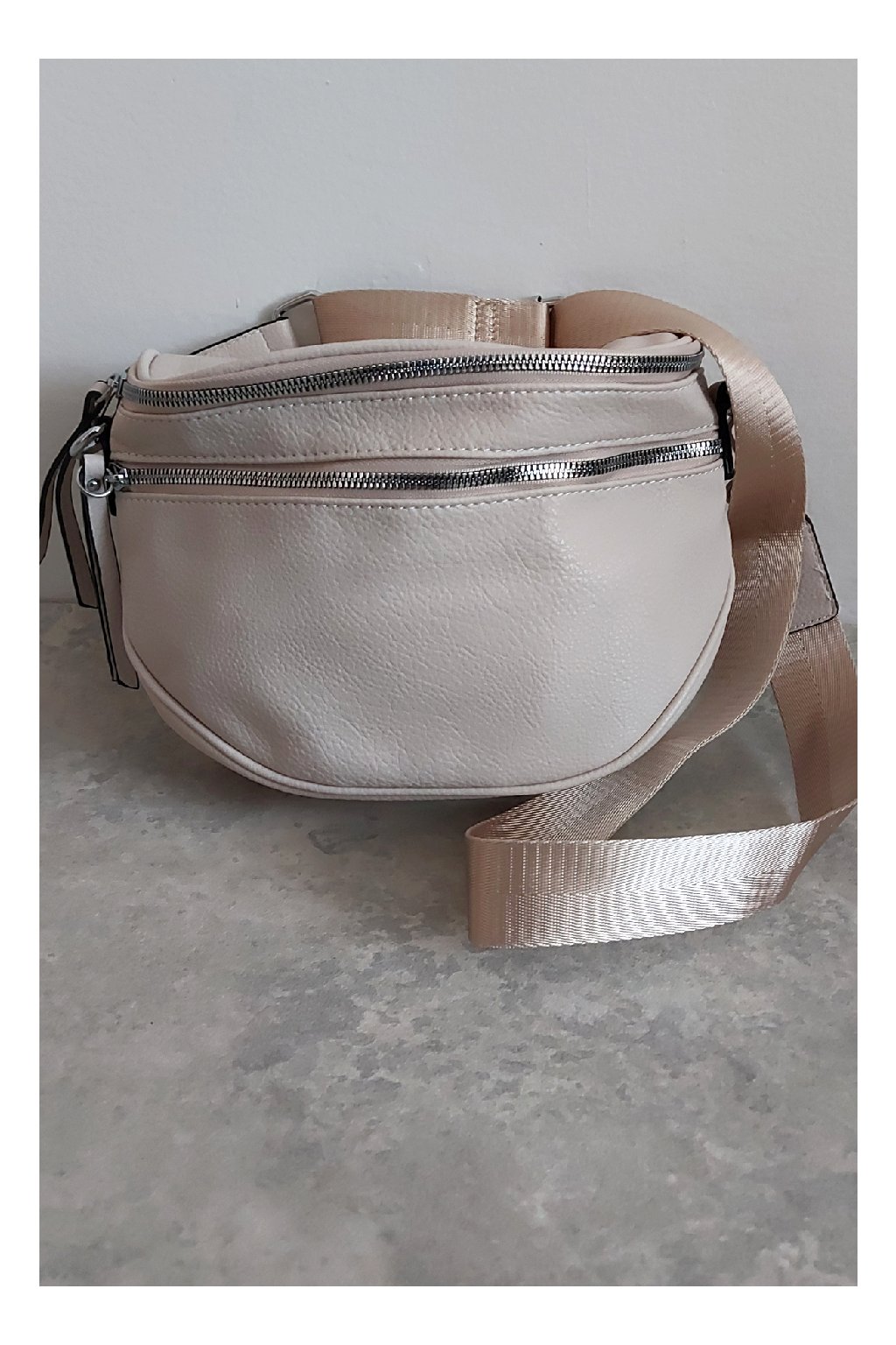 Crossbody kabelka s jedním nastavitelným ramenním popruhem. Vpředu jsou dvě kapsy uzaviratelné zipem ve stříbrném provedení. Uvnitř jedna malá kapsička z boku (na drobnosti či cenné předměty) také na zip. Popruh je textilní - omyvatelný materiál.