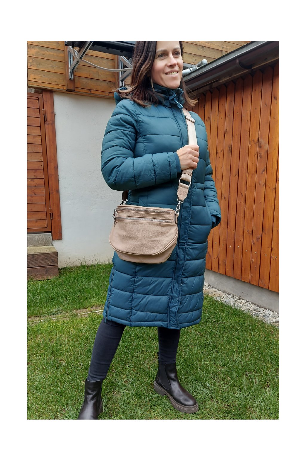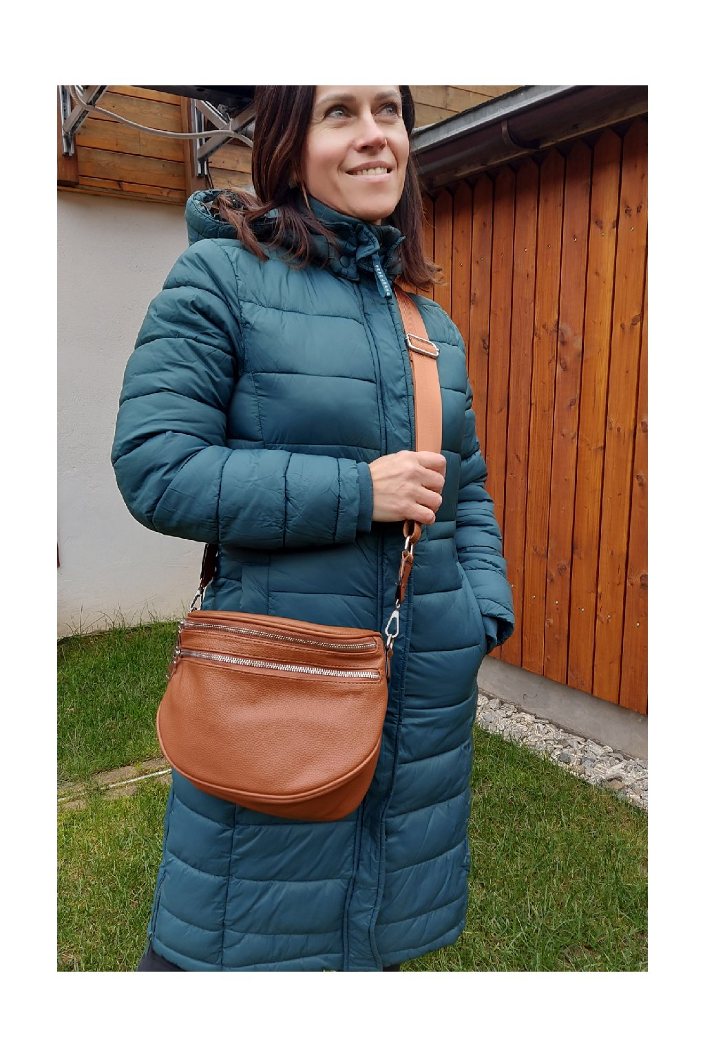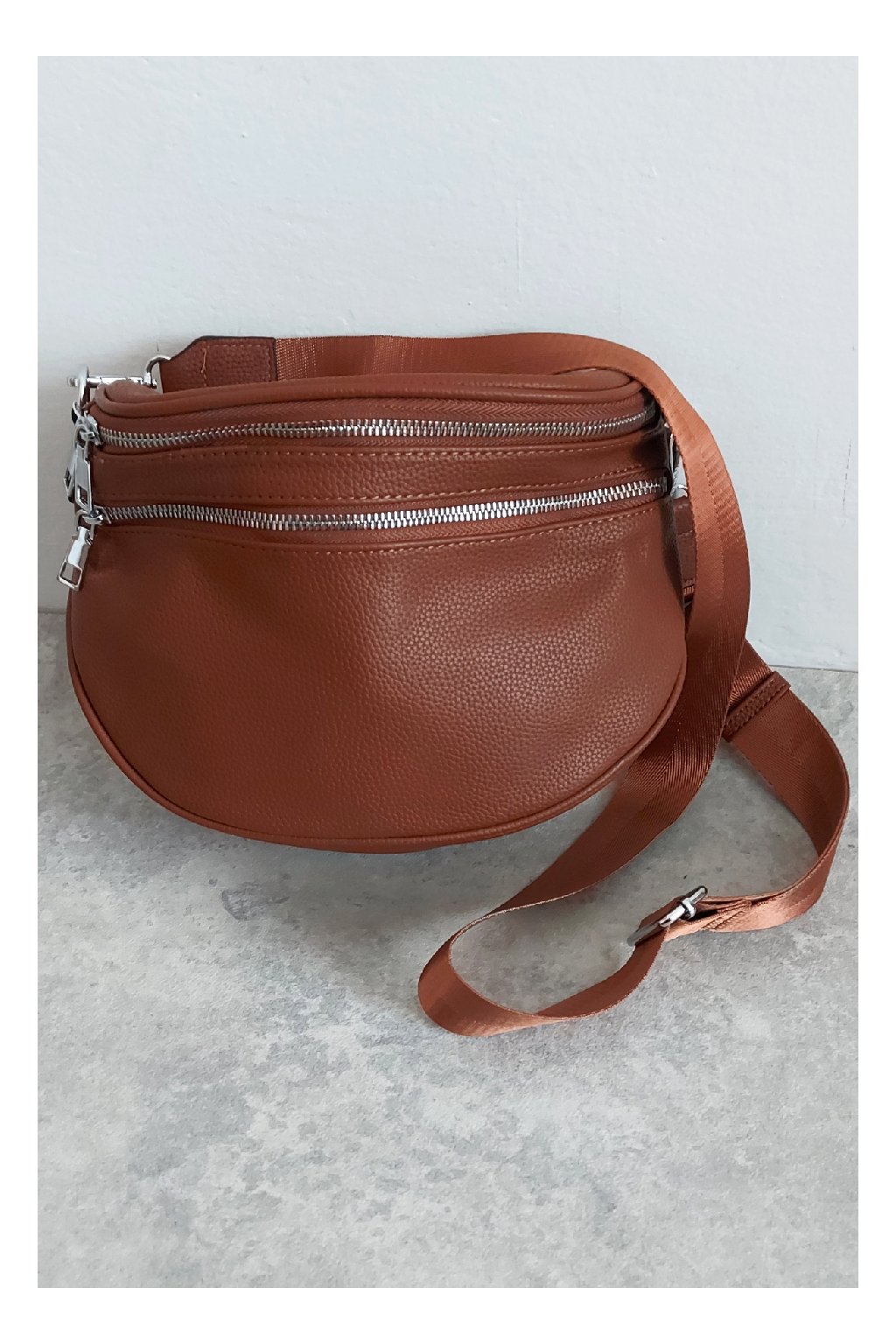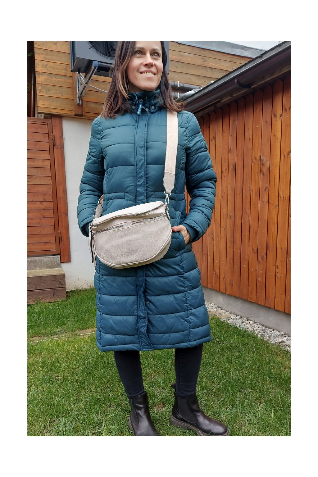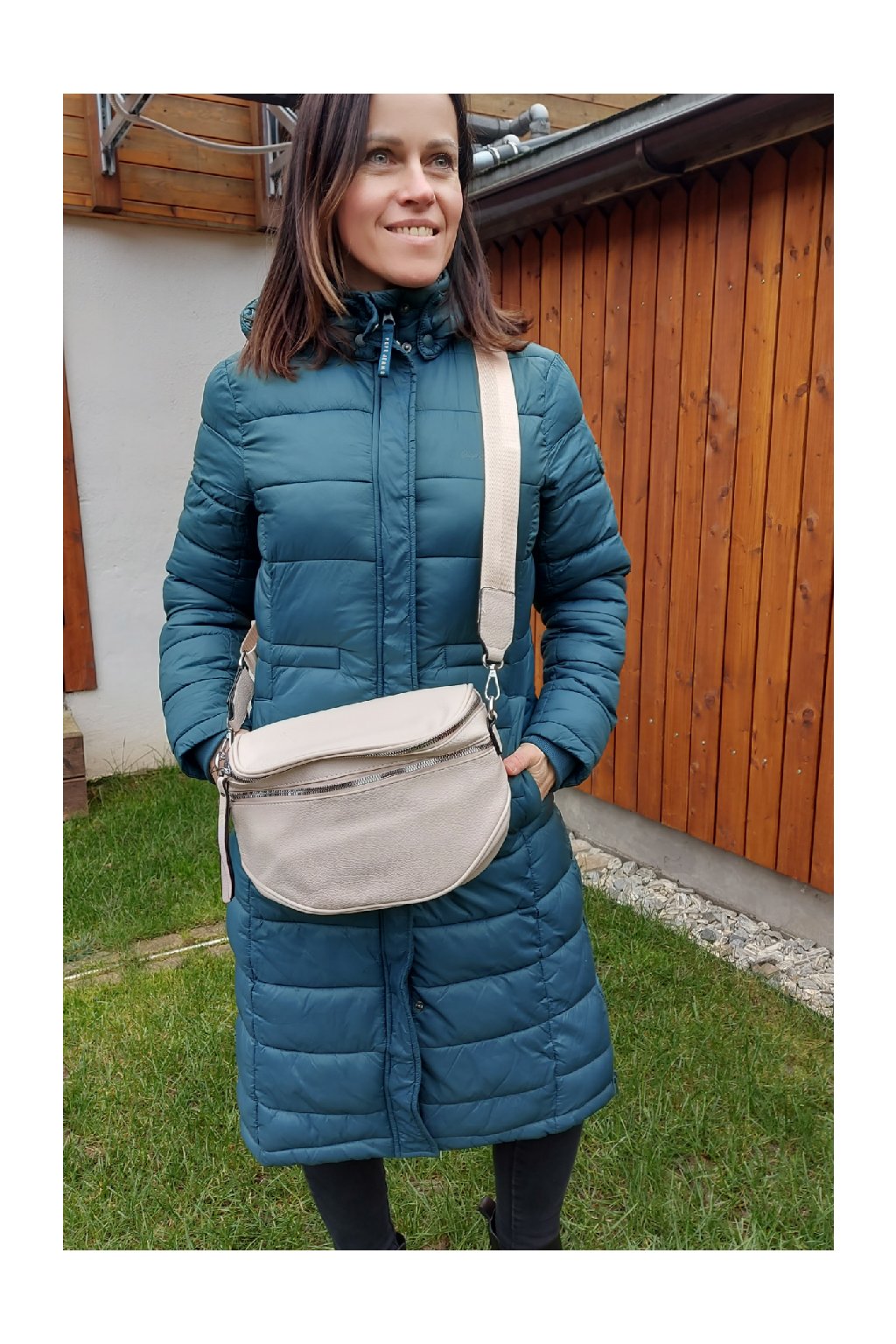 Crossbody kabelka s jedním nastavitelným ramenním popruhem. Vpředu jsou dvě kapsy uzaviratelné zipem ve stříbrném provedení. Uvnitř jedna malá kapsička z boku (na drobnosti či cenné předměty) také na zip. Popruh je textilní - omyvatelný materiál.
