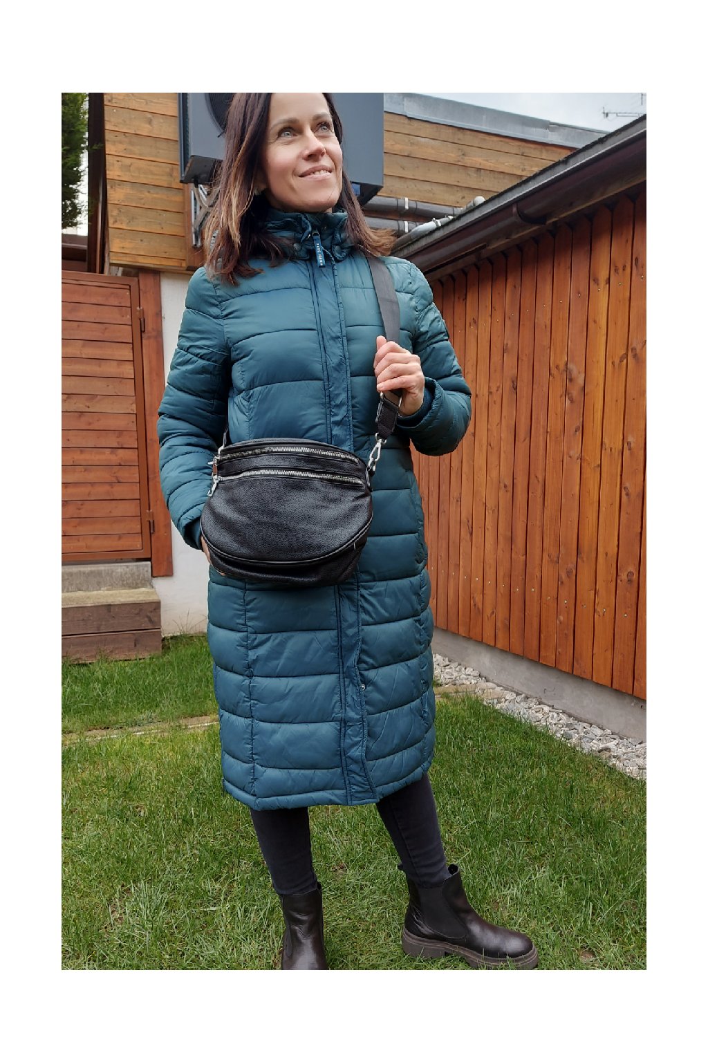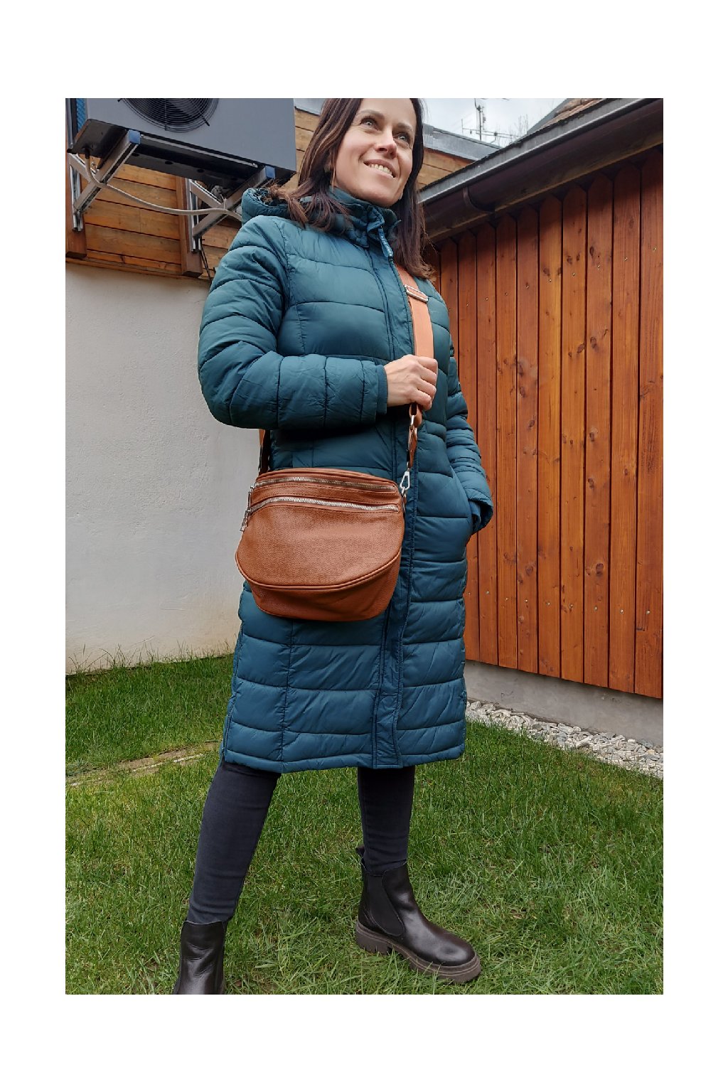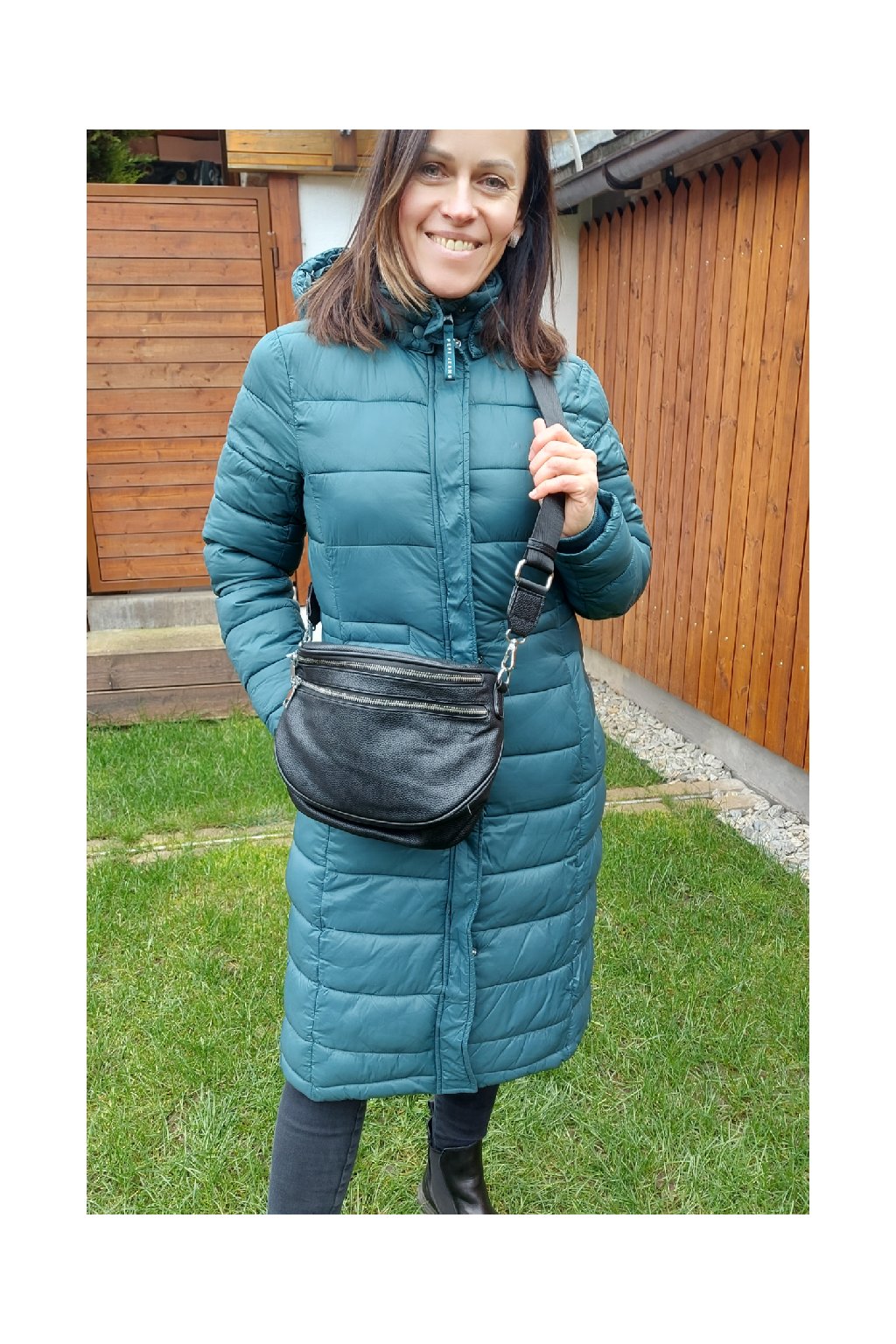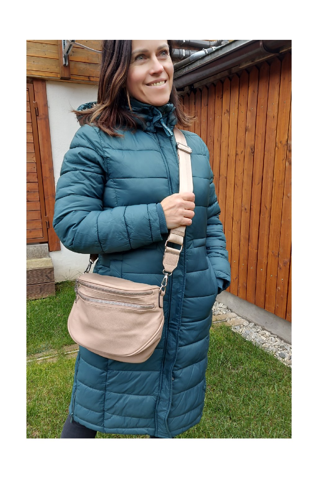 Crossbody kabelka s jedním nastavitelným ramenním popruhem. Vpředu jsou dvě kapsy uzaviratelné zipem ve stříbrném provedení. Uvnitř jedna malá kapsička z boku (na drobnosti či cenné předměty) také na zip. Popruh je textilní - omyvatelný materiál.