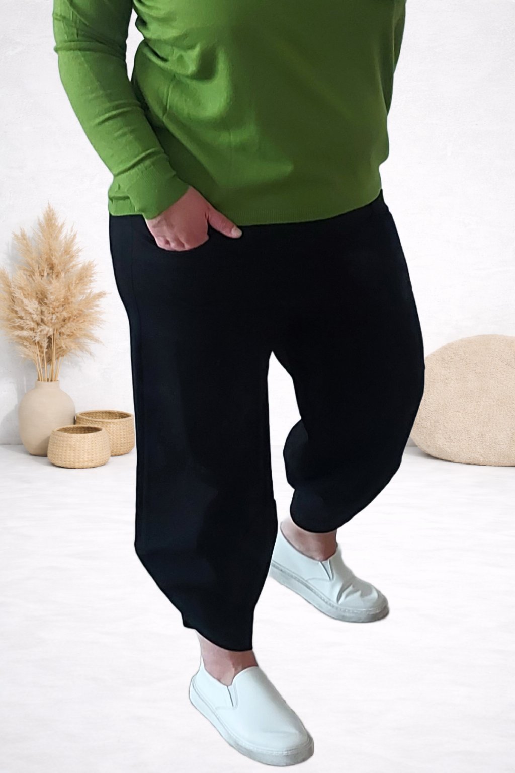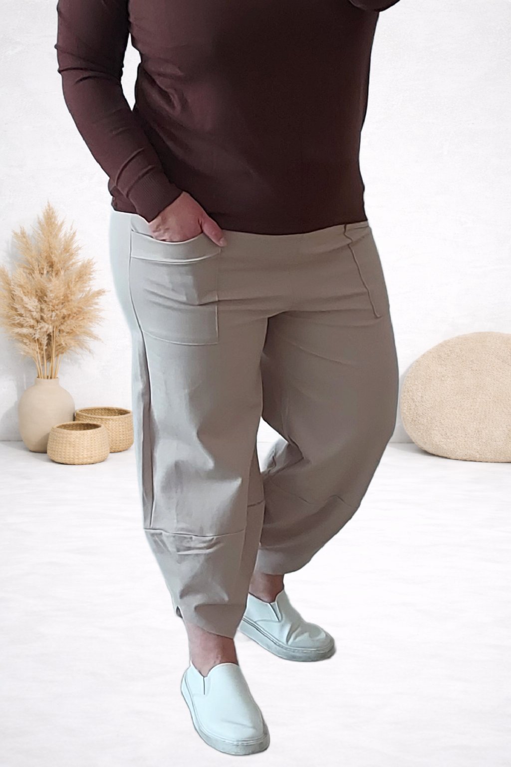 Parádní kalhoty s nohavicemi balonového střihu, vhodné i pro slavnostnější příležitost. V pase guma. Nohavice jsou po stranách kratší. Přední hluboké kapsy, vzadu bez kapes. Sed klasický. Luxusní, vysoce kvalitní materiál. Foceno na vel. 2XL/3XL (pas 110cm, boky 120cm), výška 165cm.