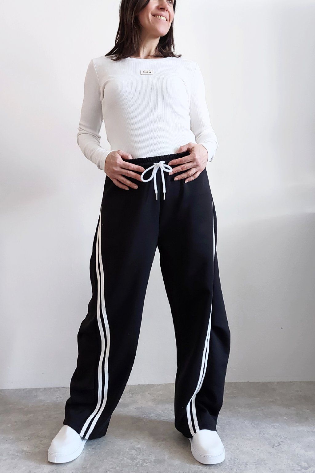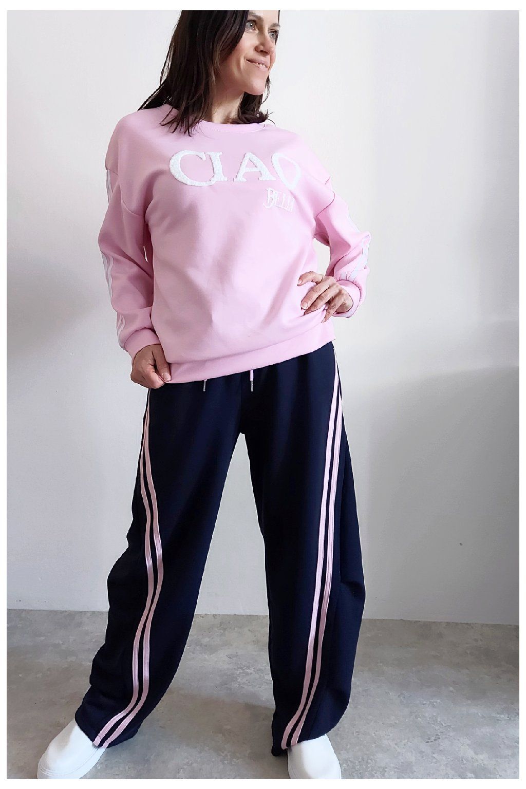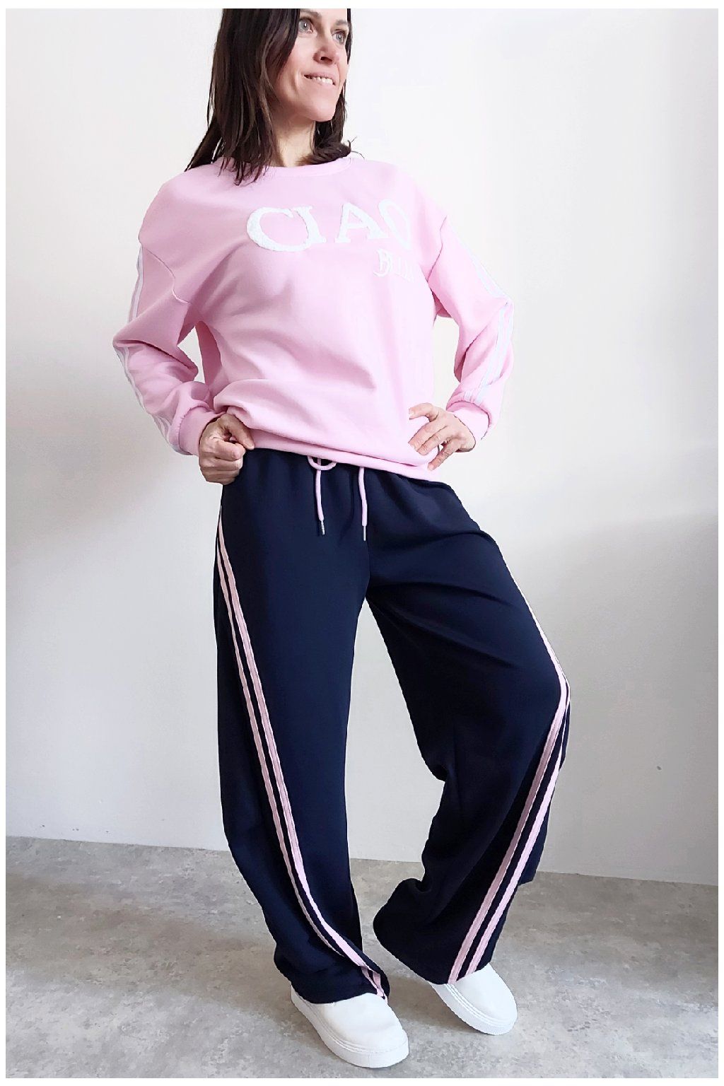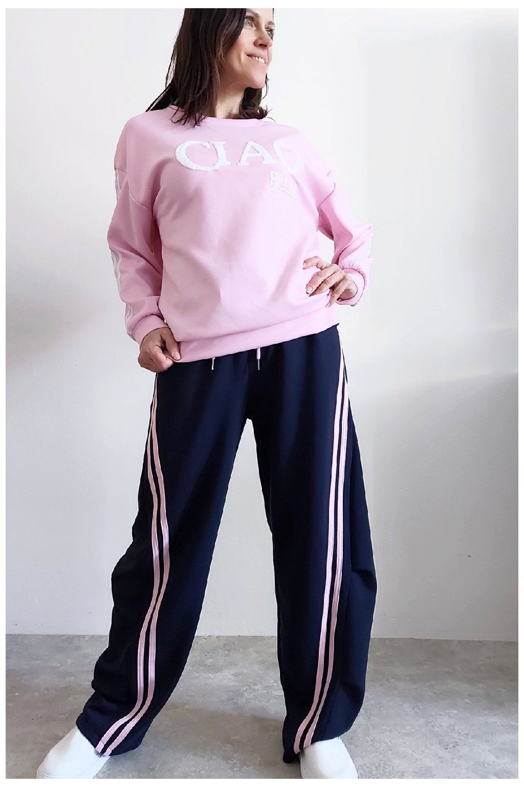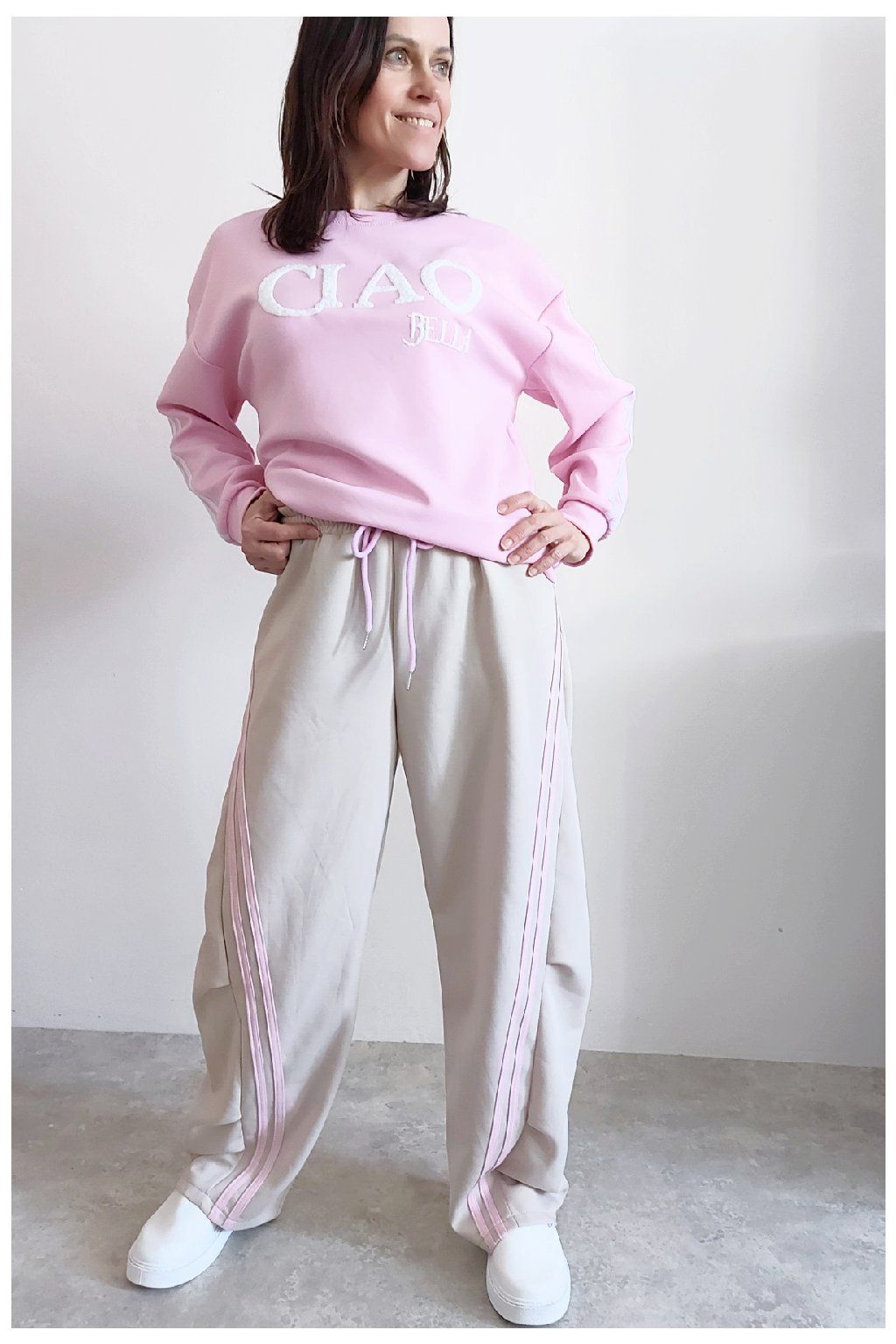 Volnočasové teplákové kalhoty balonového střihu. Jsou po stranách zdobené lampasy. Nohavice mají ve spodní části vždy 2 záševky z každé strany a díky nim drží nohavice ten správný tvar. V pase guma a šňůrka pro stažení obvodu. Boční kapsy, vzadu bez kapes. Materiál máslový - jemný, hebký, silnější, drží tvar, top kvalita. Foceno na vel. XS, výška 156cm.