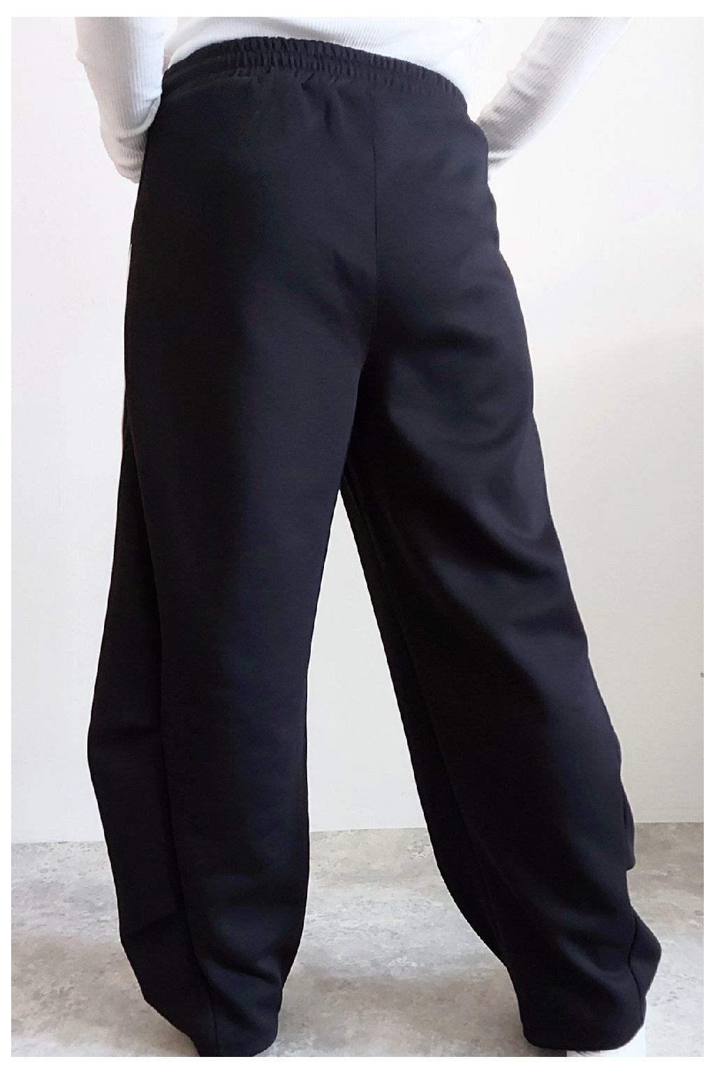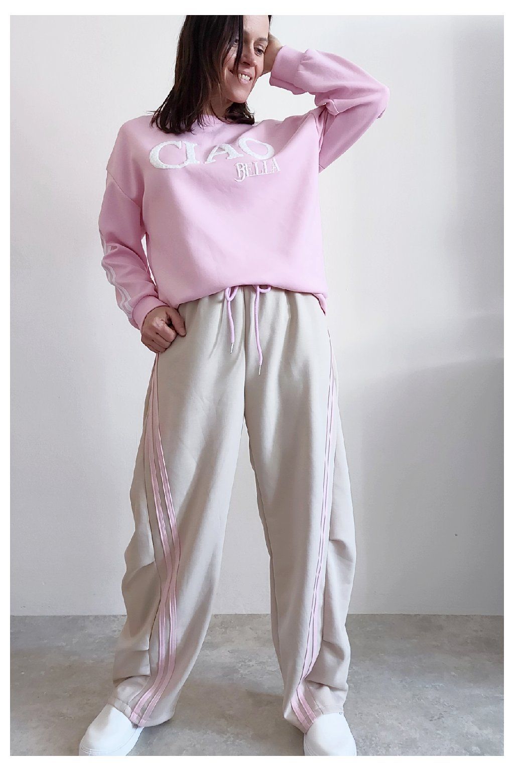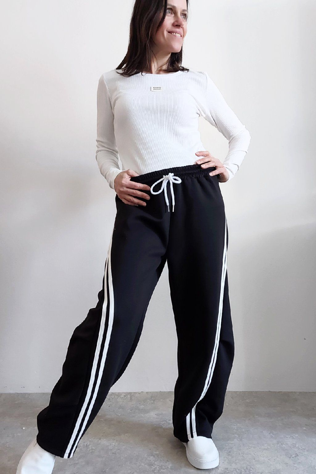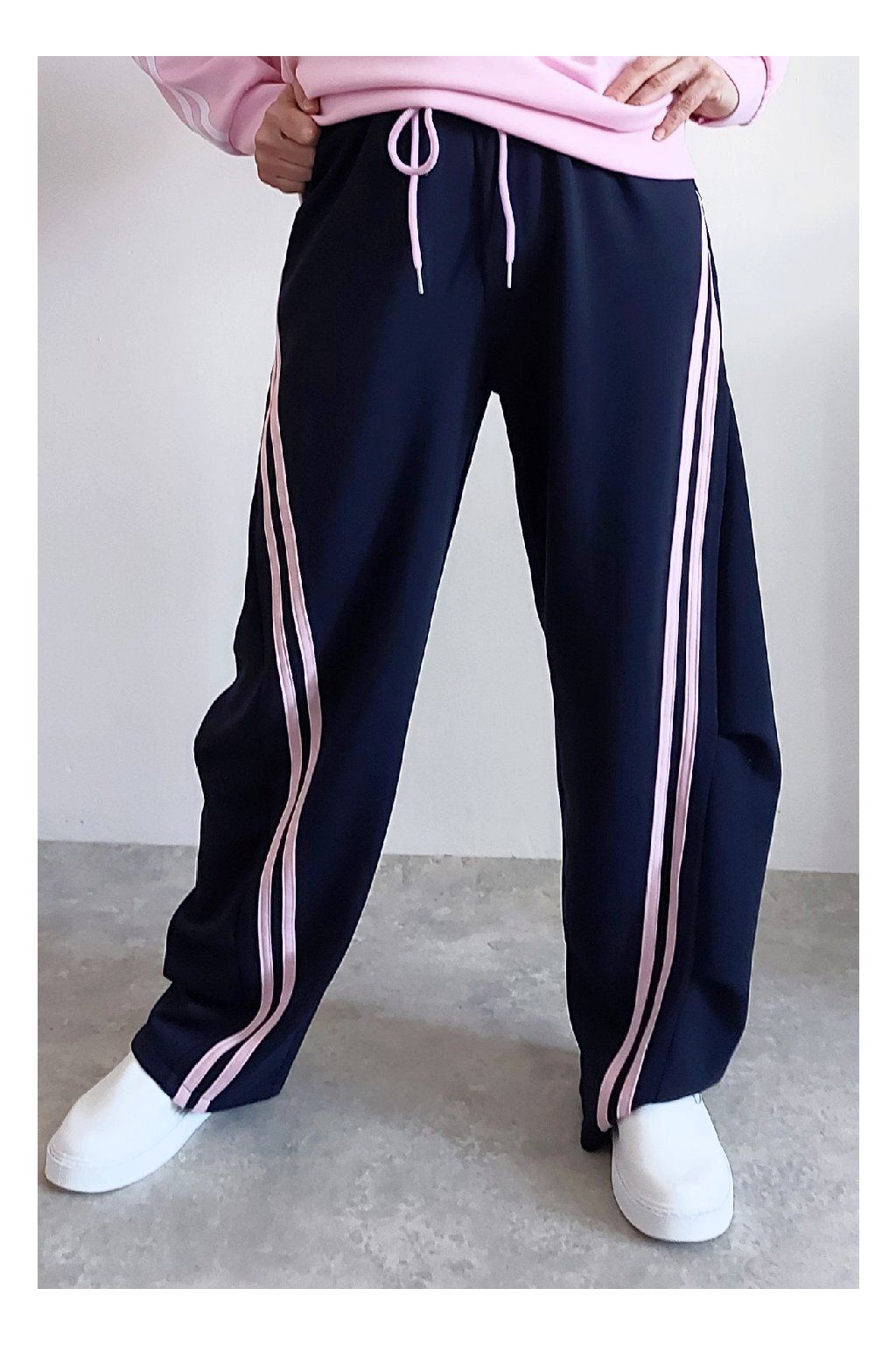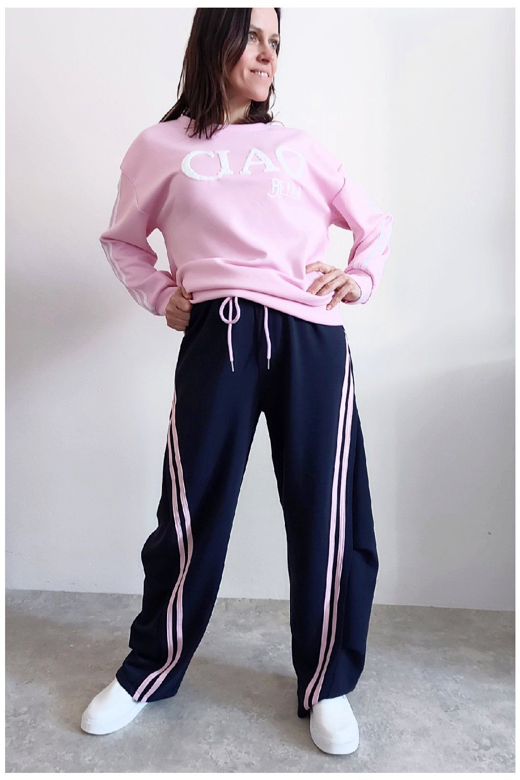 Volnočasové teplákové kalhoty balonového střihu. Jsou po stranách zdobené lampasy. Nohavice mají ve spodní části vždy 2 záševky z každé strany a díky nim drží nohavice ten správný tvar. V pase guma a šňůrka pro stažení obvodu. Boční kapsy, vzadu bez kapes. Materiál máslový - jemný, hebký, silnější, drží tvar, top kvalita. Foceno na vel. XS, výška 156cm.