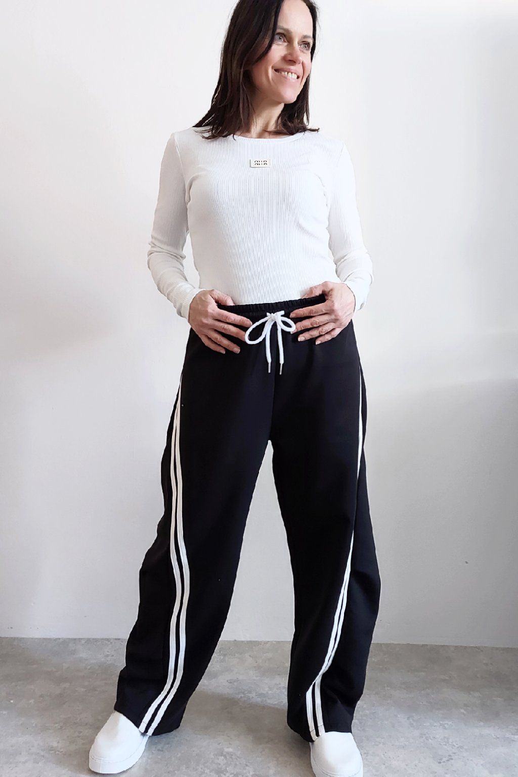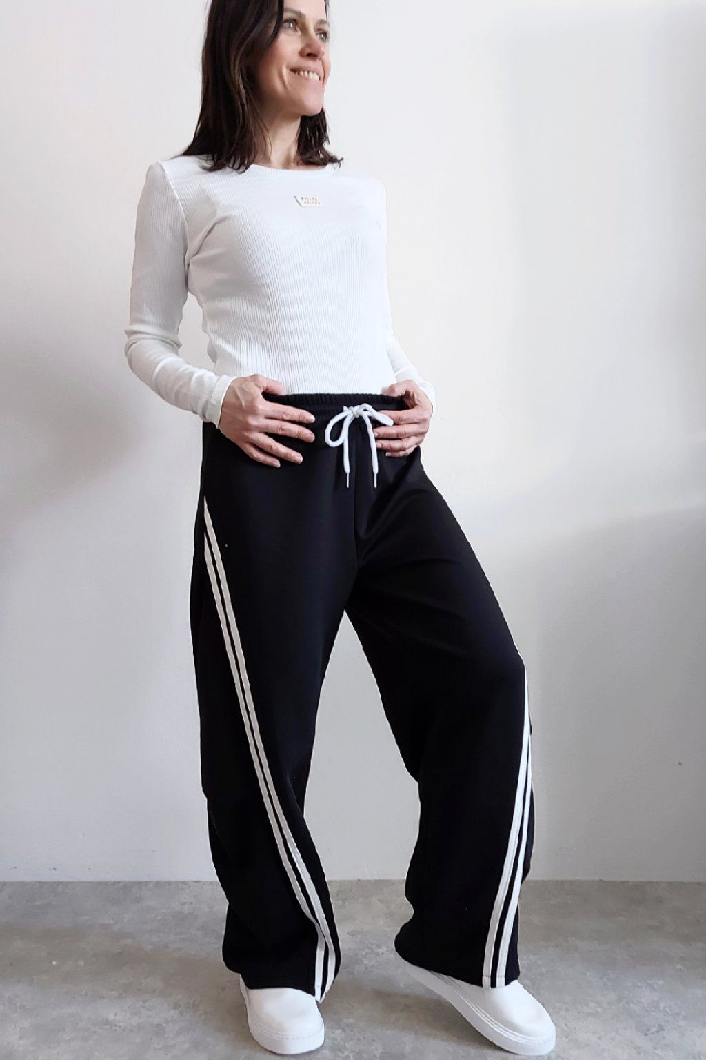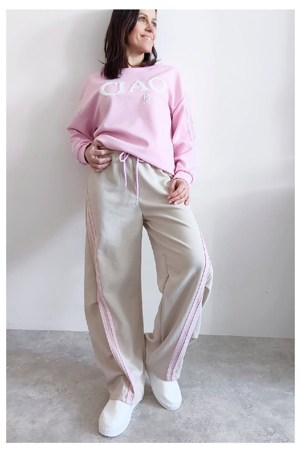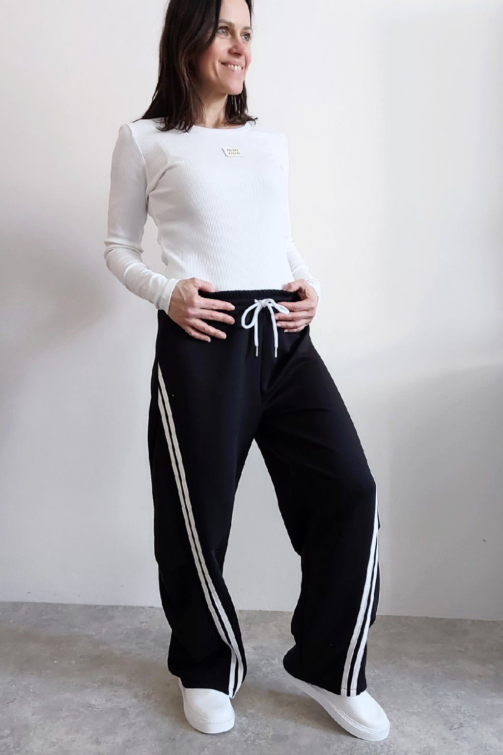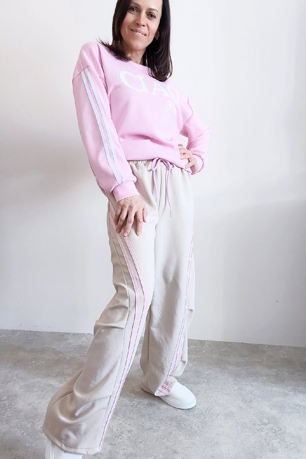 Volnočasové teplákové kalhoty balonového střihu. Jsou po stranách zdobené lampasy. Nohavice mají ve spodní části vždy 2 záševky z každé strany a díky nim drží nohavice ten správný tvar. V pase guma a šňůrka pro stažení obvodu. Boční kapsy, vzadu bez kapes. Materiál máslový - jemný, hebký, silnější, drží tvar, top kvalita. Foceno na vel. XS, výška 156cm.