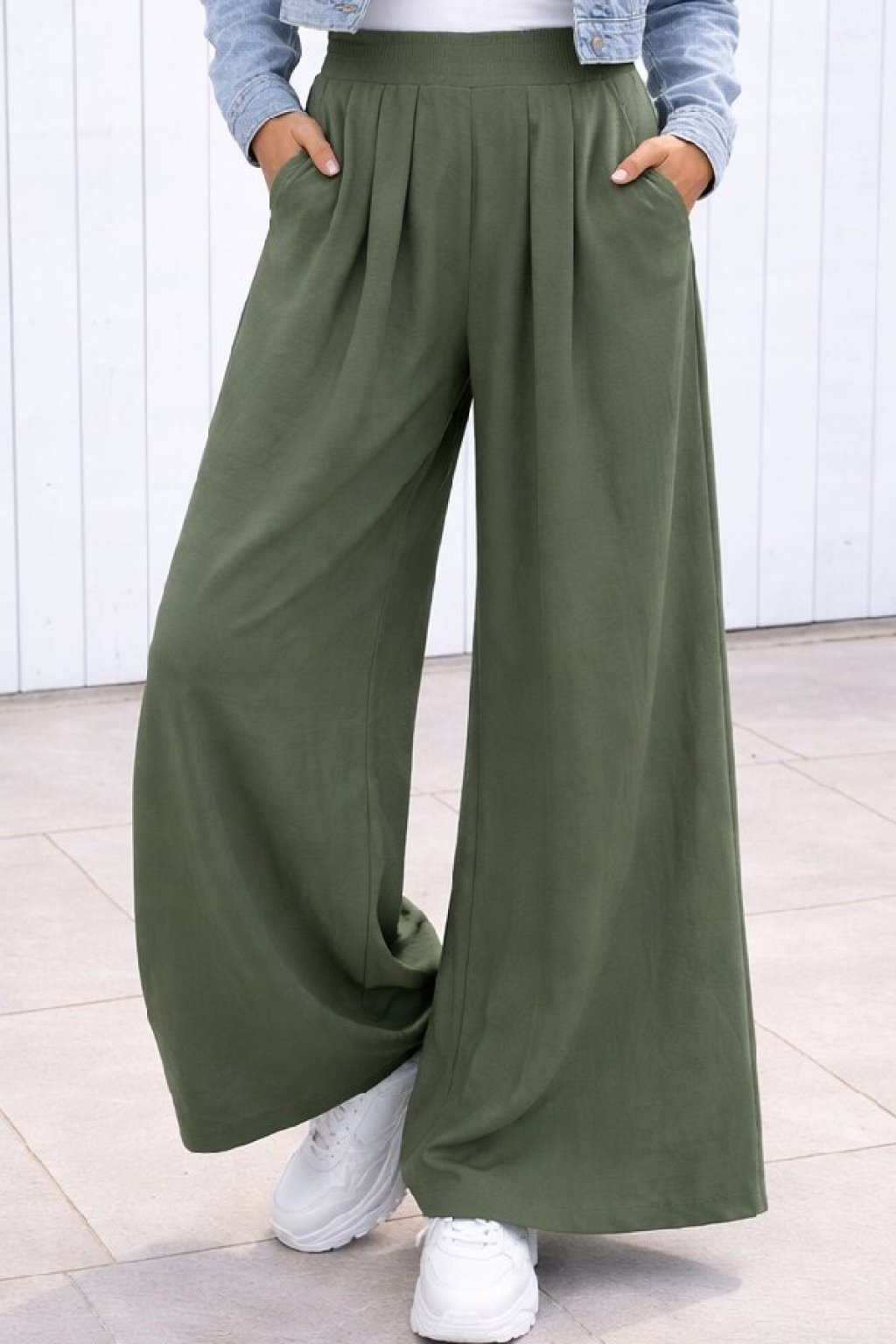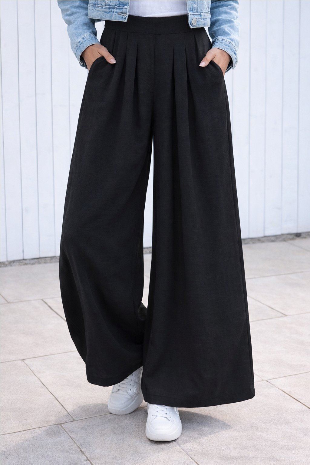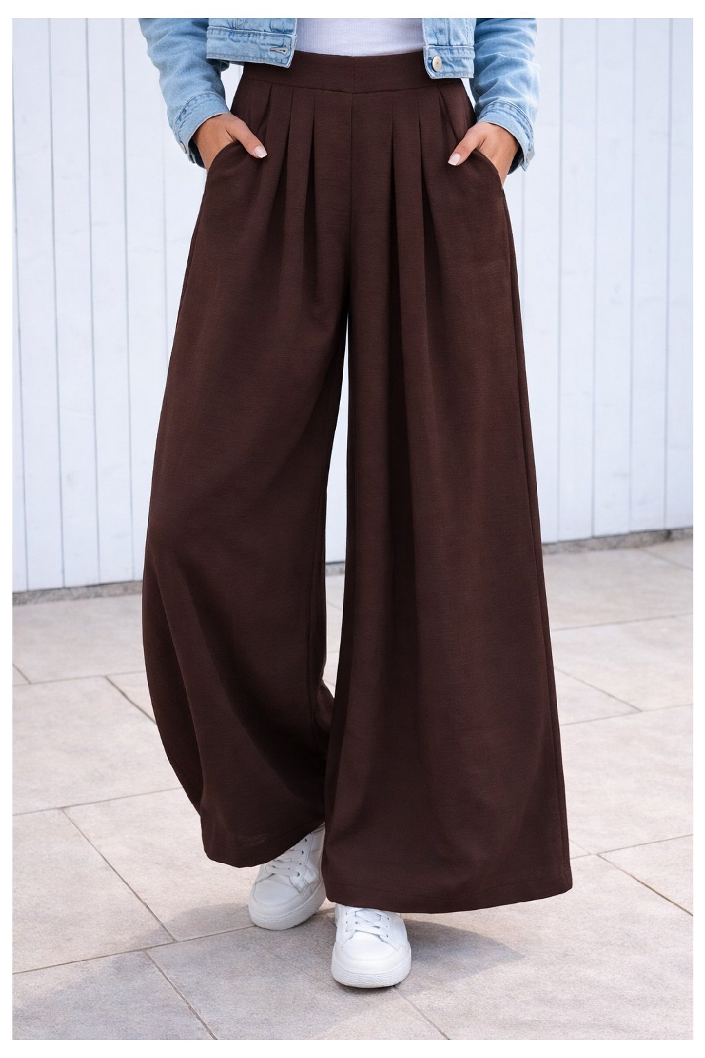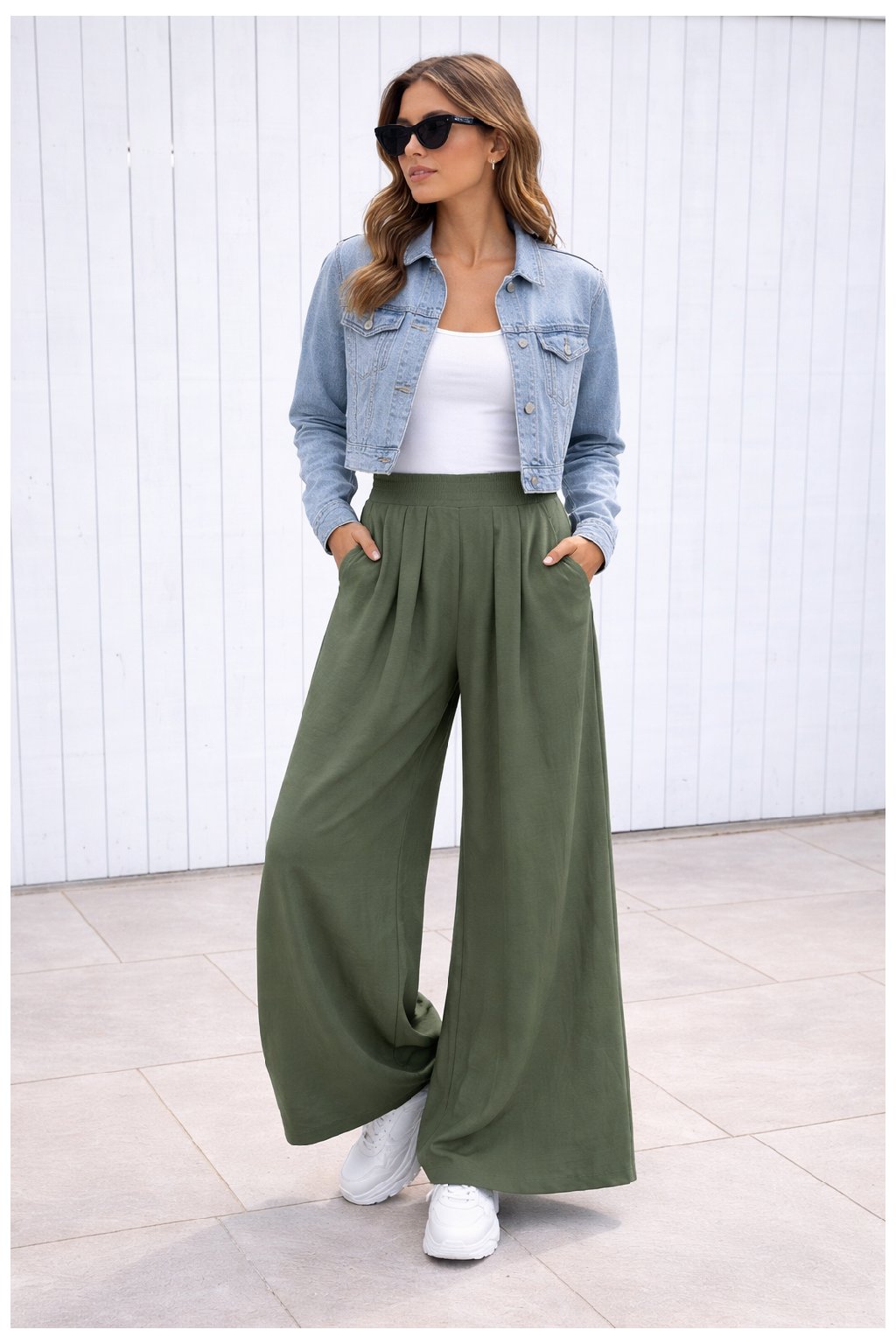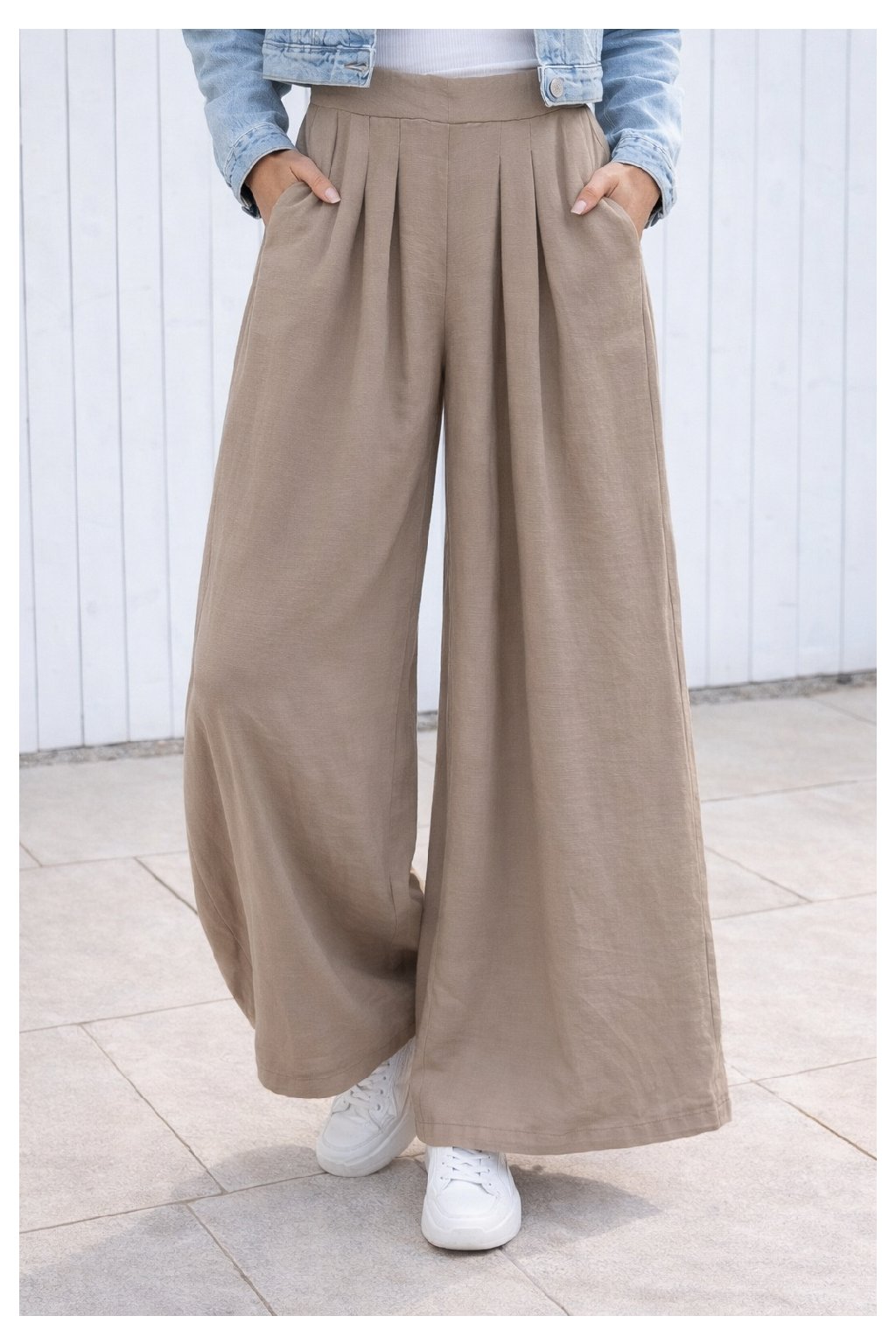Kalhoty s extra širokými nohavicemi. V pase do gumy. Přední kapsy - vzadu bez kapes. Pod gumou jsou efektní záševky, díky nimž drží nohavice správný tvar. Materiál lehký, vzdušný, na těle příjemný - ideální i na horké letní dny. Díky délce nohavic jsou vhodné pro vyšší postavy.