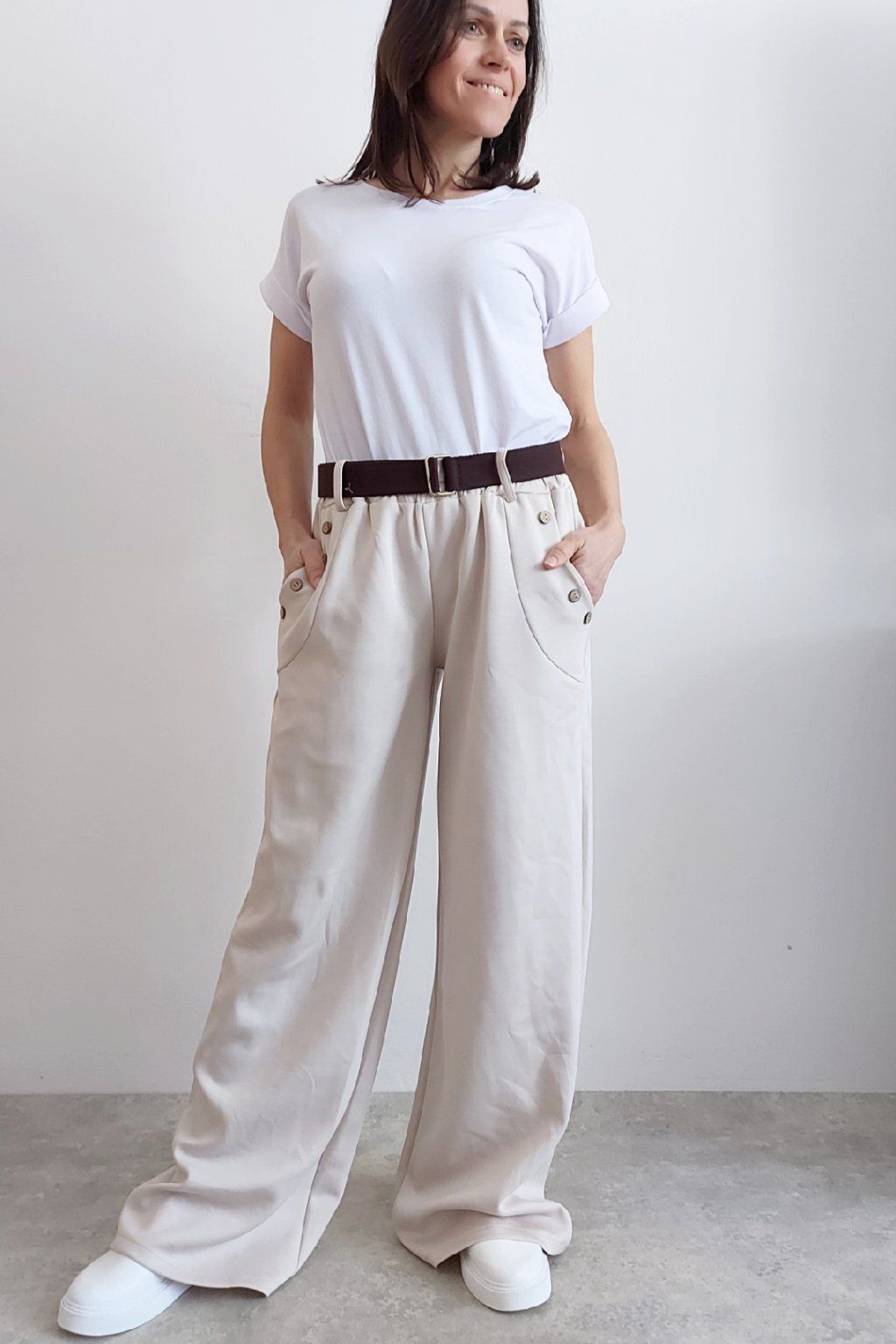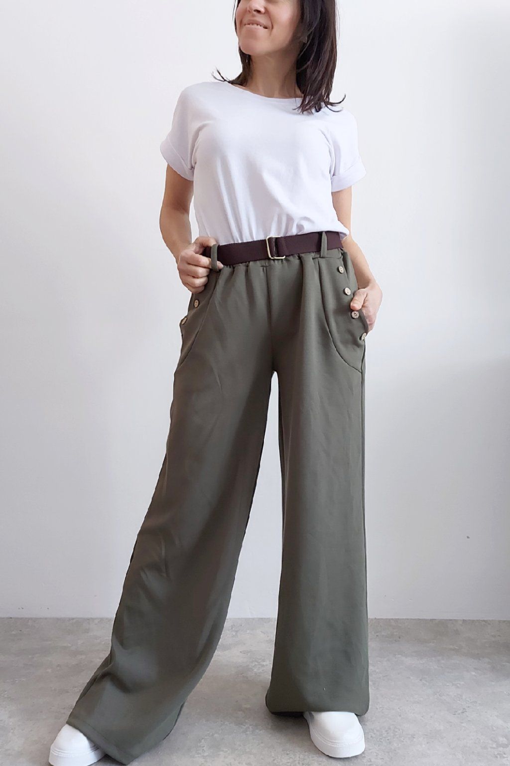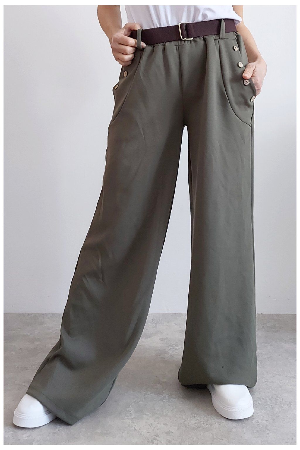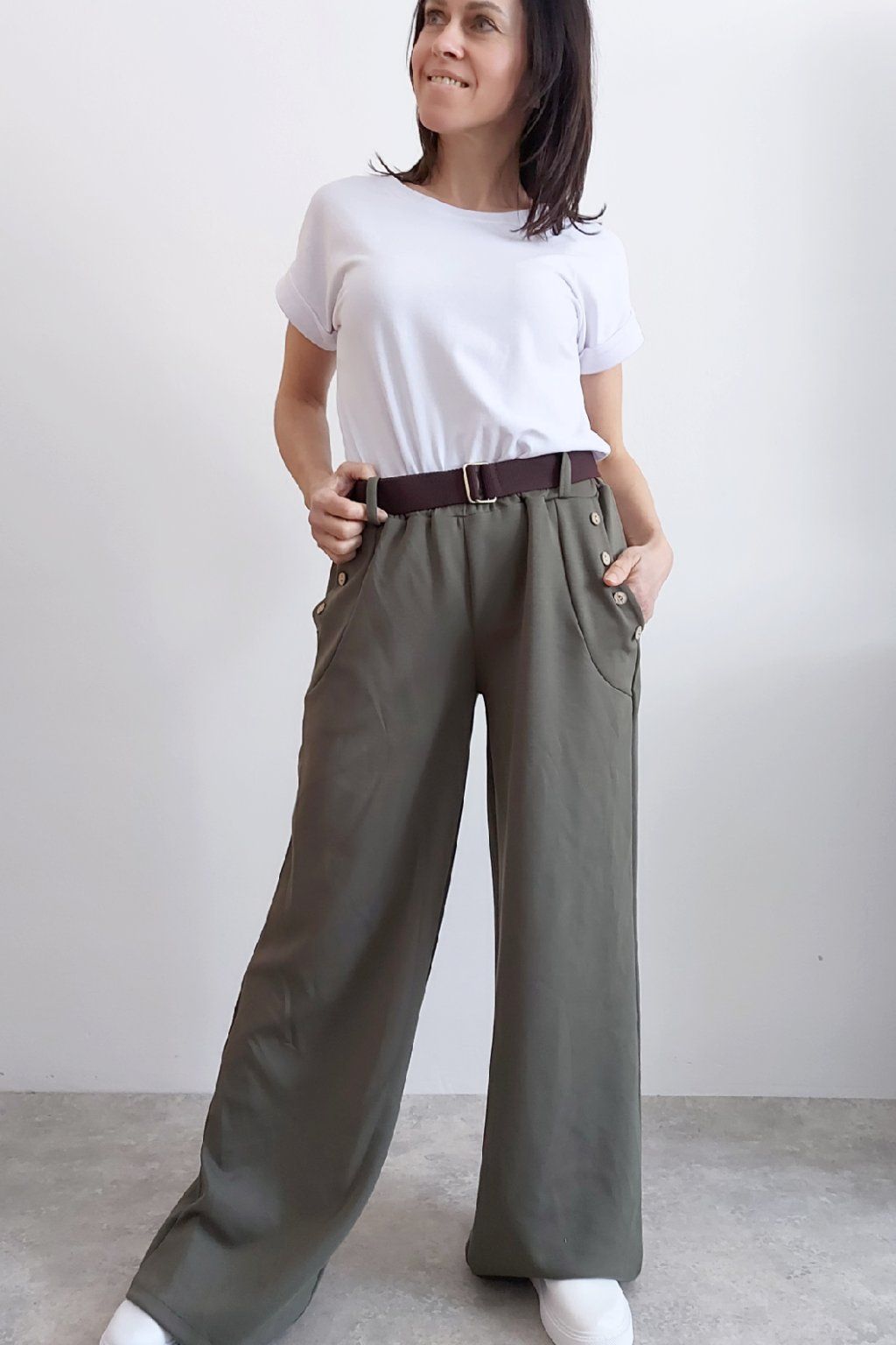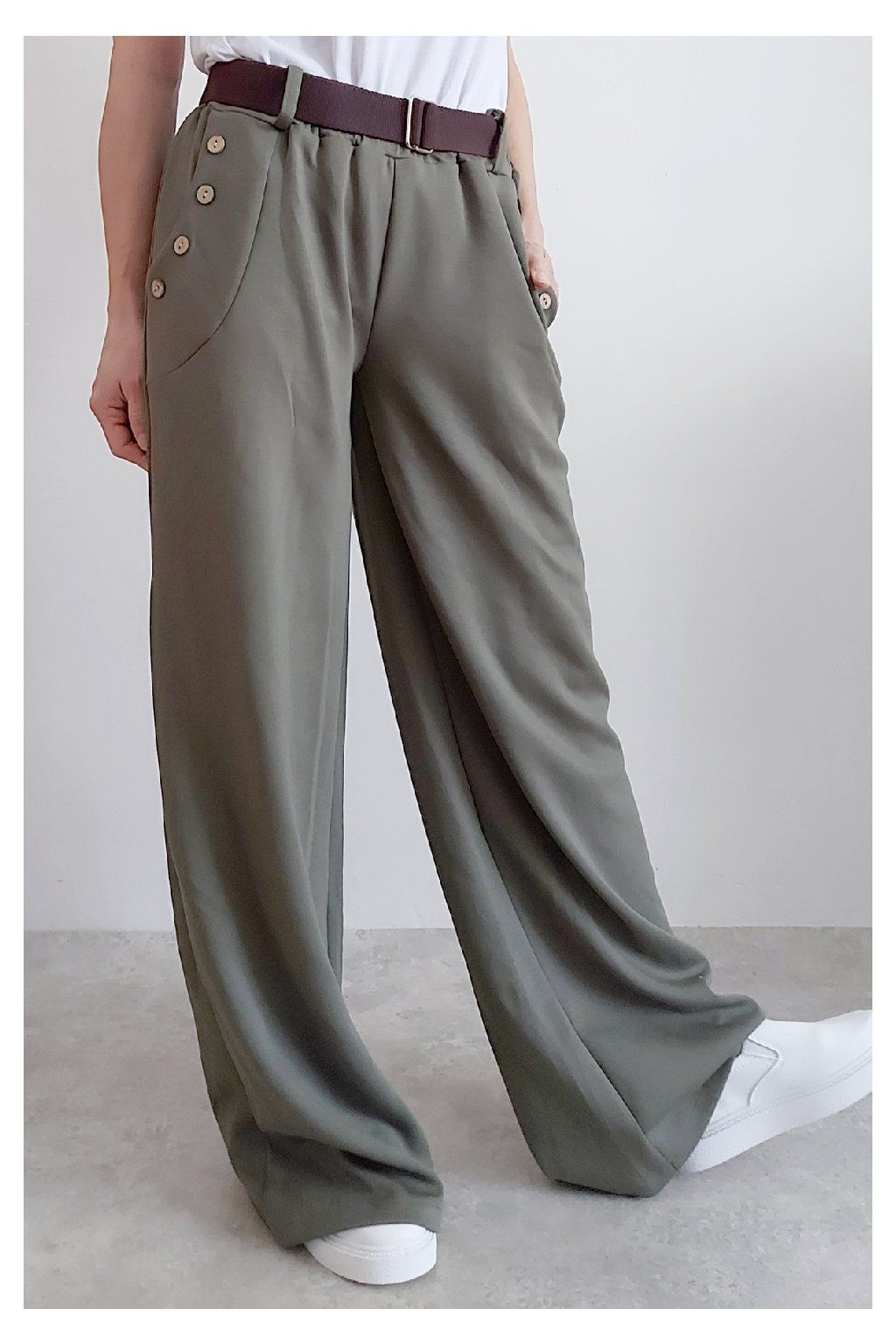 Kalhoty s širokými nohavicemi. V pase guma a pásek s poutky. Přední kapsy, t y jsou zdobené knoflíky, vzadu bez kapes. Materiál máslový - jemný, hebký, silnější, drží tvar, top kvalita. Foceno na vel. XS, výška 156cm i na vel. 2XL (pas 106cm, boky 120cm), výška 165cm, na této velikosti již obeplé.