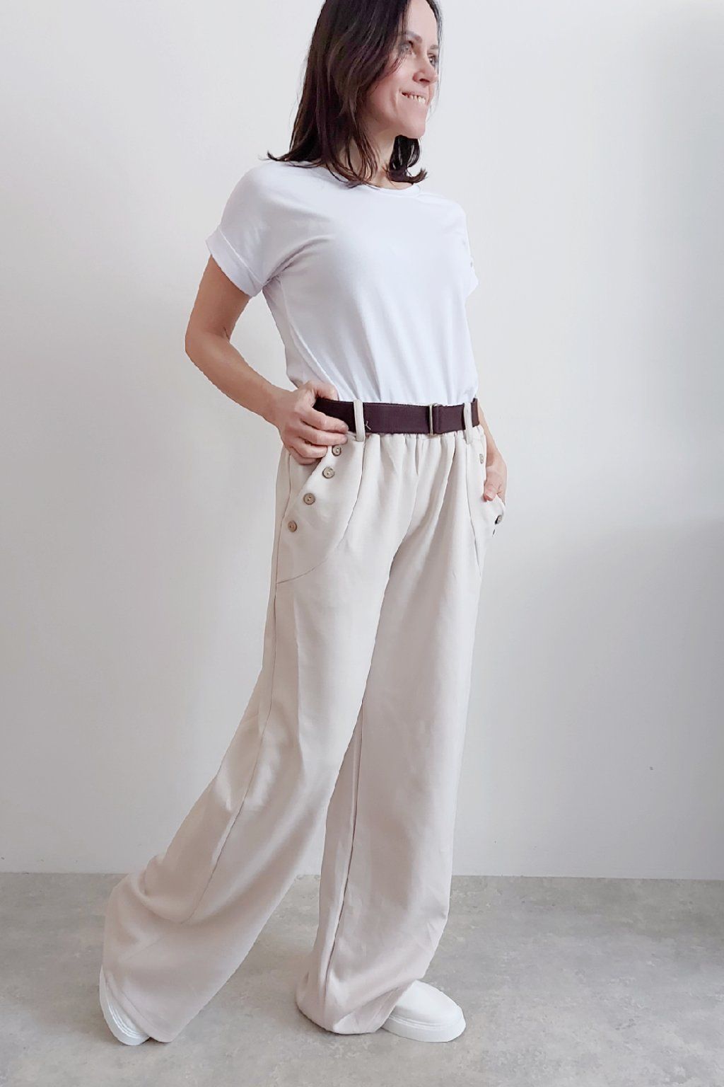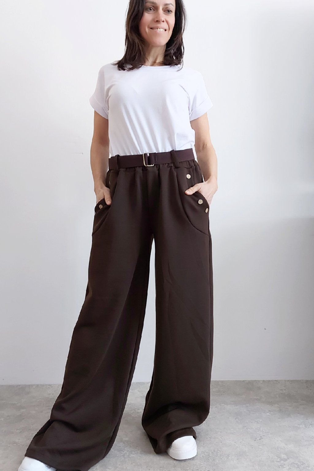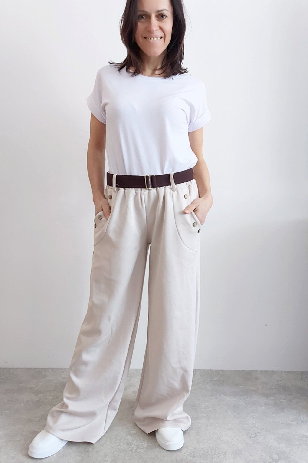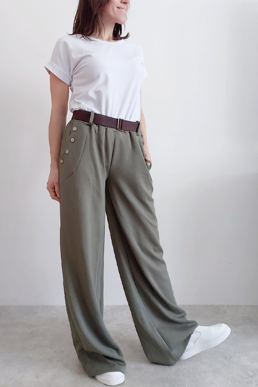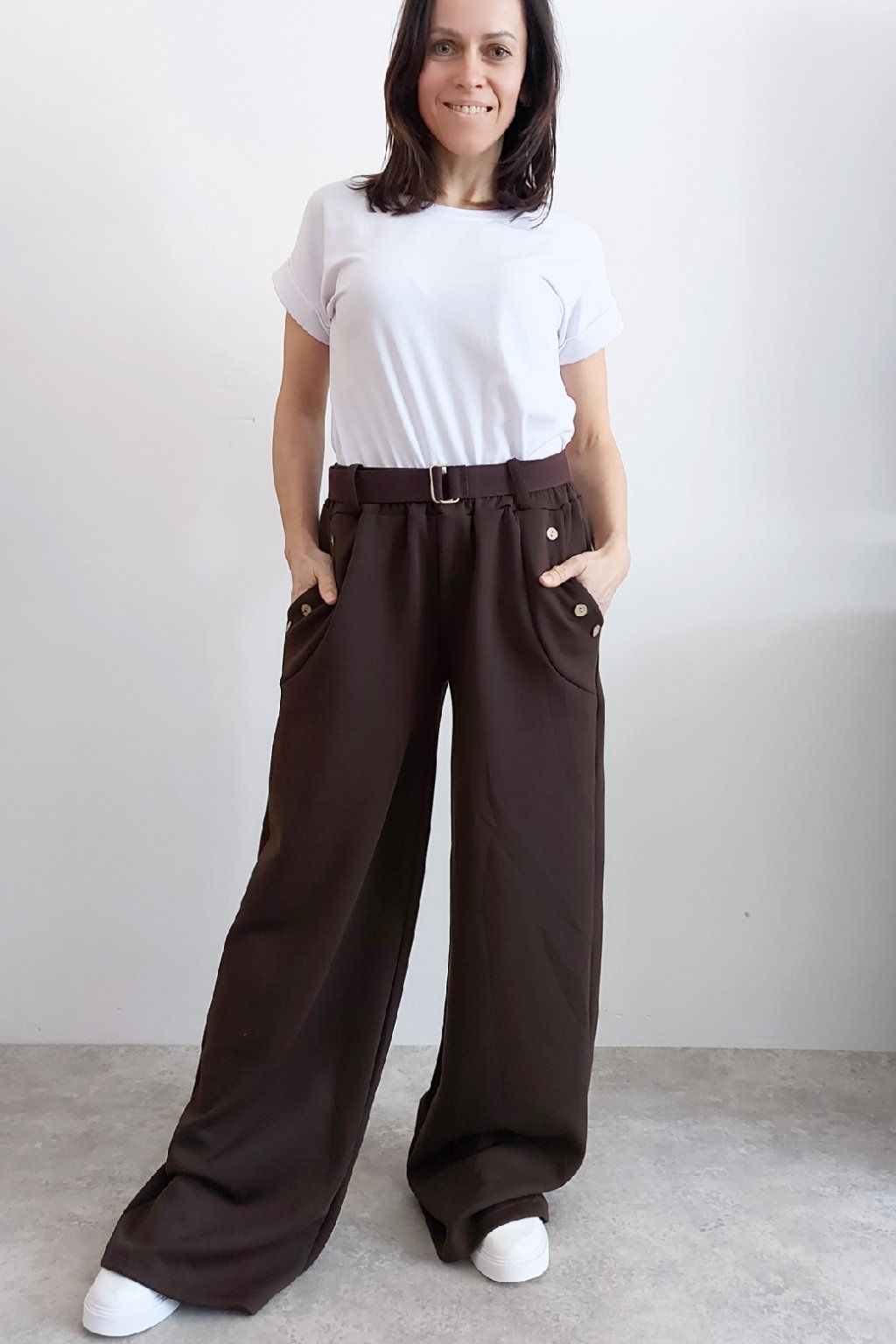 Kalhoty s širokými nohavicemi. V pase guma a pásek s poutky. Přední kapsy, t y jsou zdobené knoflíky, vzadu bez kapes. Materiál máslový - jemný, hebký, silnější, drží tvar, top kvalita. Foceno na vel. XS, výška 156cm i na vel. 2XL (pas 106cm, boky 120cm), výška 165cm, na této velikosti již obeplé.