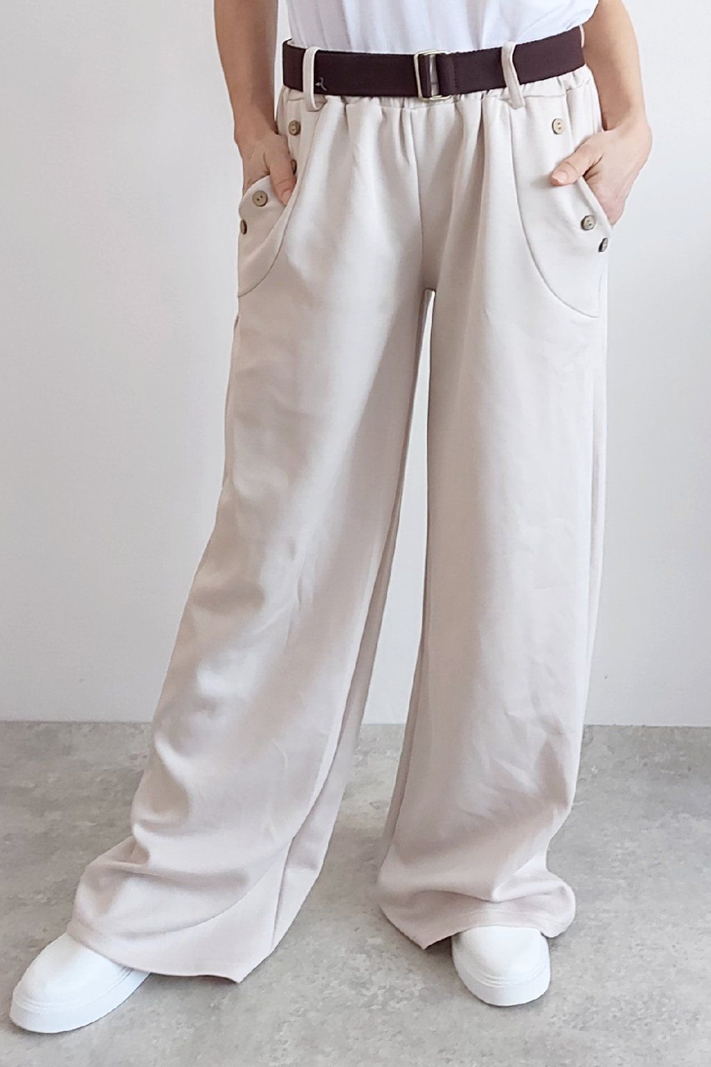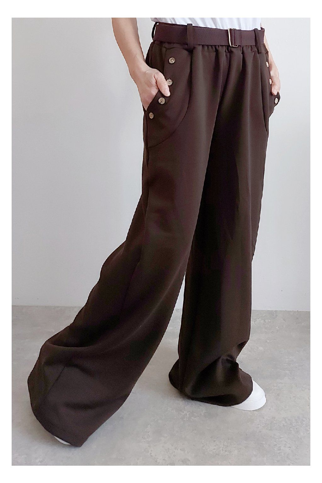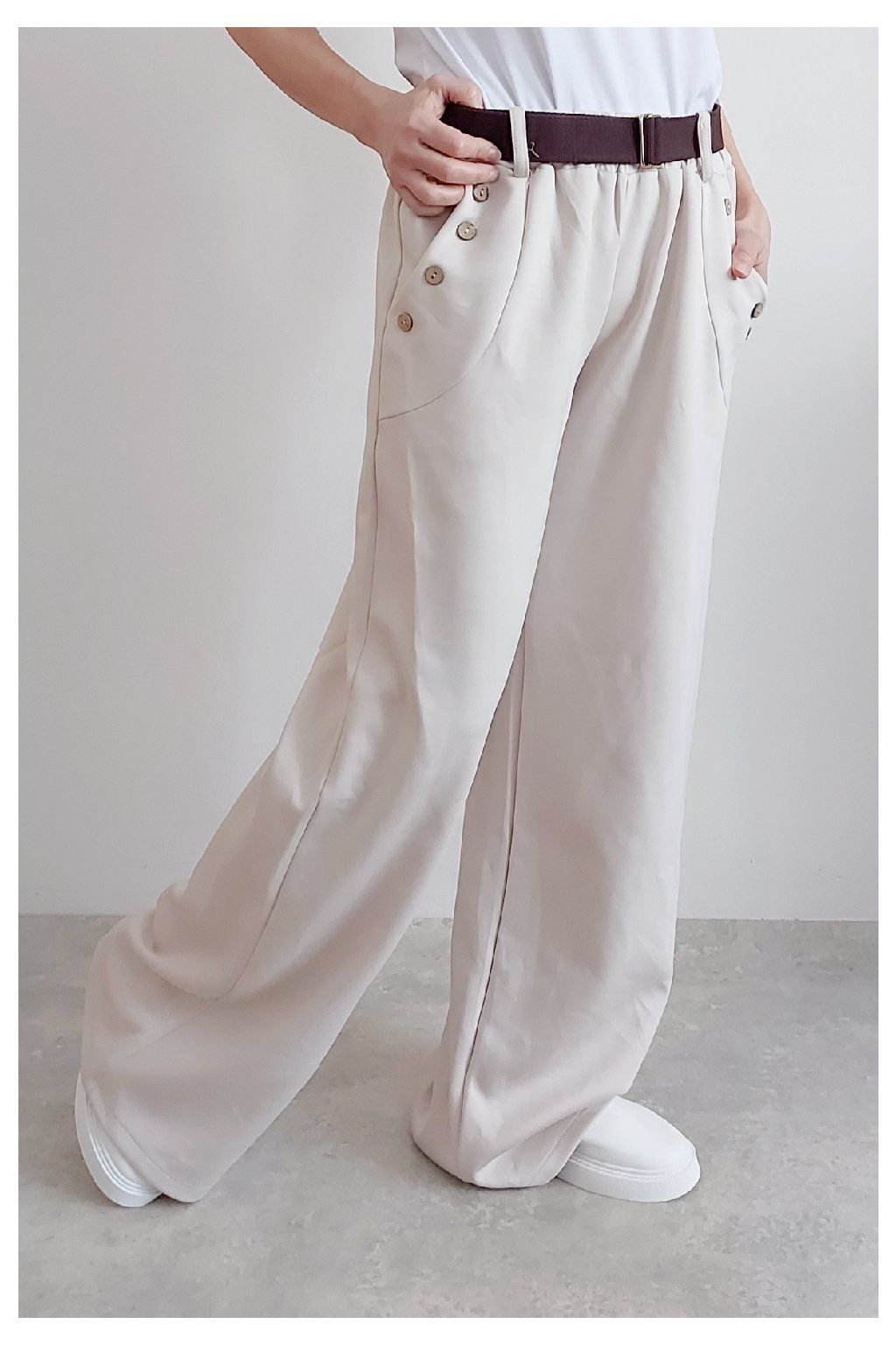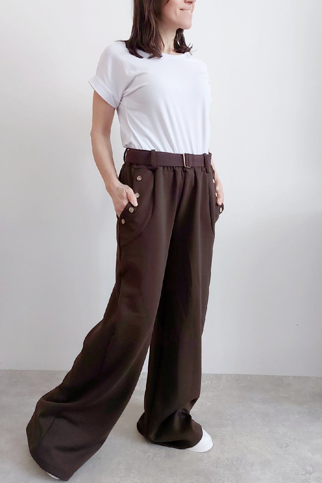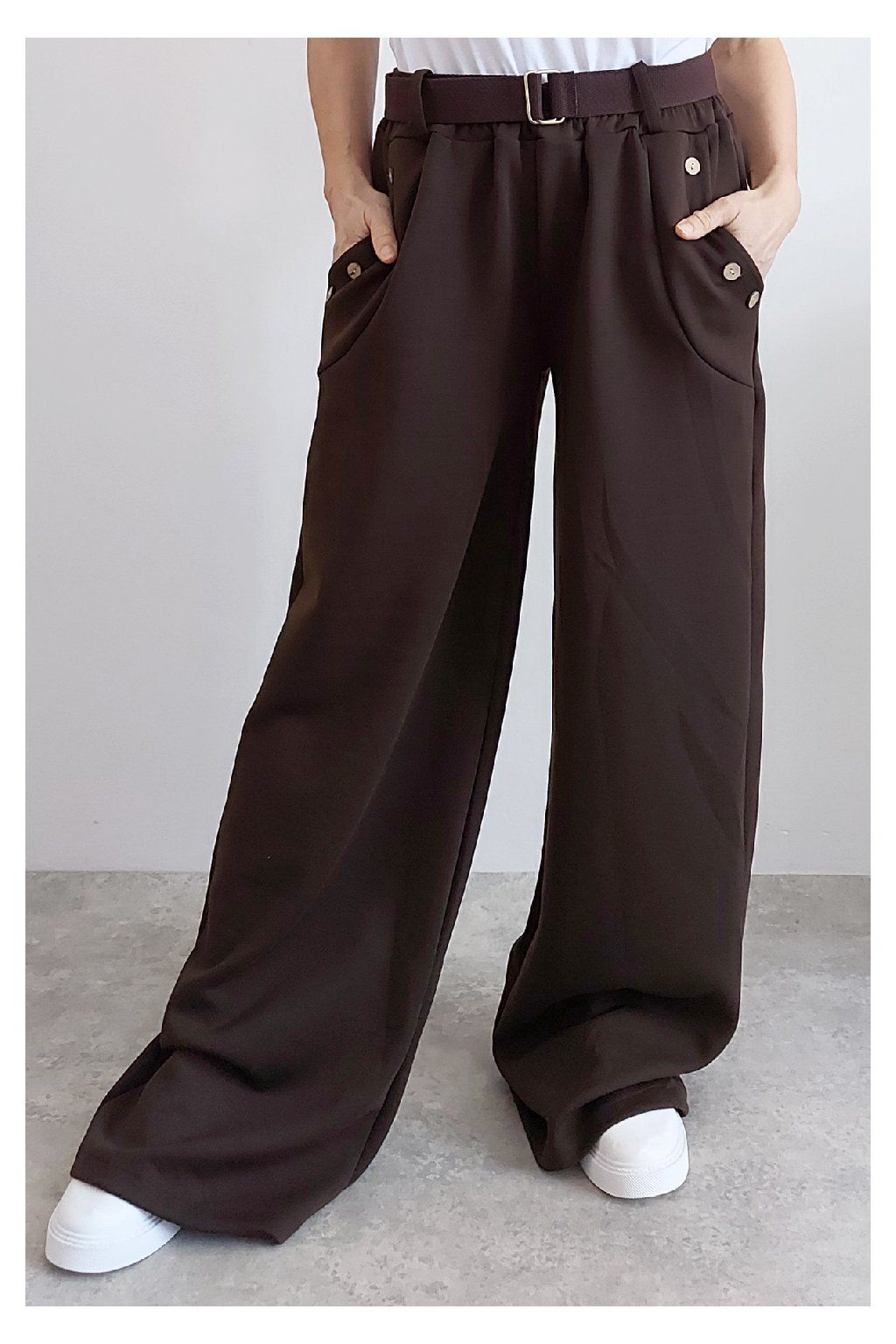 Kalhoty s širokými nohavicemi. V pase guma a pásek s poutky. Přední kapsy, t y jsou zdobené knoflíky, vzadu bez kapes. Materiál máslový - jemný, hebký, silnější, drží tvar, top kvalita. Foceno na vel. XS, výška 156cm i na vel. 2XL (pas 106cm, boky 120cm), výška 165cm, na této velikosti již obeplé.
