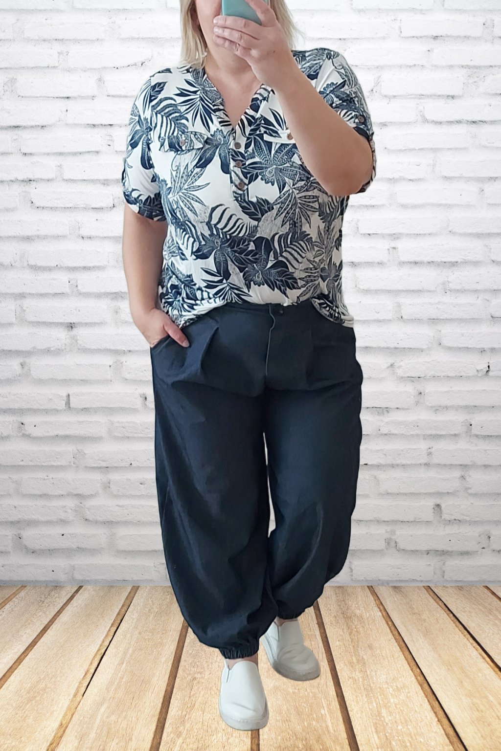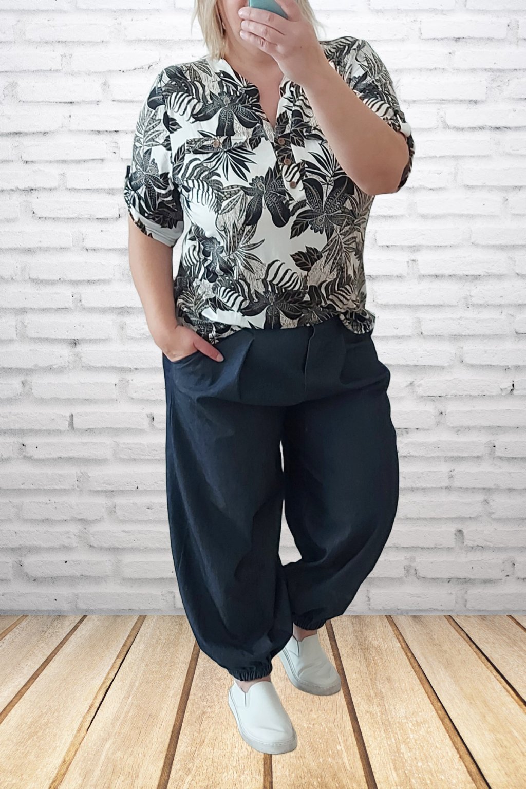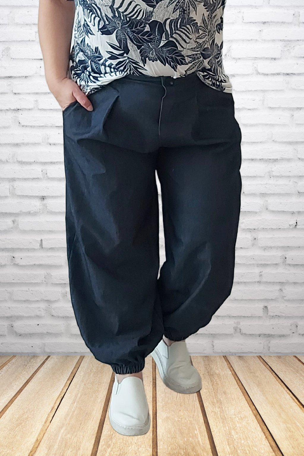 Parádní kalhoty harémové z odlehčené džínoviny. Nohavice jsou ukončené gumkou. V pase je guma, která je viditelná vzadu, vpředu jsou kalhoty řešené okrasným, nefunkčním knoflíkem. V pase jsou efektní záševky. Přední kapsy - vzadu bez kapes. Materiál prémiové kvality. Foceno na vel. 2XL (pas 110cm, boky 120cm), výška 165cm.
