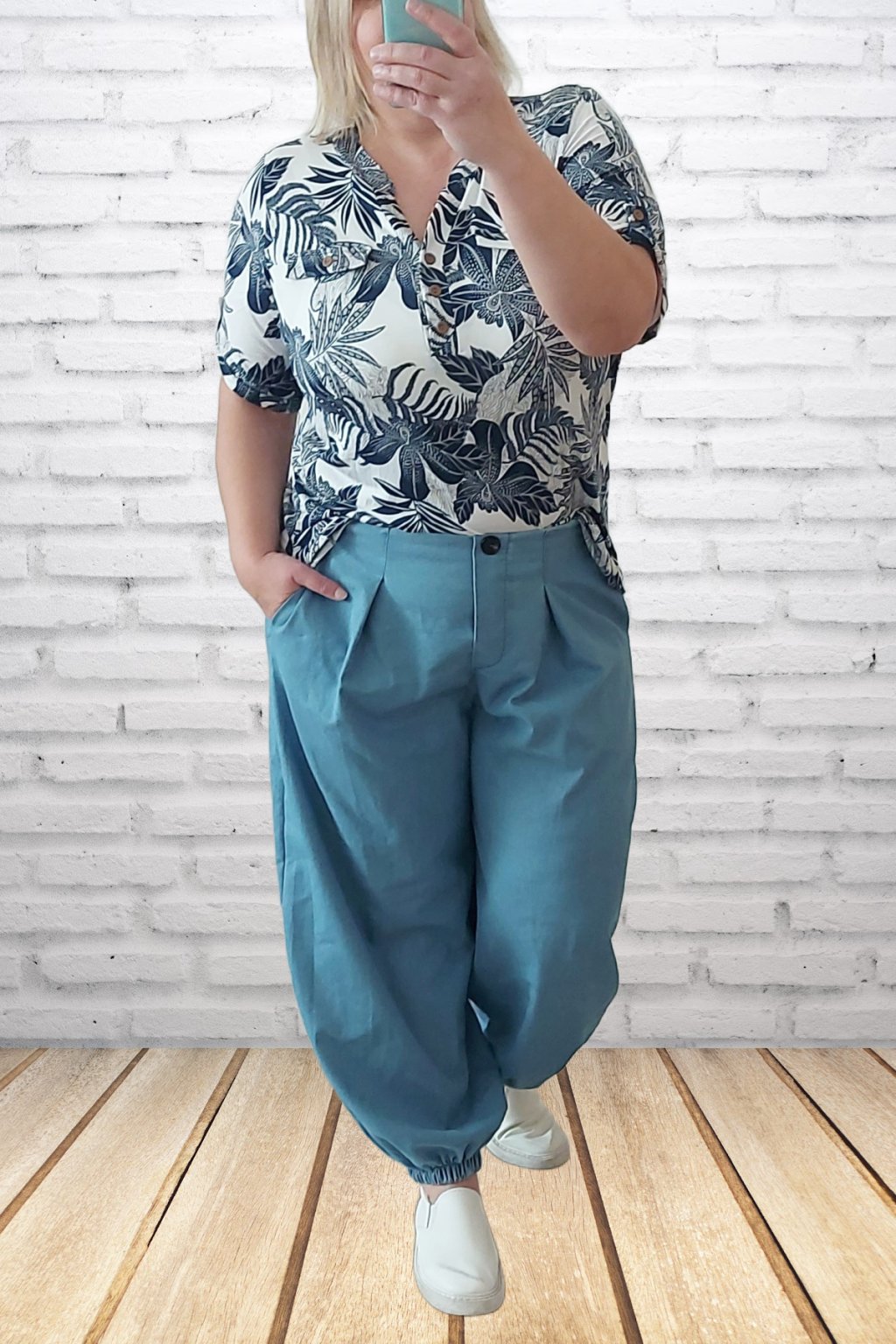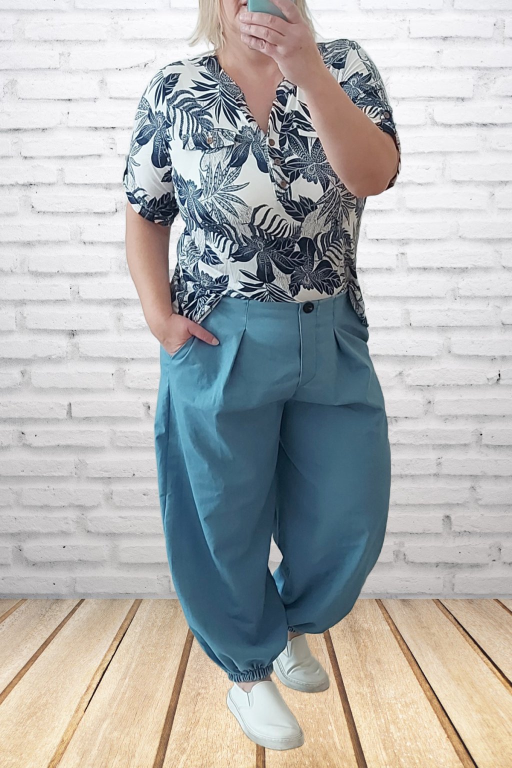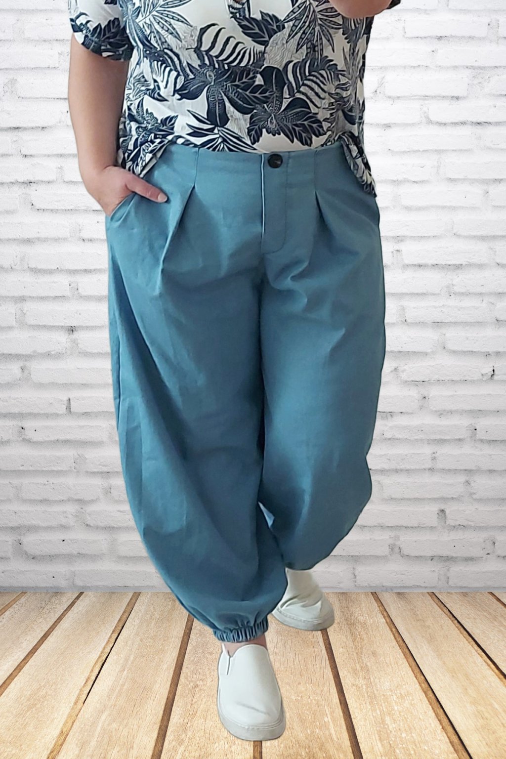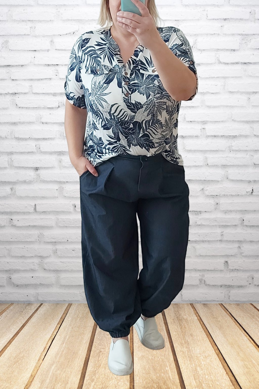 Parádní kalhoty harémové z odlehčené džínoviny. Nohavice jsou ukončené gumkou. V pase je guma, která je viditelná vzadu, vpředu jsou kalhoty řešené okrasným, nefunkčním knoflíkem. V pase jsou efektní záševky. Přední kapsy - vzadu bez kapes. Materiál prémiové kvality. Foceno na vel. 2XL (pas 110cm, boky 120cm), výška 165cm.