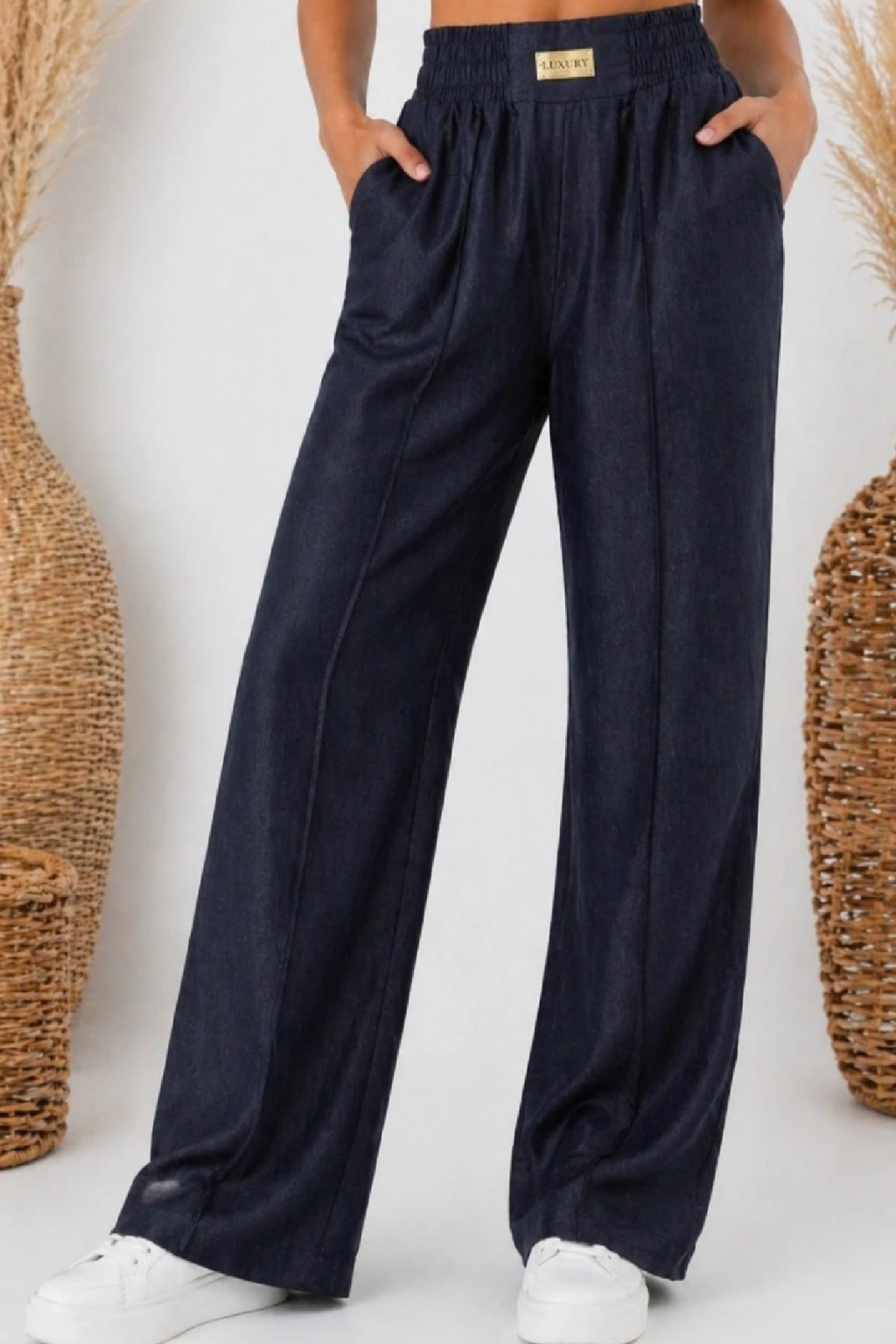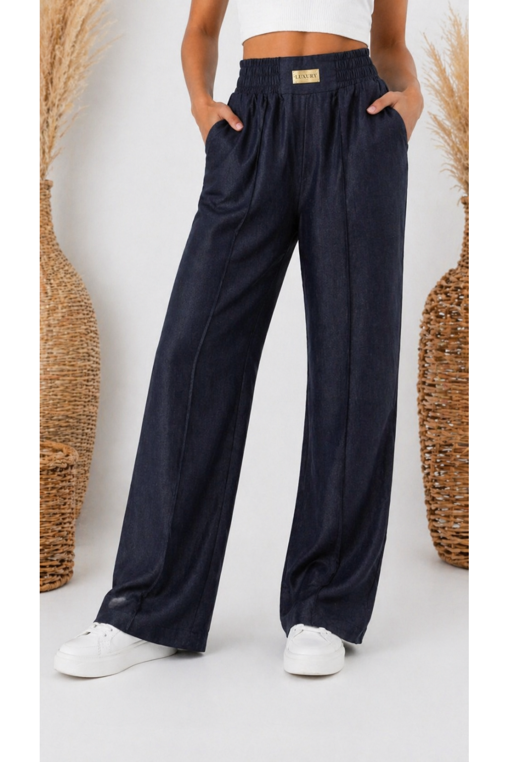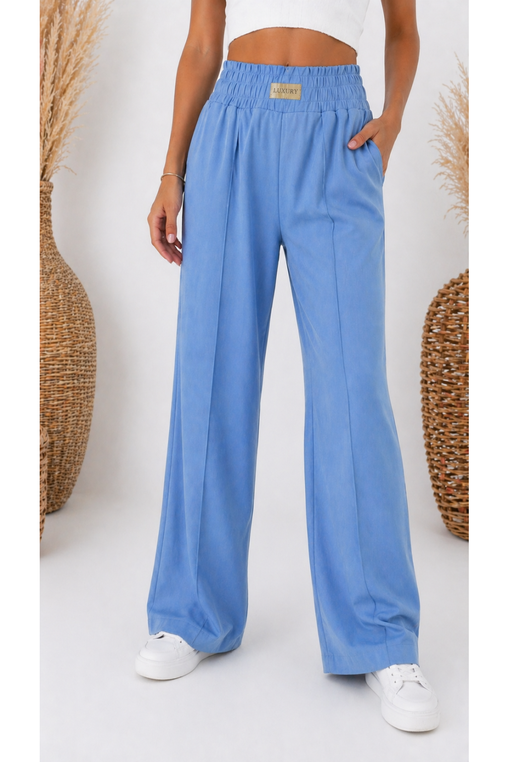Módní kalhoty imitace džínoviny . V pase široká guma a ozdobná nášivka s nápisem Luxury. Přední kapsy, vzadu bez kapes. Po celé délce nohavic jsou puky. Materiál lehký, vzdušný, ideální na jaro a léto.
