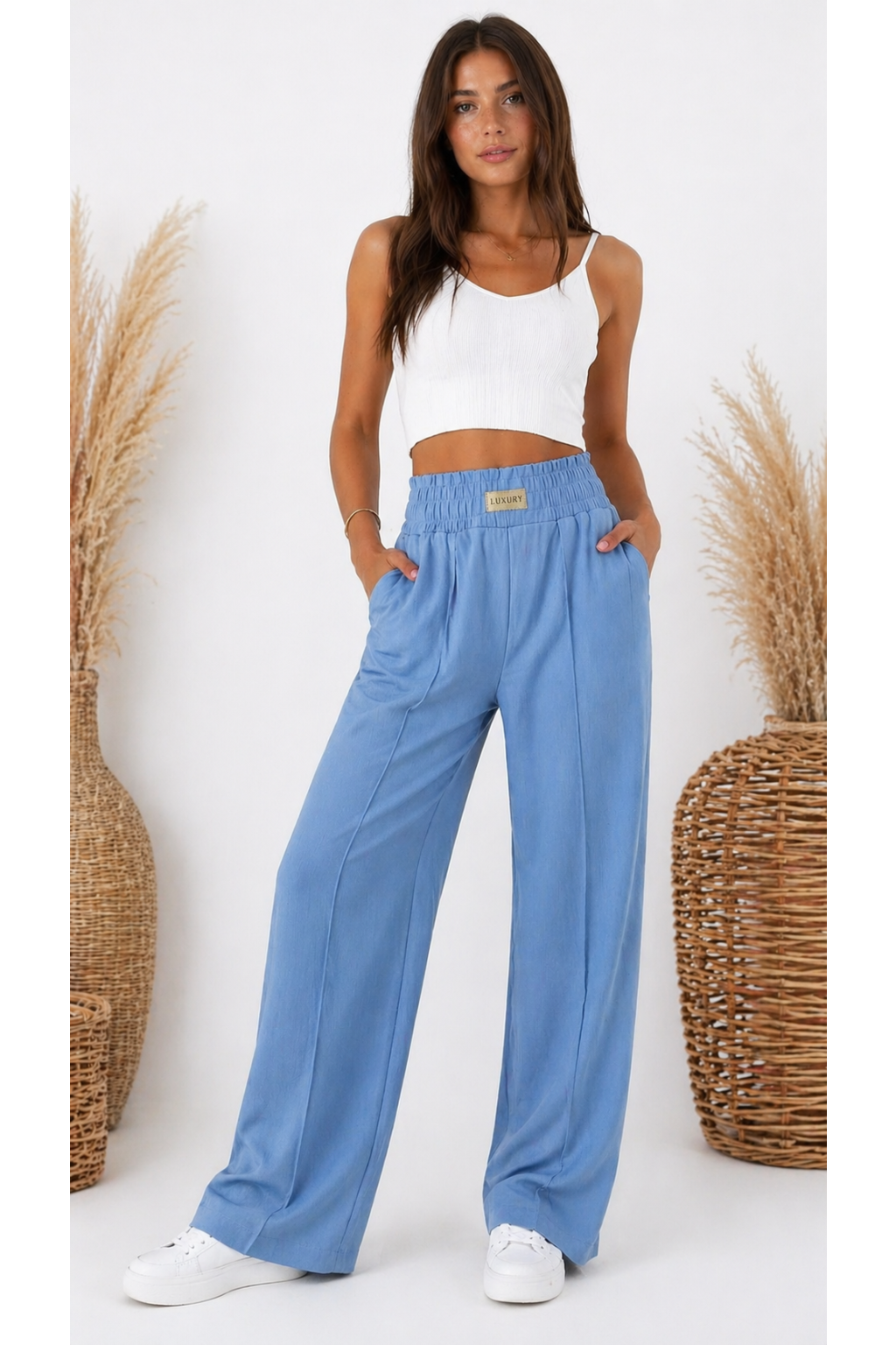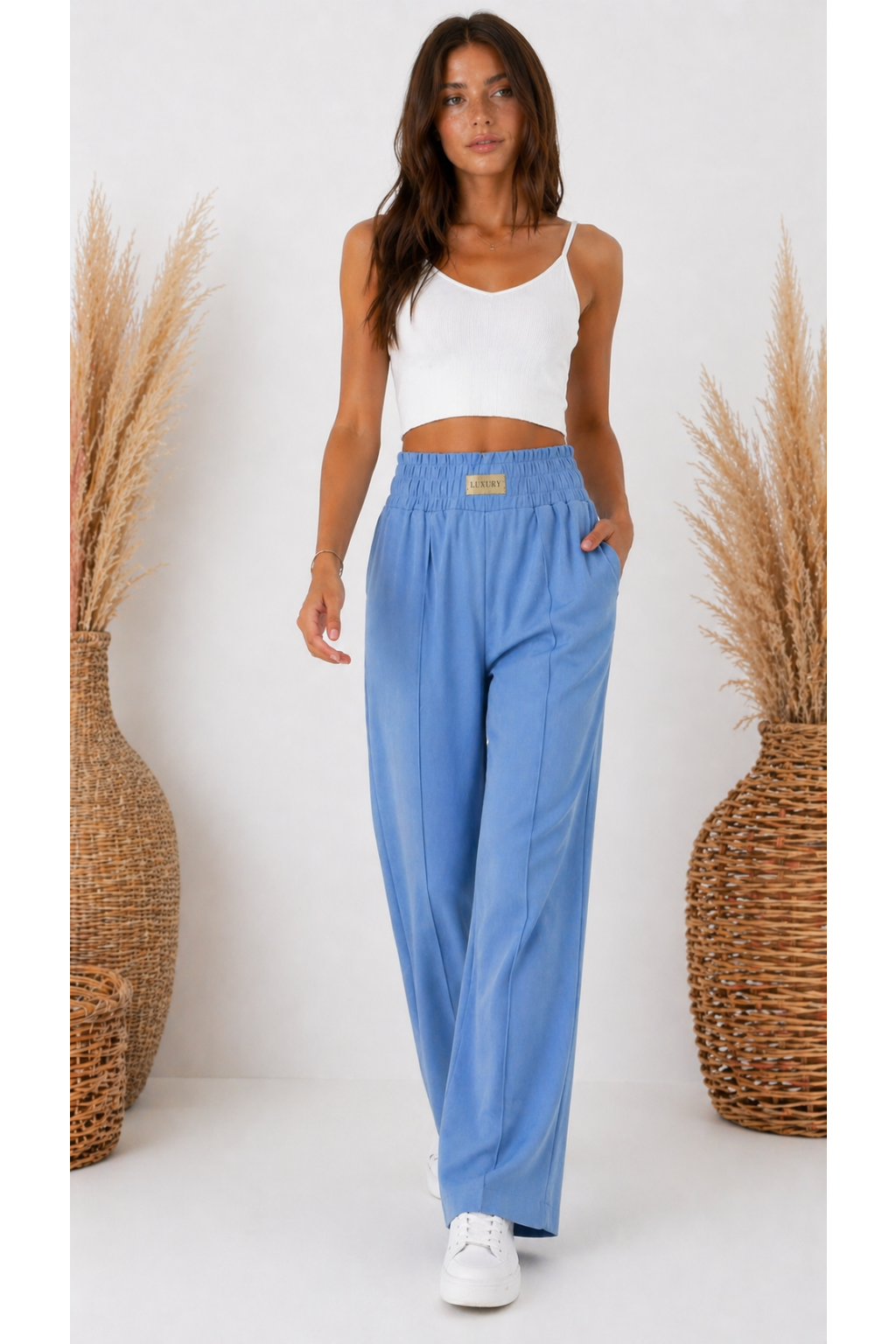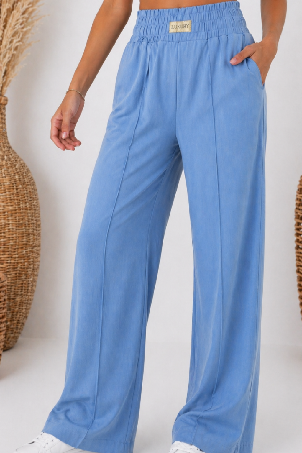 Módní kalhoty imitace džínoviny . V pase široká guma a ozdobná nášivka s nápisem Luxury. Přední kapsy, vzadu bez kapes. Po celé délce nohavic jsou puky. Materiál lehký, vzdušný, ideální na jaro a léto.
