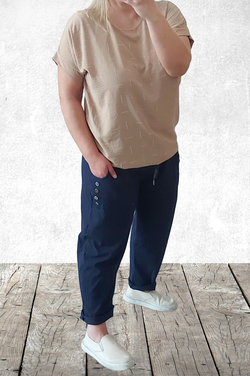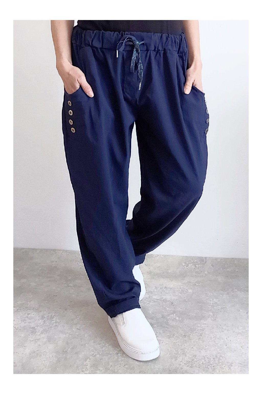 Super pohodlné a pružné dlouhé kalhoty ve světle modré jeans barvě. U kapes jsou našité ozdobné kovové knoflíky. V pase guma a šňůrka pro stažení obvodu. Přední kapsy, vzadu bez kapes. Pro větší velikosti. Materiál velmi pružný, na těle velmi příjemný. Foceno na vel. XS, výška 156cm i na vel. 2XL/3XL (pas 110cm, boky 119cm), výška 165cm.