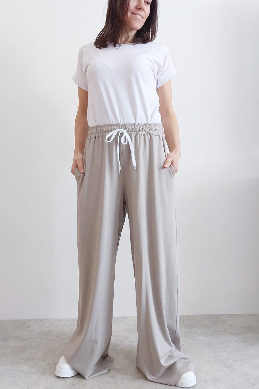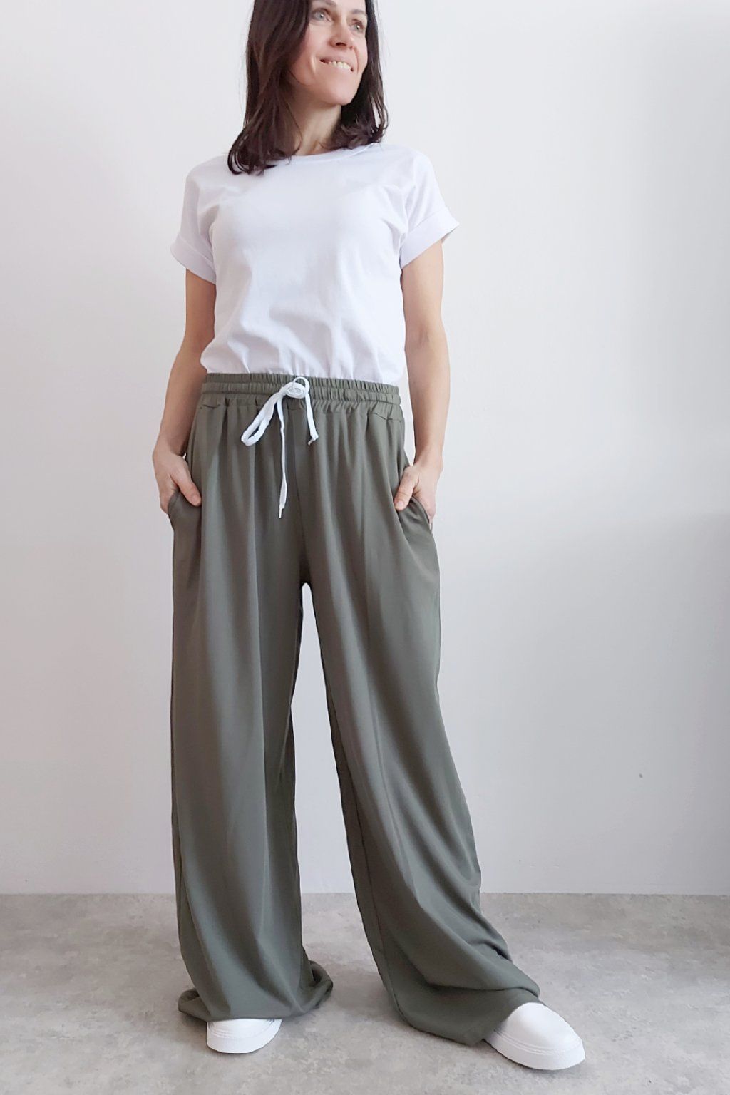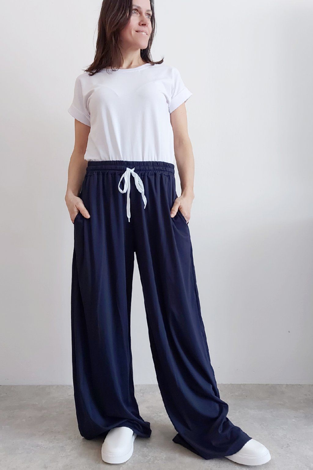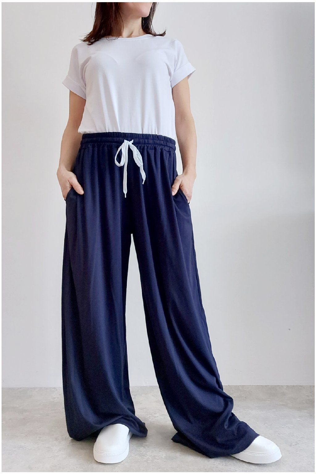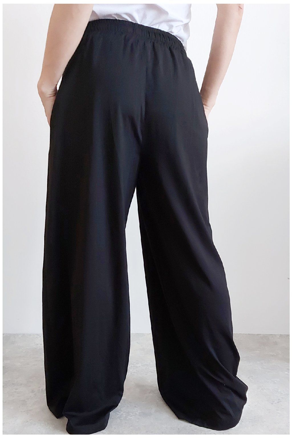 Kalhoty s širokými nohavicemi. V pase guma a šňůrka pro stažení obvodu. Přední kapsy, vzadu bez kapes. Sed klasický. Materiál je prvotřídní kvality. Máslový, tenčí - jemný, hebký, nadýchaný, na těle lehce chladivý a super pružný. Foceno na vel. XS, výška 156cm i na vel. 2XL (pas 108cm, boky 121cm), výška 165cm.