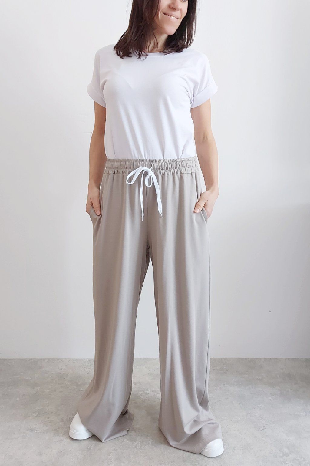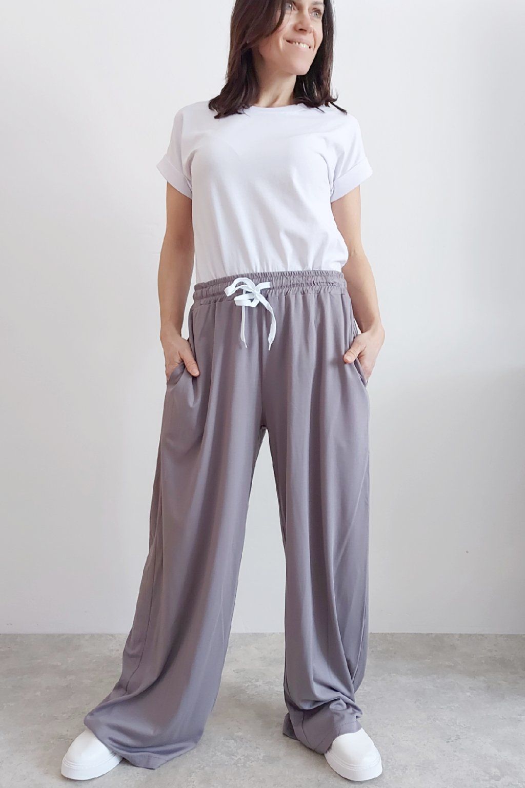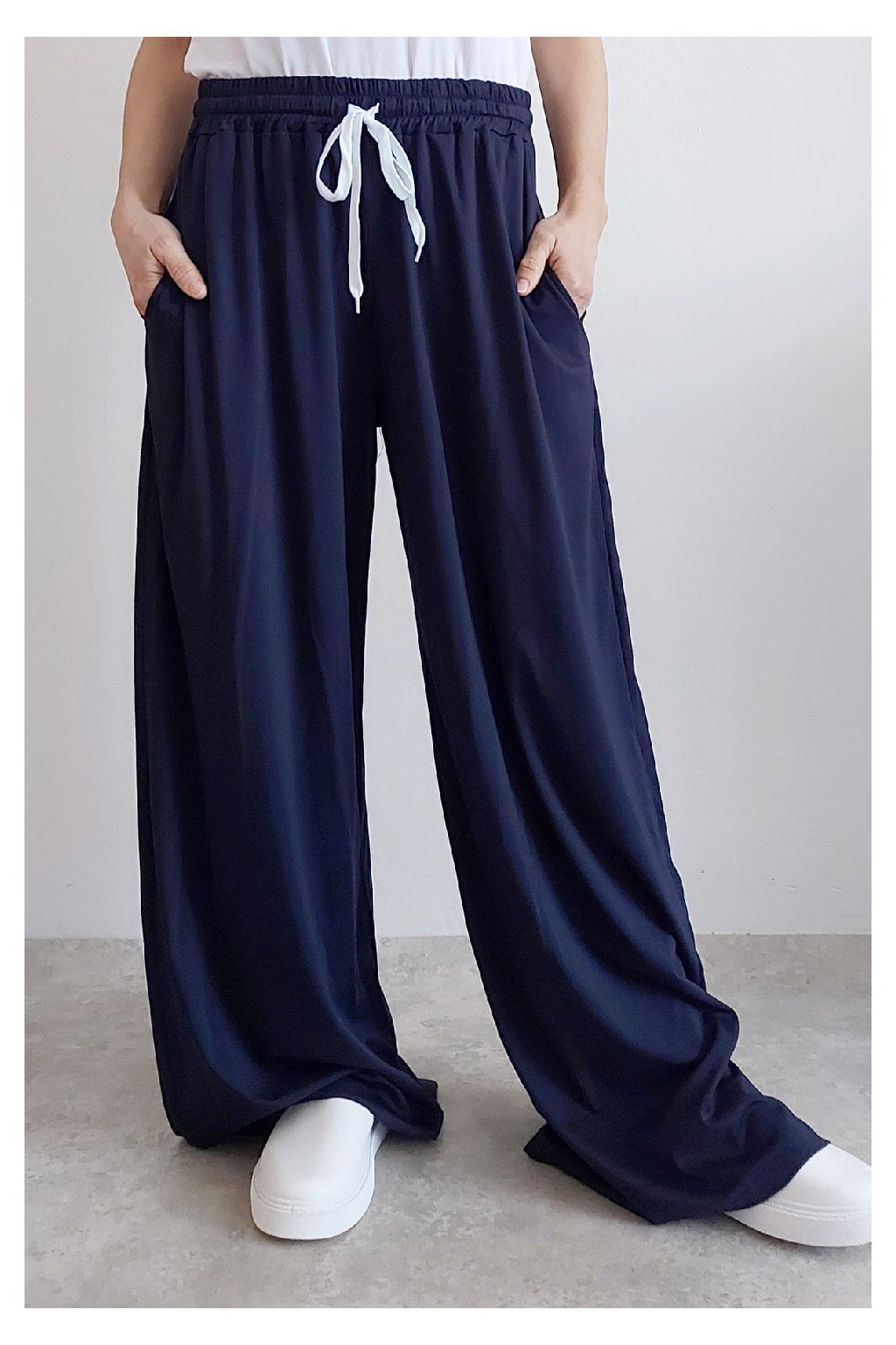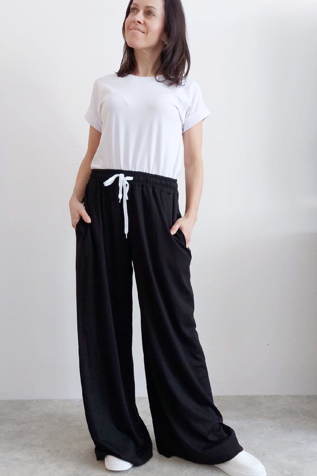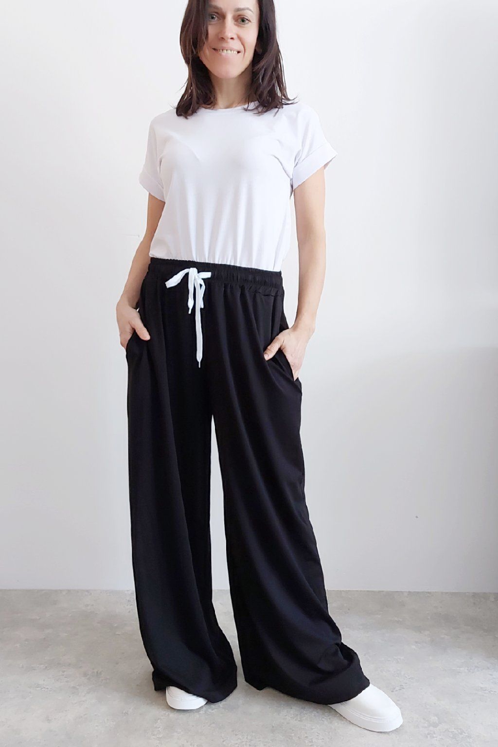 Kalhoty s širokými nohavicemi. V pase guma a šňůrka pro stažení obvodu. Přední kapsy, vzadu bez kapes. Sed klasický. Materiál je prvotřídní kvality. Máslový, tenčí - jemný, hebký, nadýchaný, na těle lehce chladivý a super pružný. Foceno na vel. XS, výška 156cm i na vel. 2XL (pas 108cm, boky 121cm), výška 165cm.