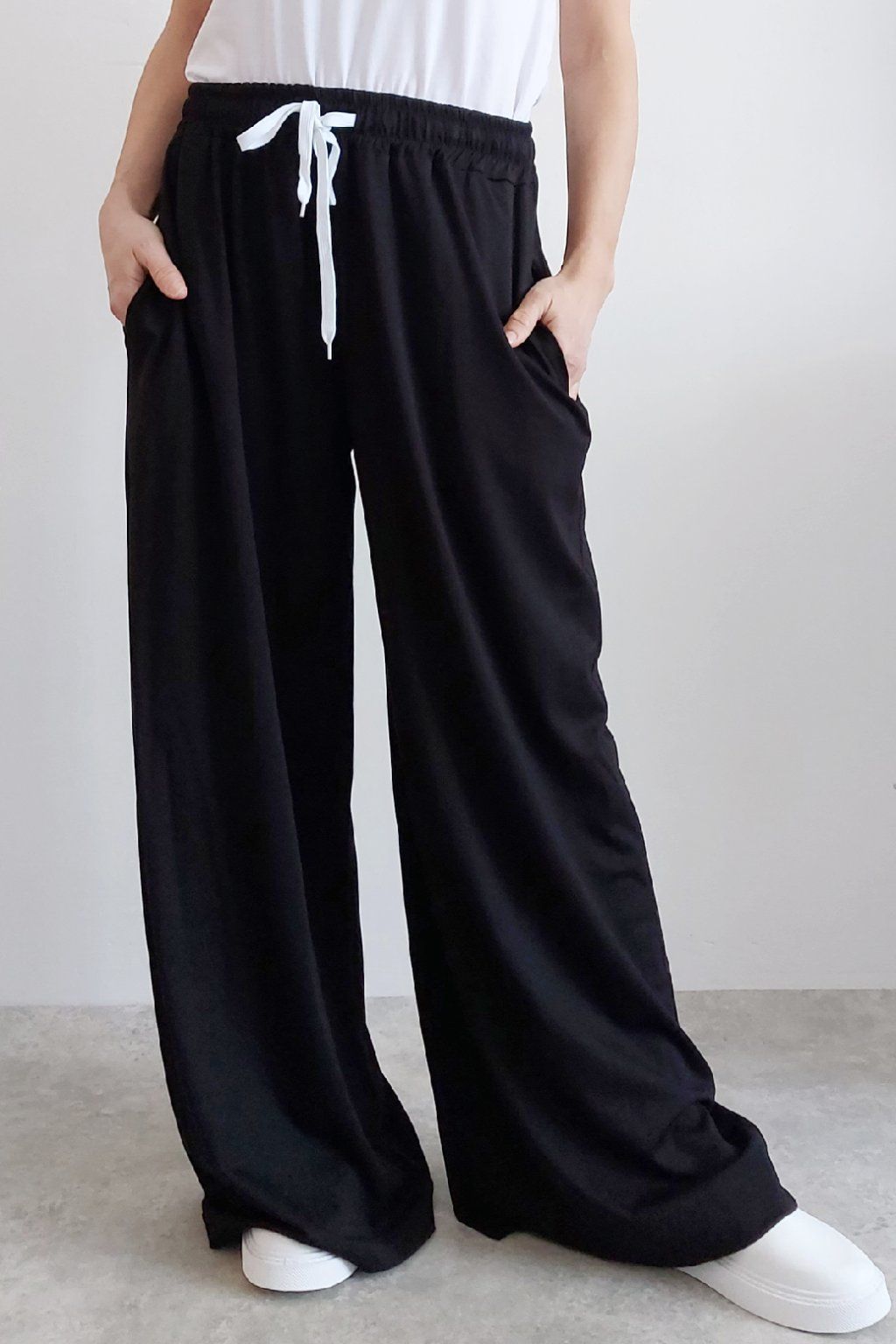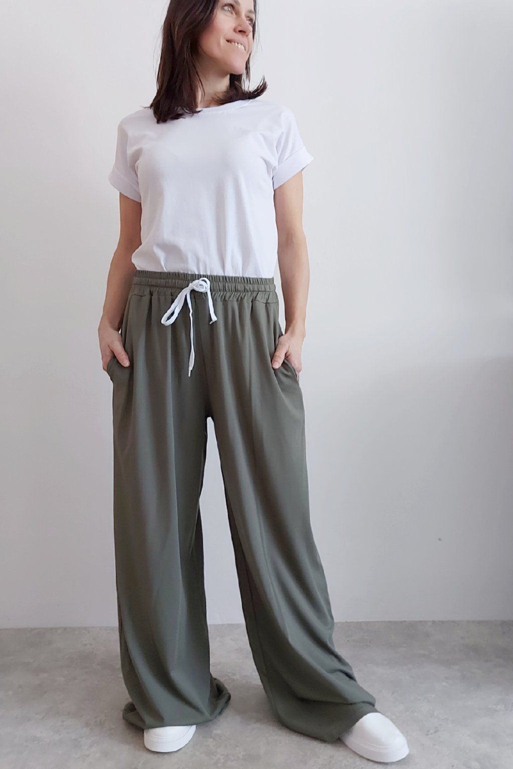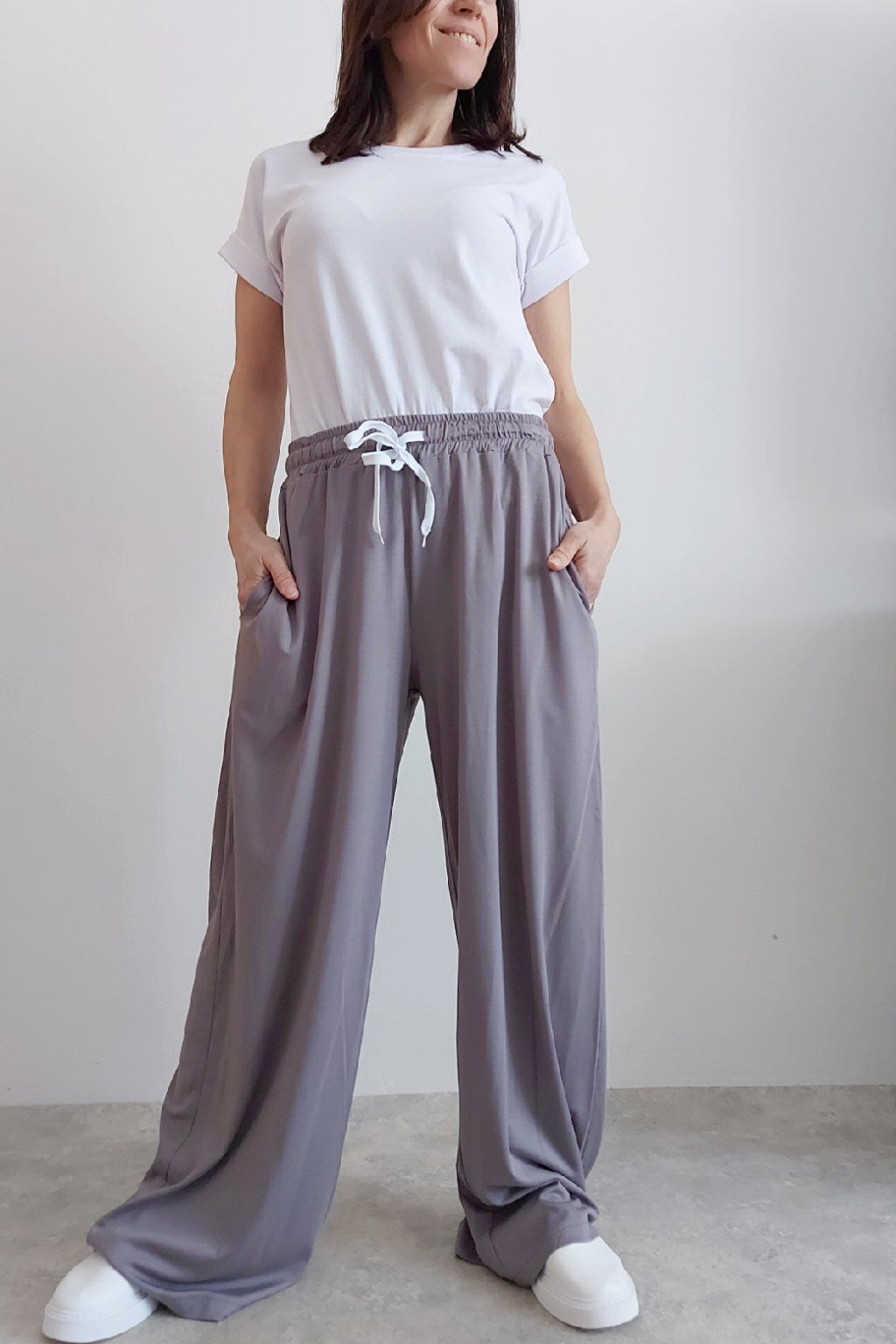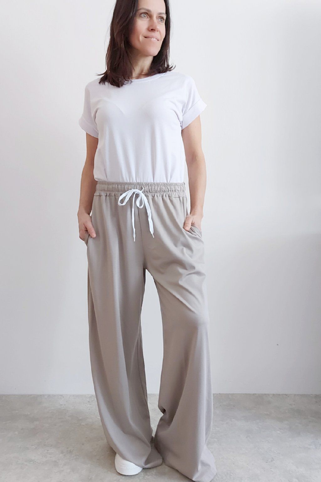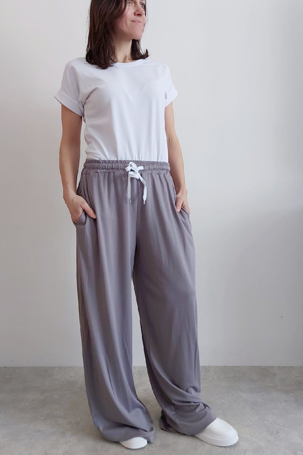 Kalhoty s širokými nohavicemi. V pase guma a šňůrka pro stažení obvodu. Přední kapsy, vzadu bez kapes. Sed klasický. Materiál je prvotřídní kvality. Máslový, tenčí - jemný, hebký, nadýchaný, na těle lehce chladivý a super pružný. Foceno na vel. XS, výška 156cm i na vel. 2XL (pas 108cm, boky 121cm), výška 165cm.