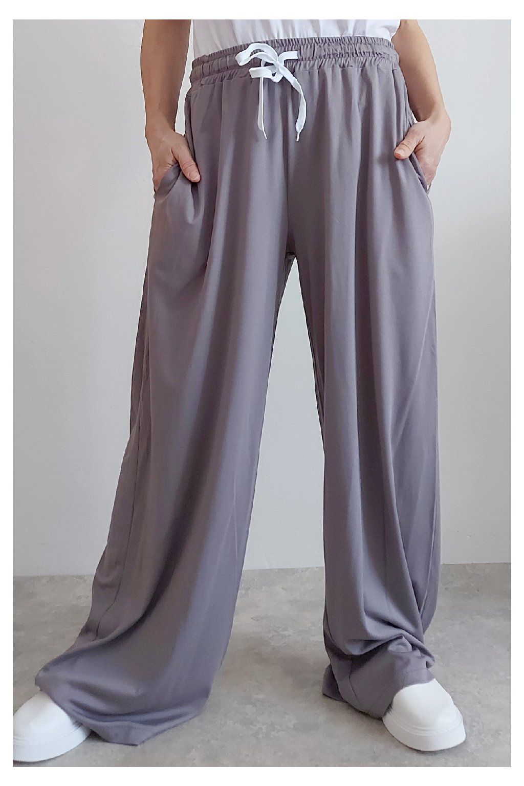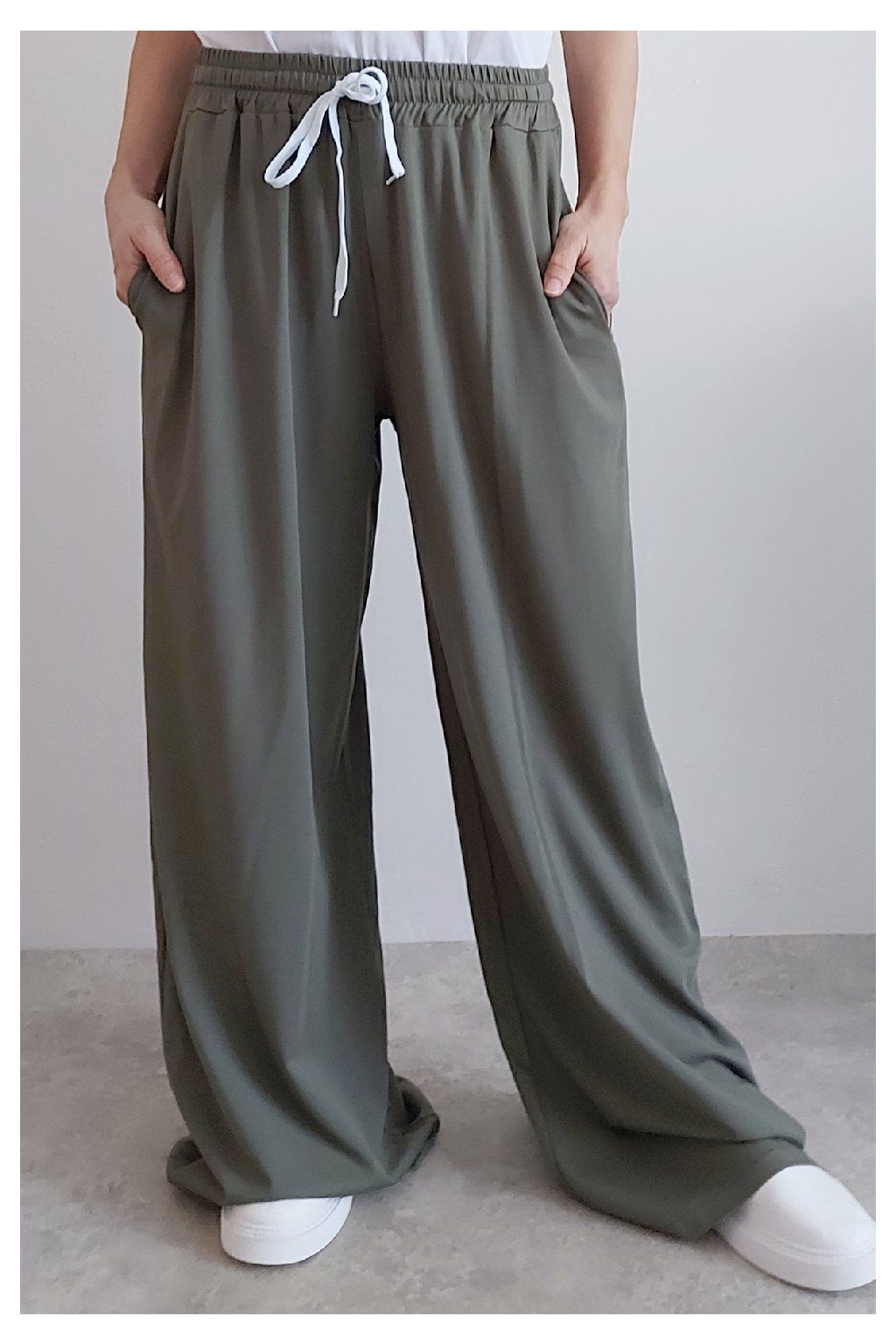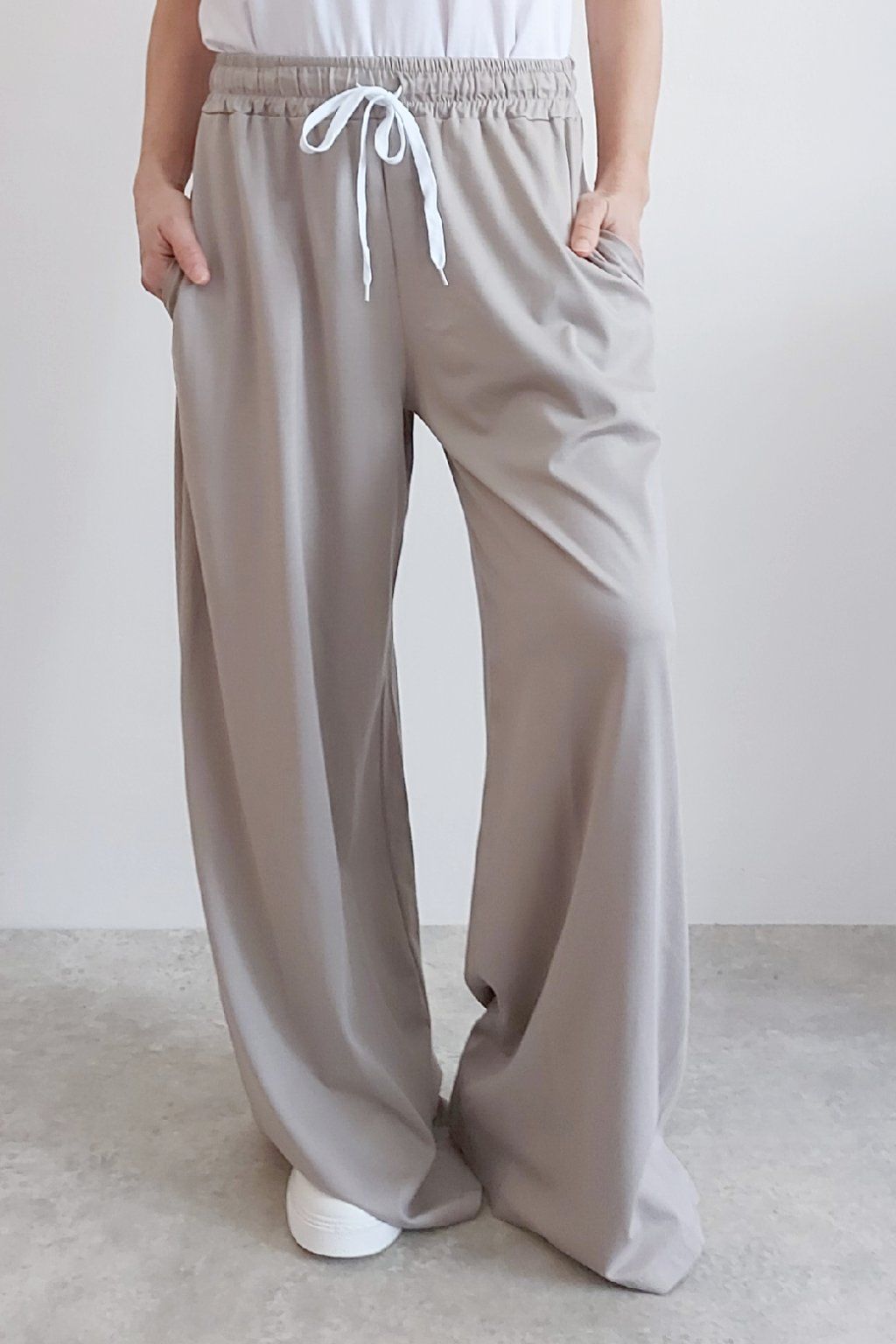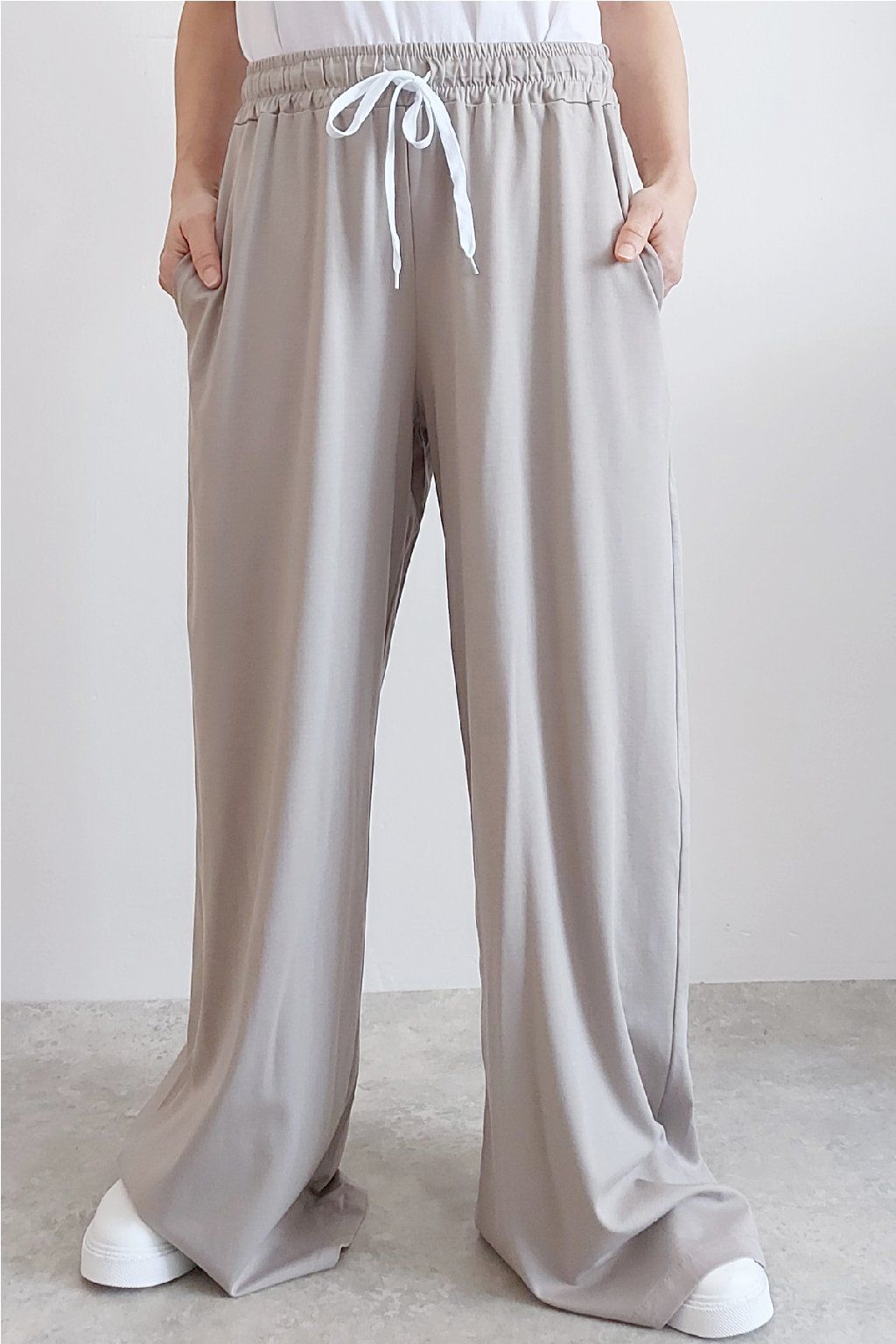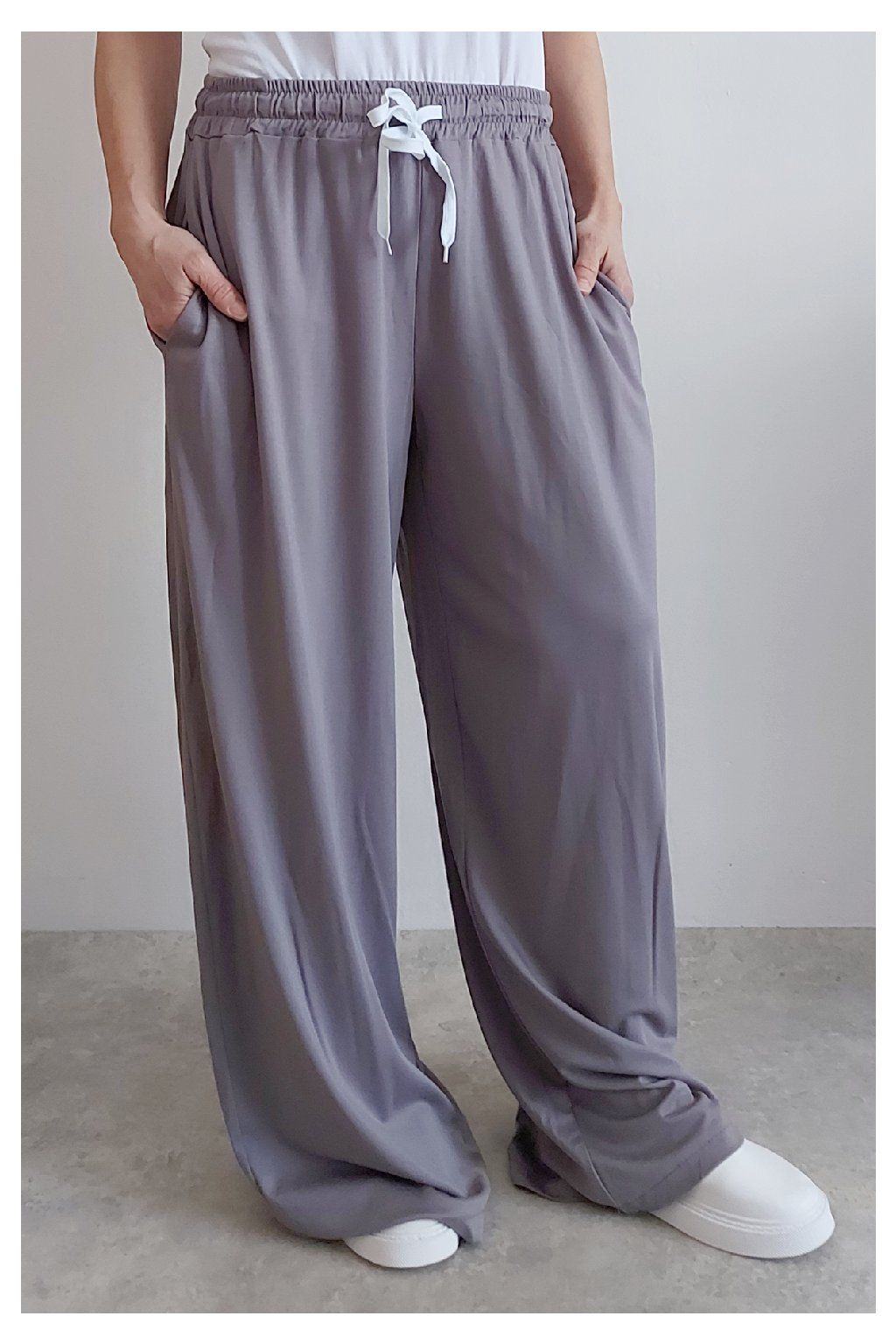 Kalhoty s širokými nohavicemi. V pase guma a šňůrka pro stažení obvodu. Přední kapsy, vzadu bez kapes. Sed klasický. Materiál je prvotřídní kvality. Máslový, tenčí - jemný, hebký, nadýchaný, na těle lehce chladivý a super pružný. Foceno na vel. XS, výška 156cm i na vel. 2XL (pas 108cm, boky 121cm), výška 165cm.