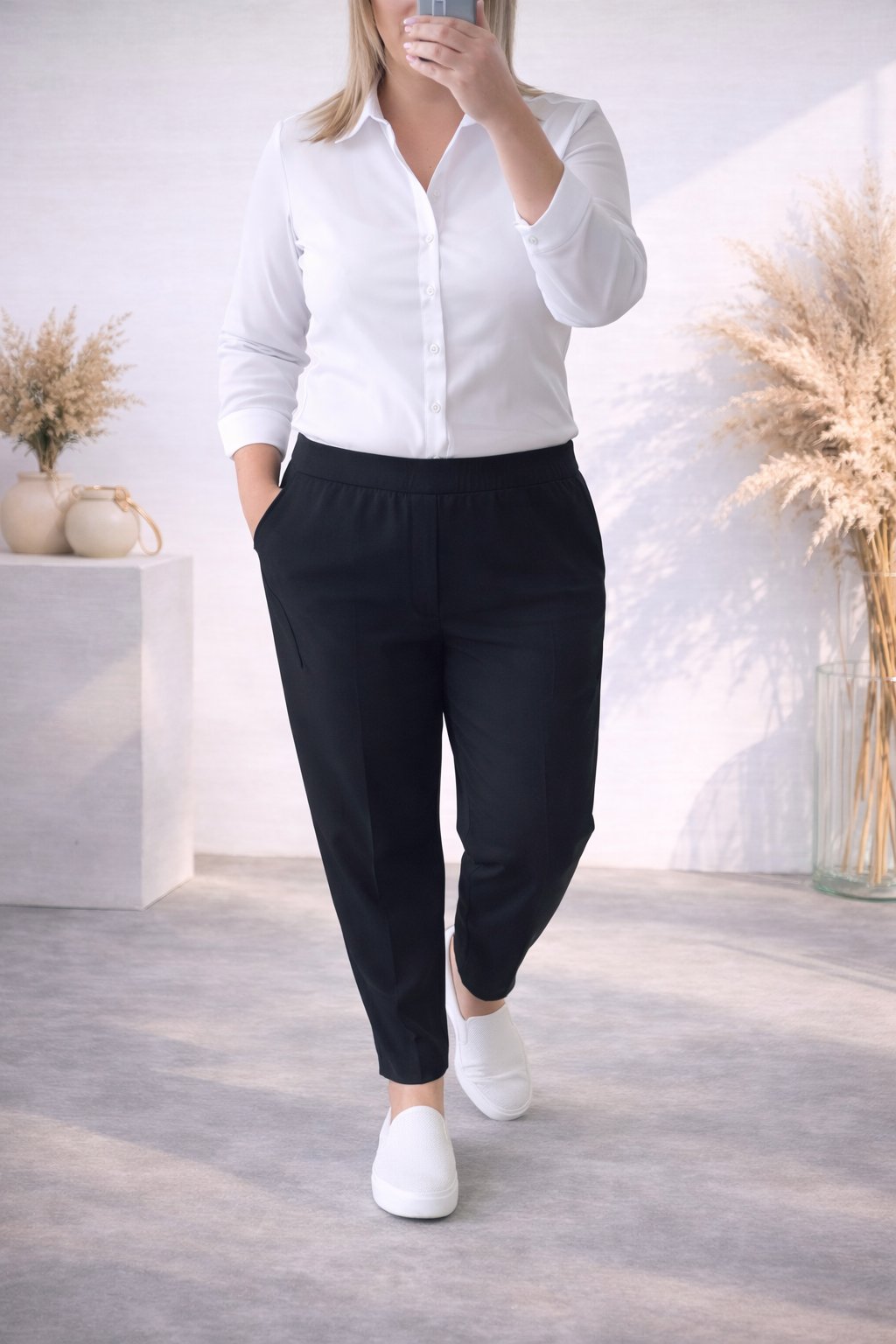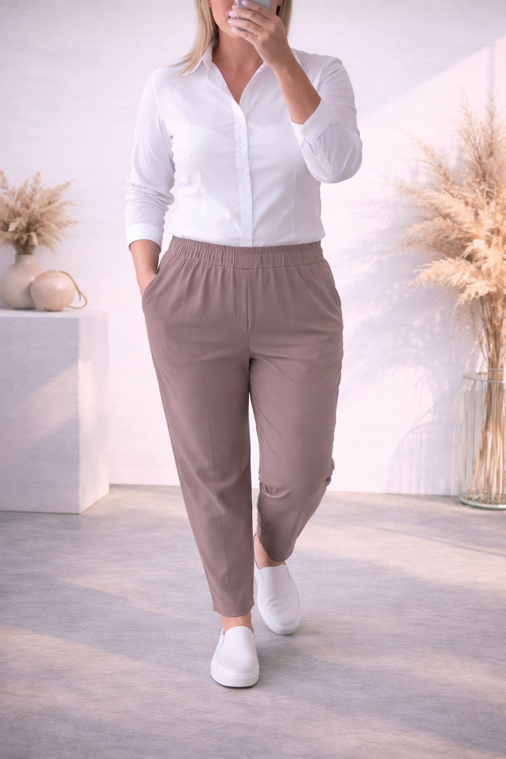 Skvělé kalhoty se 7/8 nohavicemi, vhodné i pro slavnostnější příležitost. V pase do gumy. Přední kapsy, vzadu jedna kapsa. Sed klasický. Nohavice v místě stehen široké, ve spodní části užší a zdobené švem. Luxusní, vysoce kvalitní materiál. Foceno na vel. XS, výška 156cm i na vel. 2XL (pas 110cm, boky 120cm), výška 165cm.