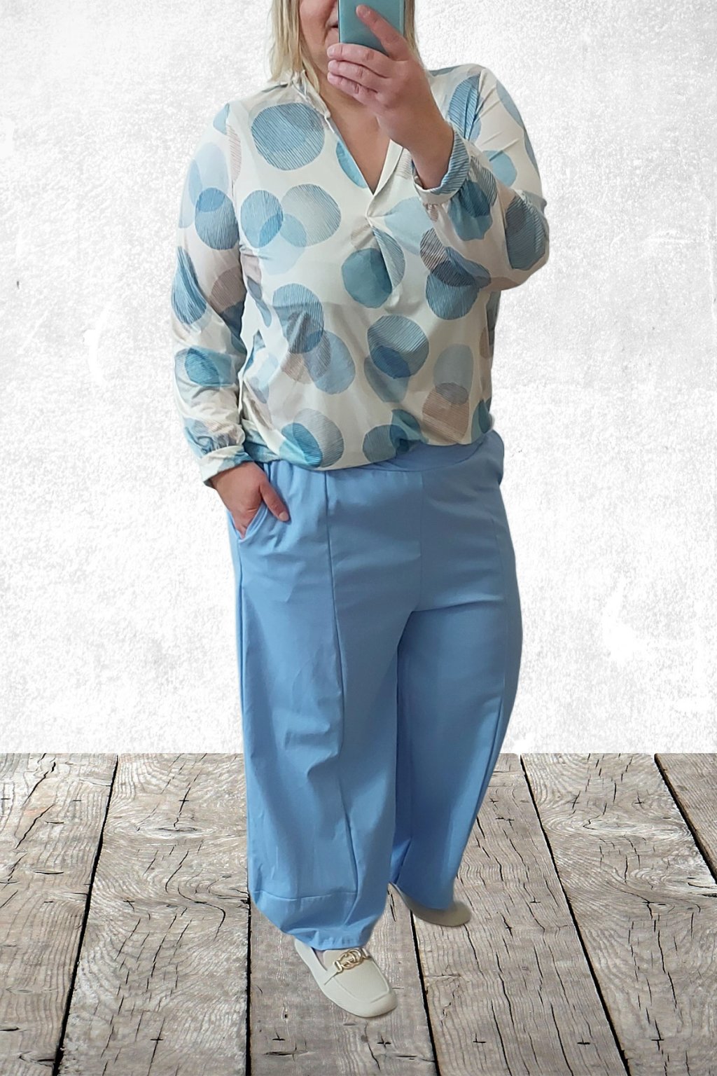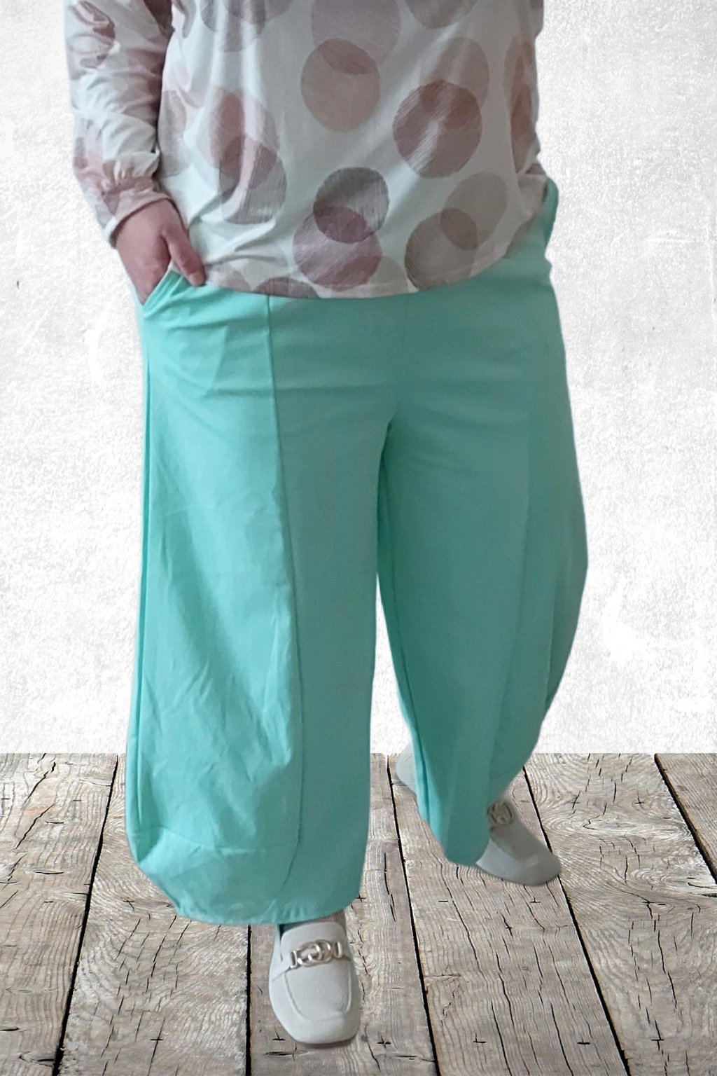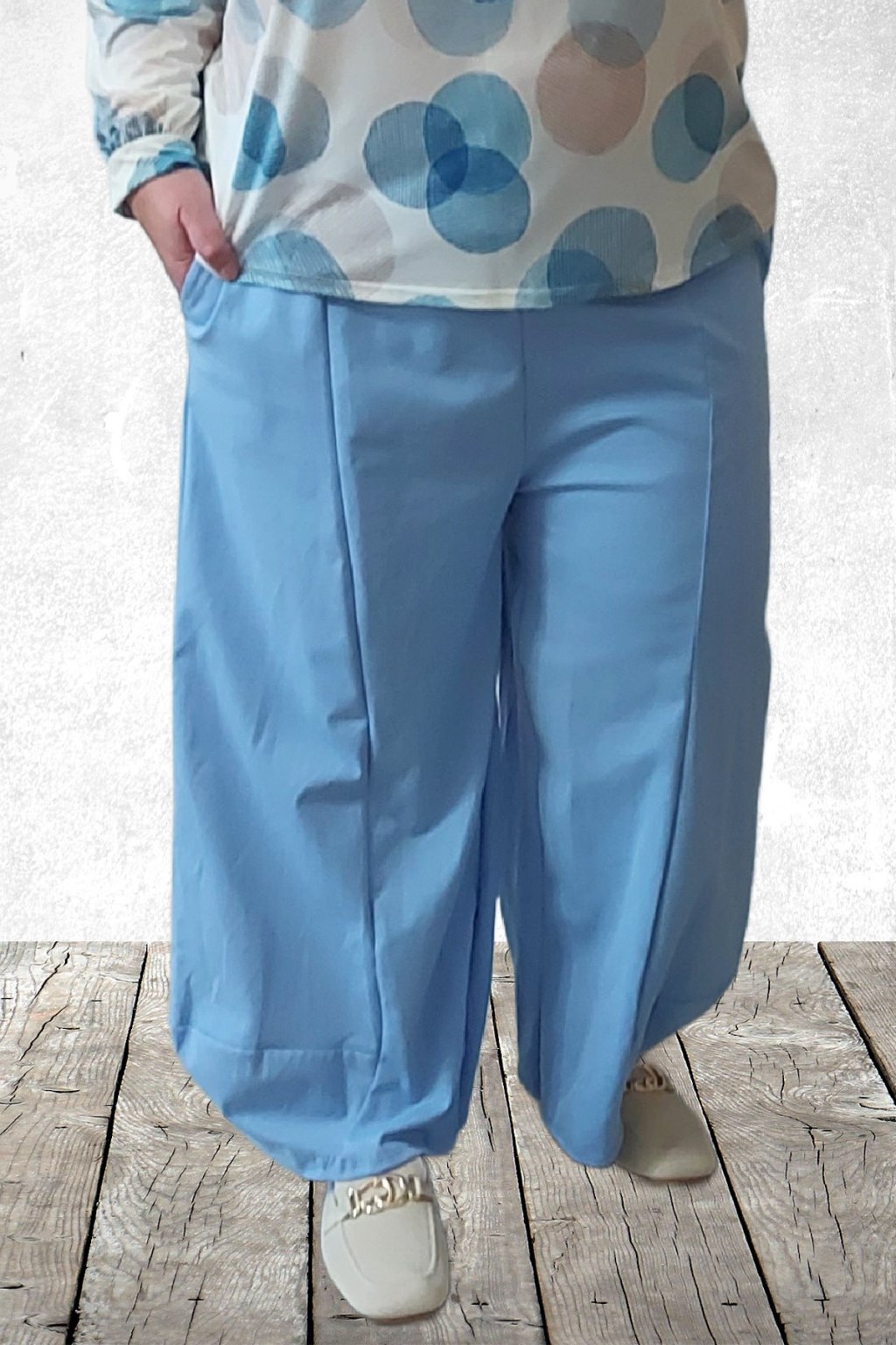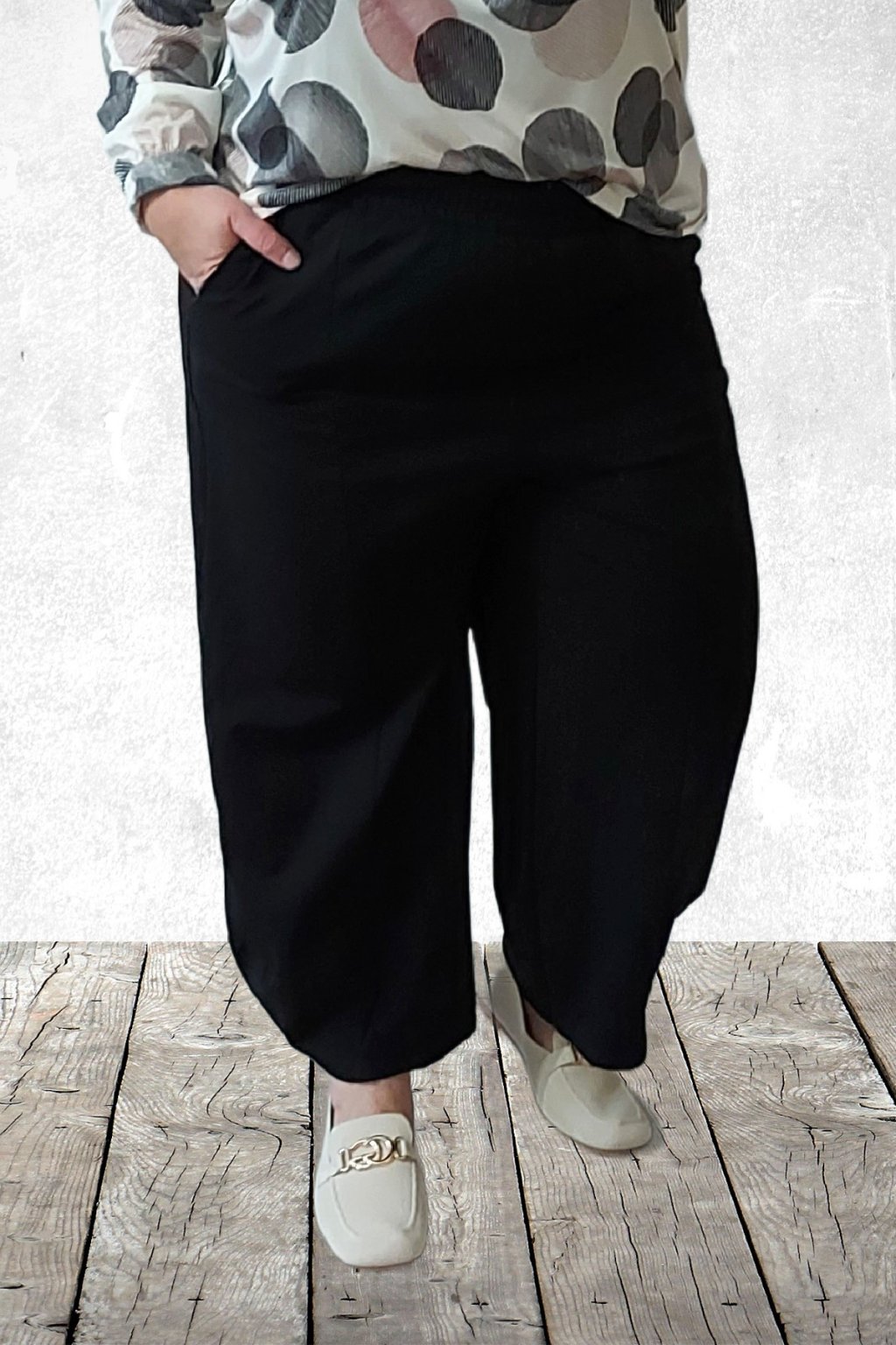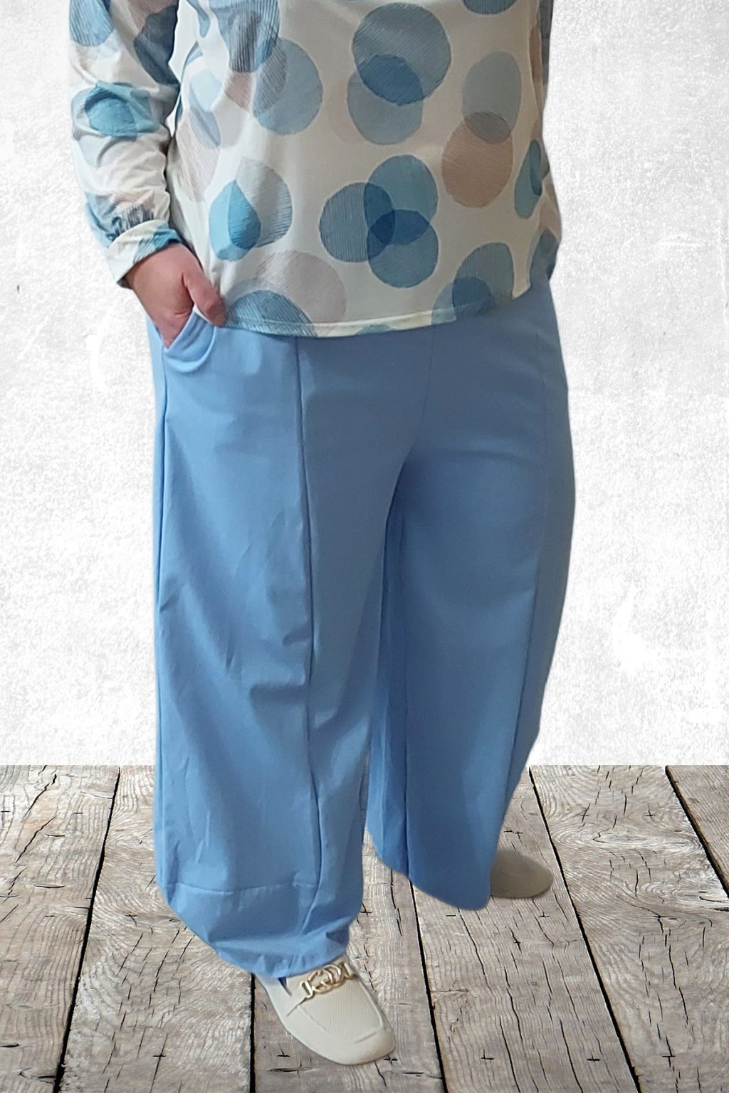 Kalhoty s extra širokými nohavicemi. V pase guma. Přední kapsy - vzadu bez kapes. Vysoce kvalitní materiál, vhodný i pro slavnostní příležitost. Foceno na vel. 2XL (pas 110cm, boky 120cm), výška 165cm.