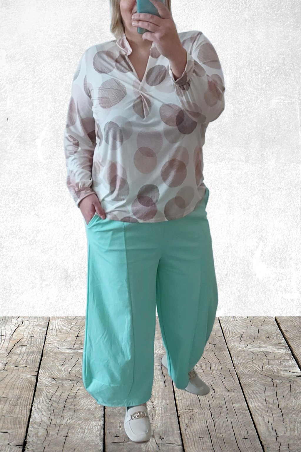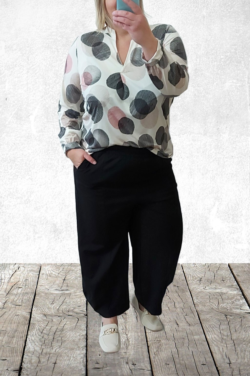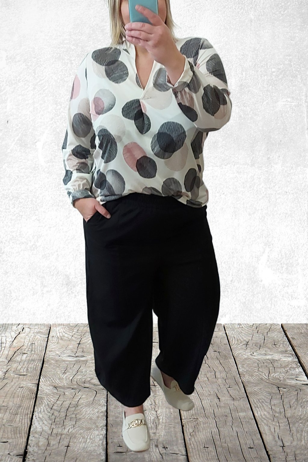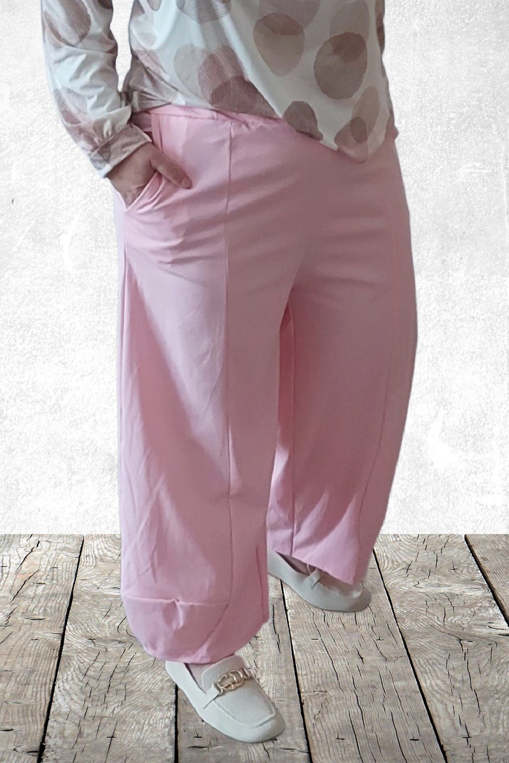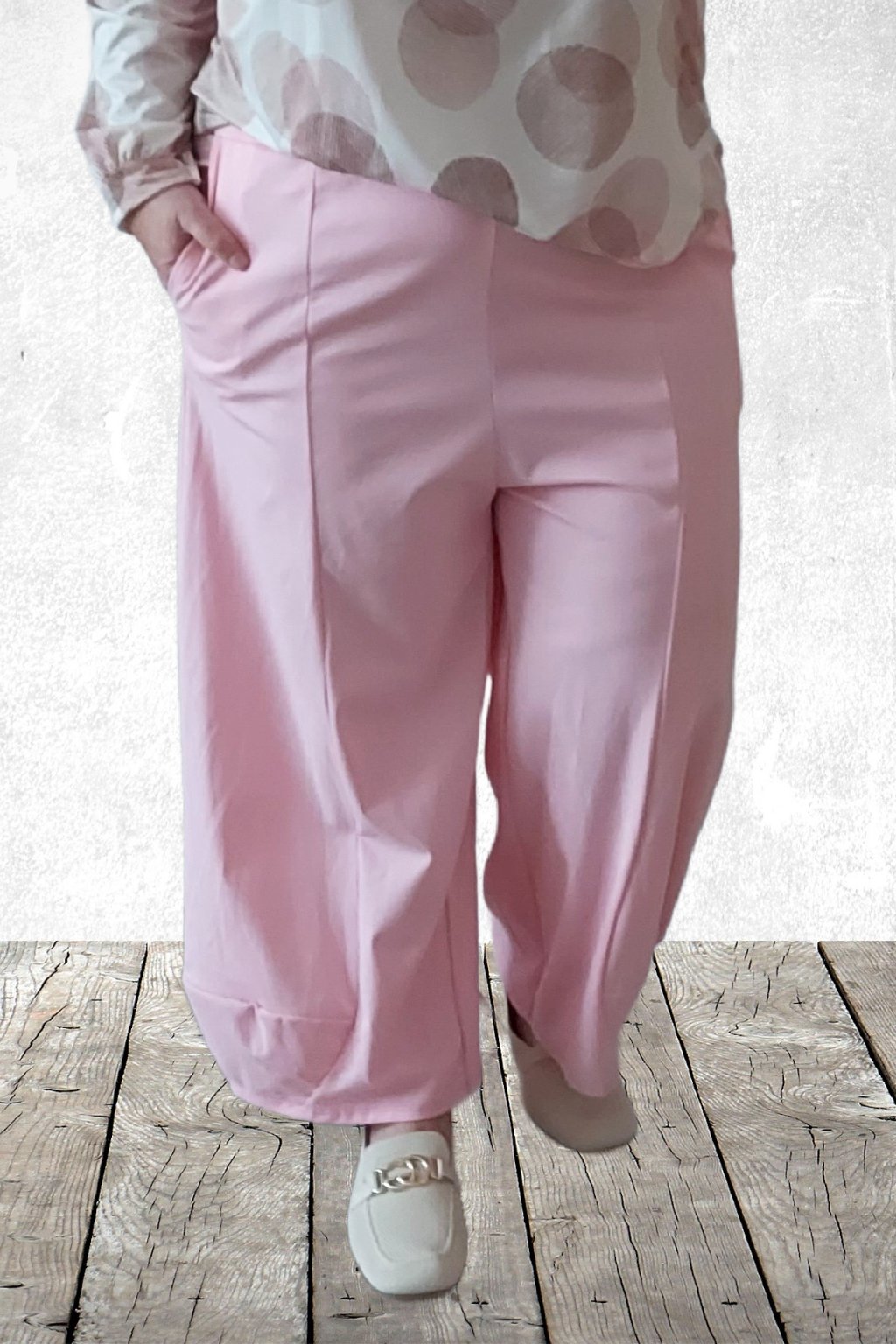Kalhoty s extra širokými nohavicemi. V pase guma. Přední kapsy - vzadu bez kapes. Vysoce kvalitní materiál, vhodný i pro slavnostní příležitost. Foceno na vel. 2XL (pas 110cm, boky 120cm), výška 165cm.