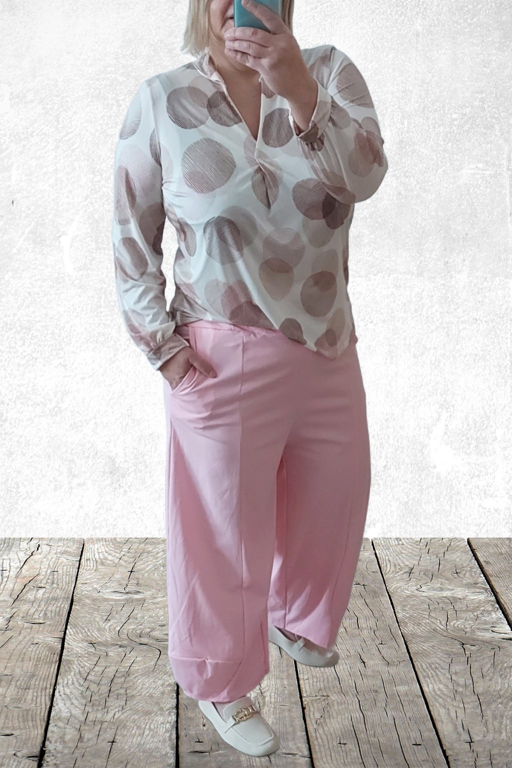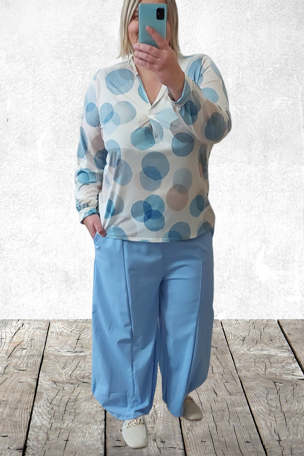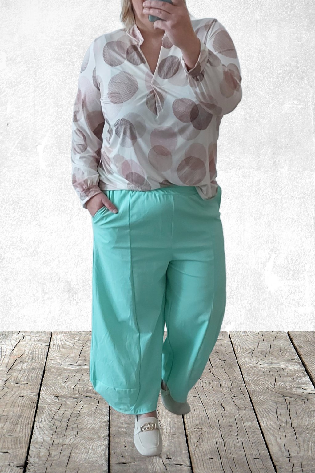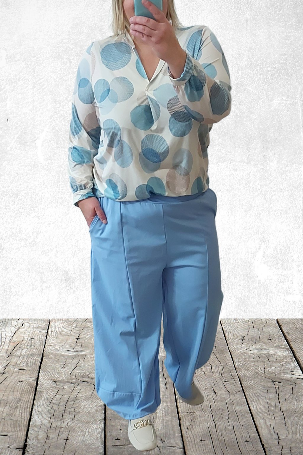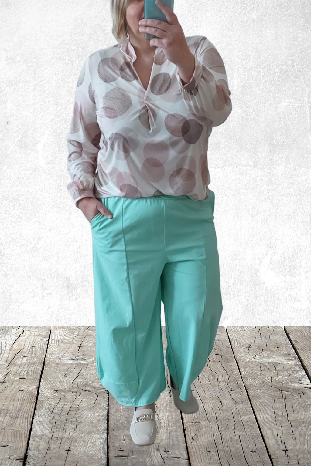 Kalhoty s extra širokými nohavicemi. V pase guma. Přední kapsy - vzadu bez kapes. Vysoce kvalitní materiál, vhodný i pro slavnostní příležitost. Foceno na vel. 2XL (pas 110cm, boky 120cm), výška 165cm.