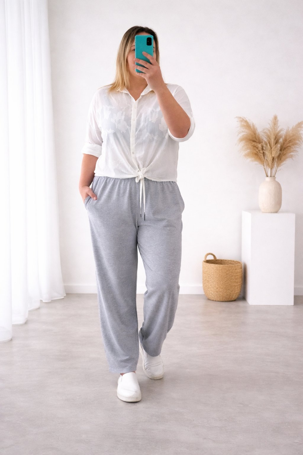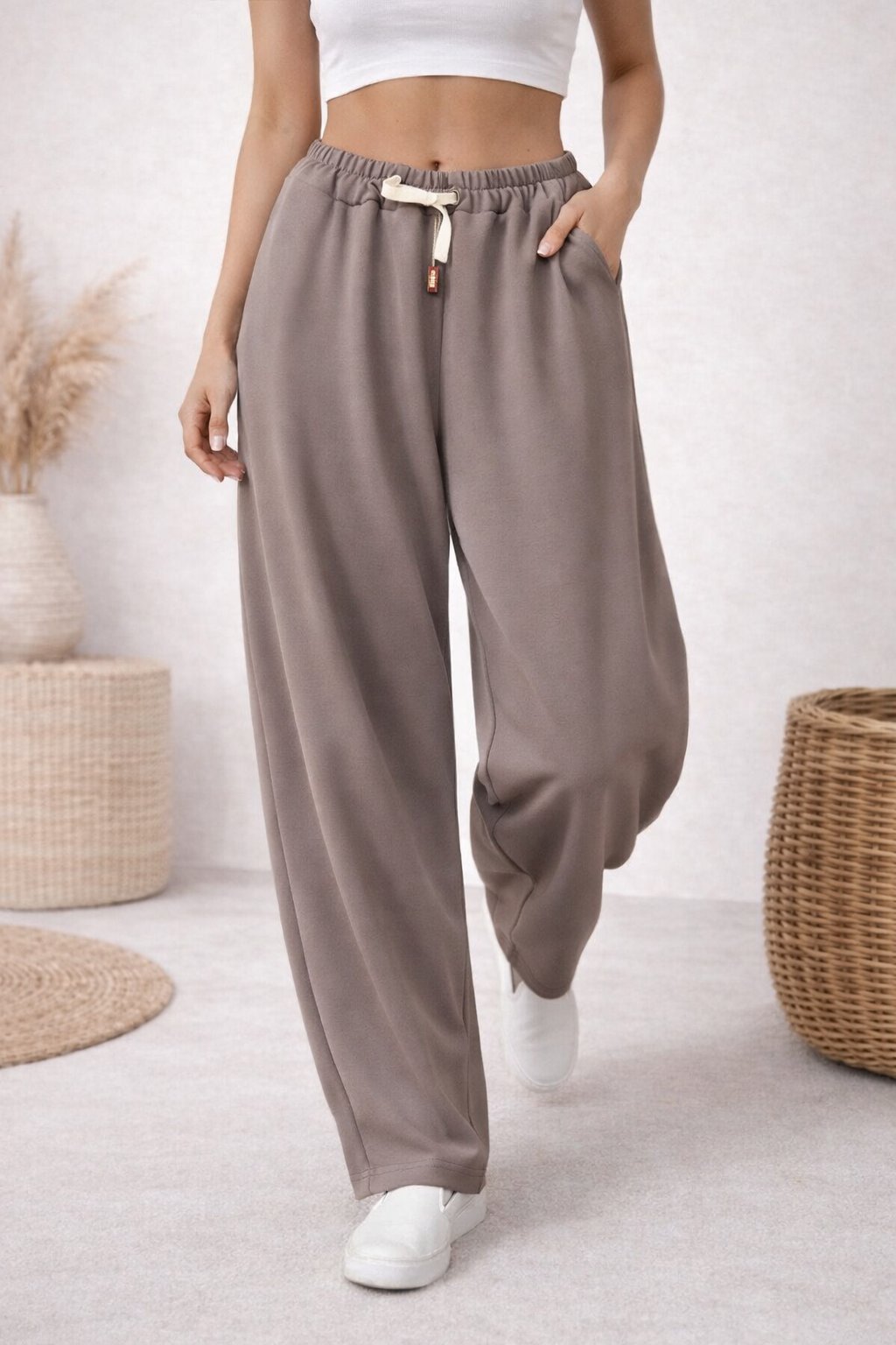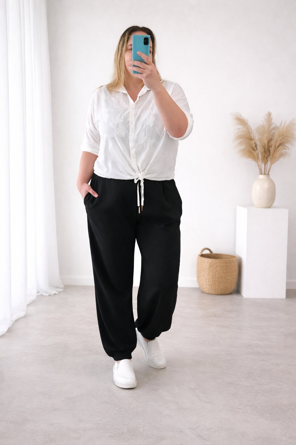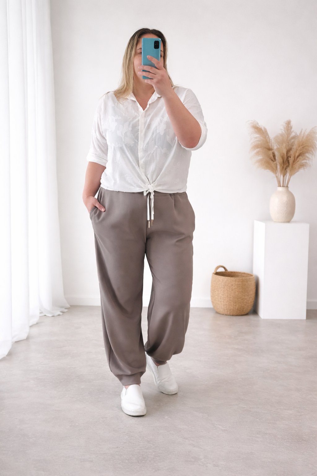 Volnočasové kalhoty balonového střihu. V pase guma a šňůrka pro stažení obvodu. Boční kapsy, vzadu bez kapes. Vhodné i pro větší velikosti. Materiál máslový - jemný, hebký, silnější, drží tvar, top kvalita. Foceno na vel. 2XL (pas 110cm, boky 120cm), výška 165cm.