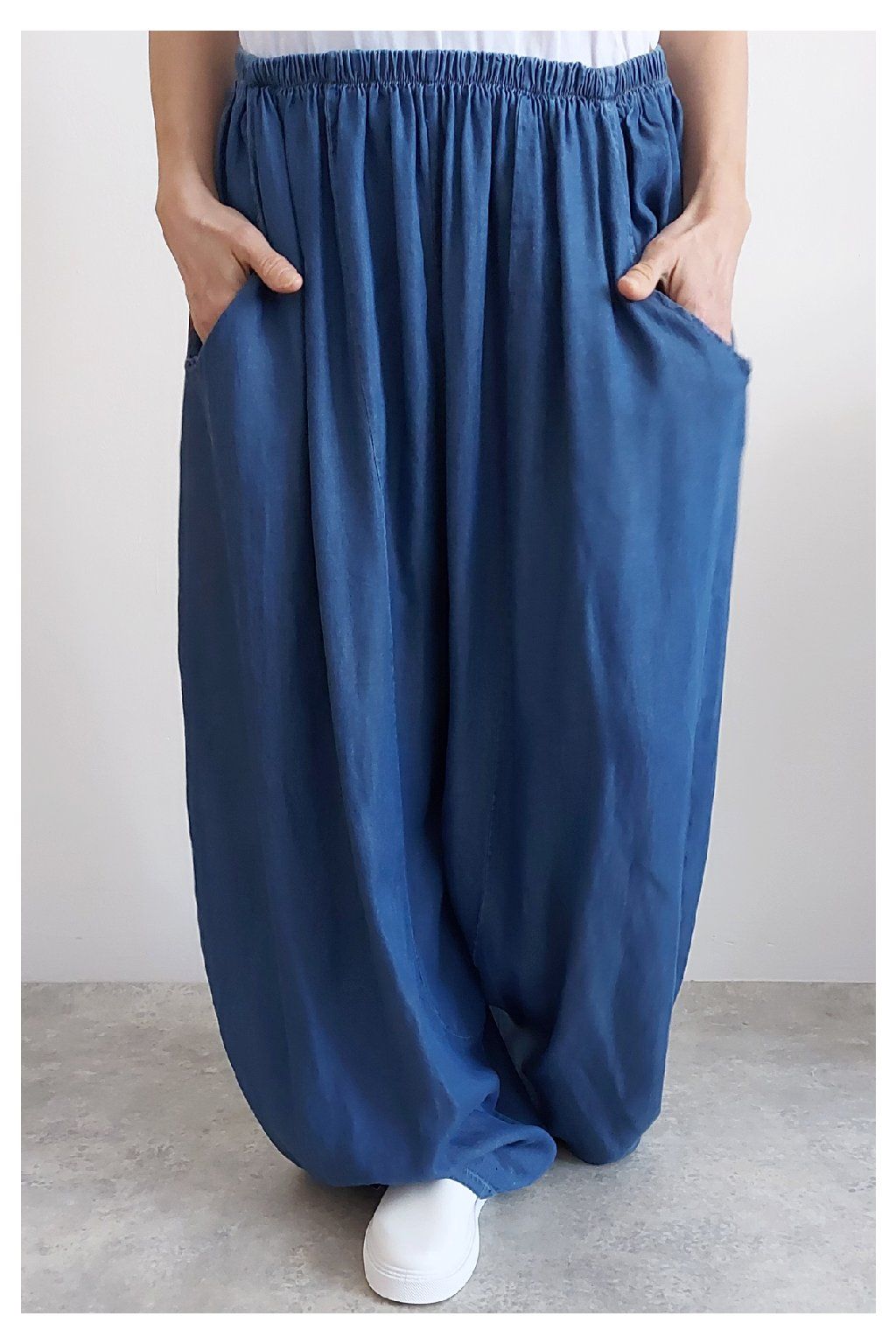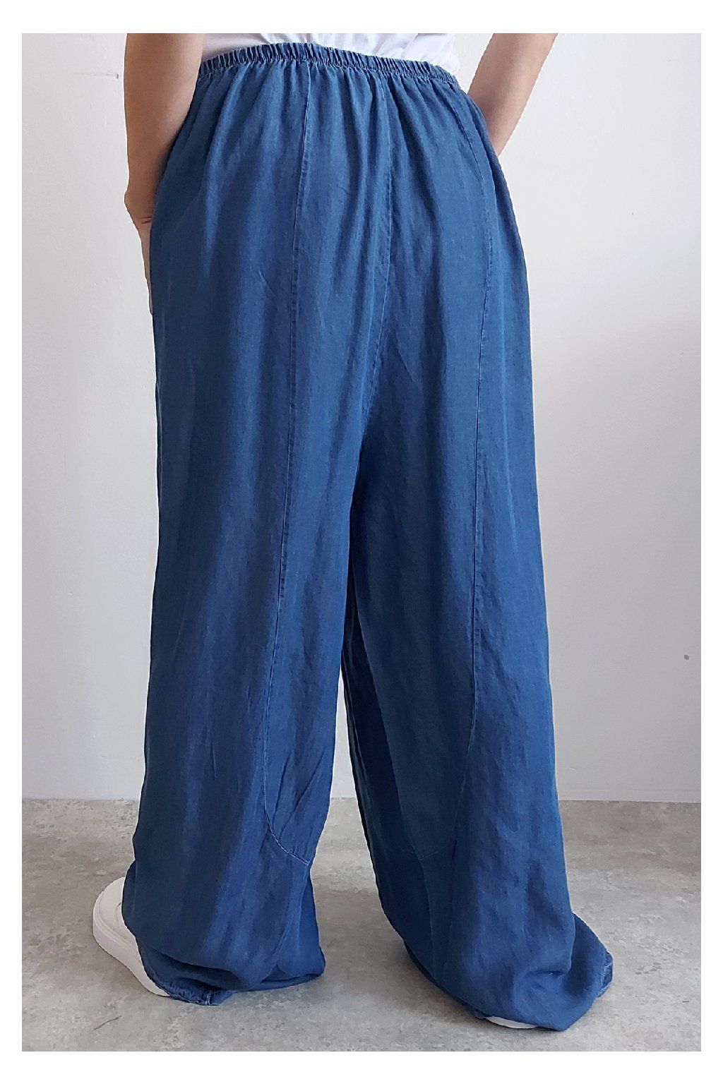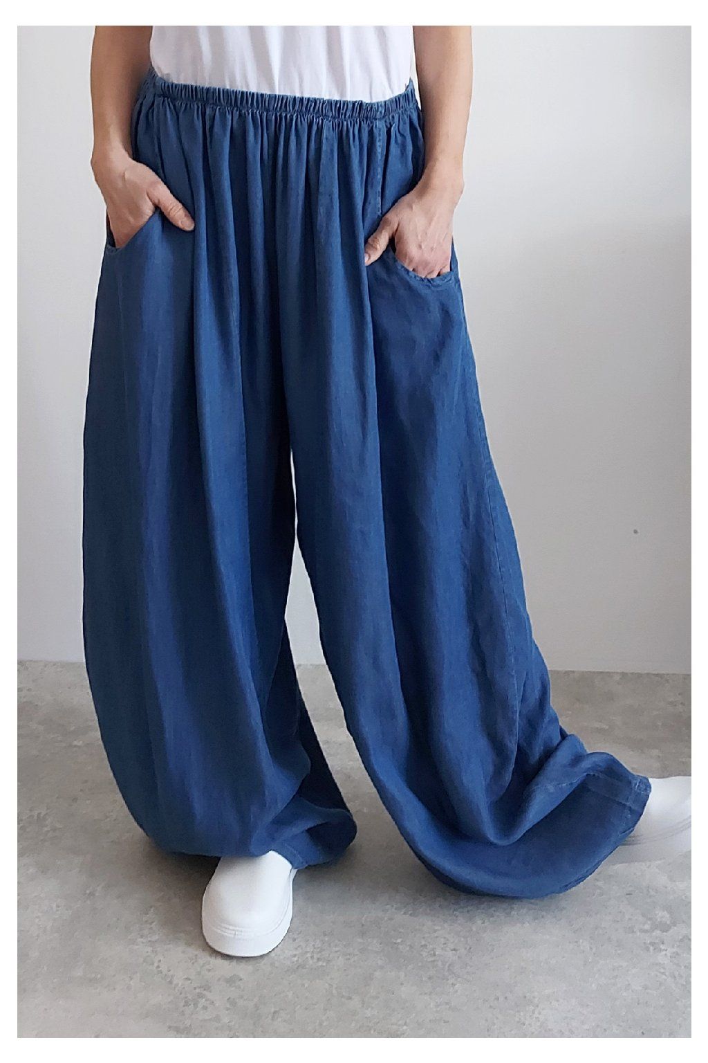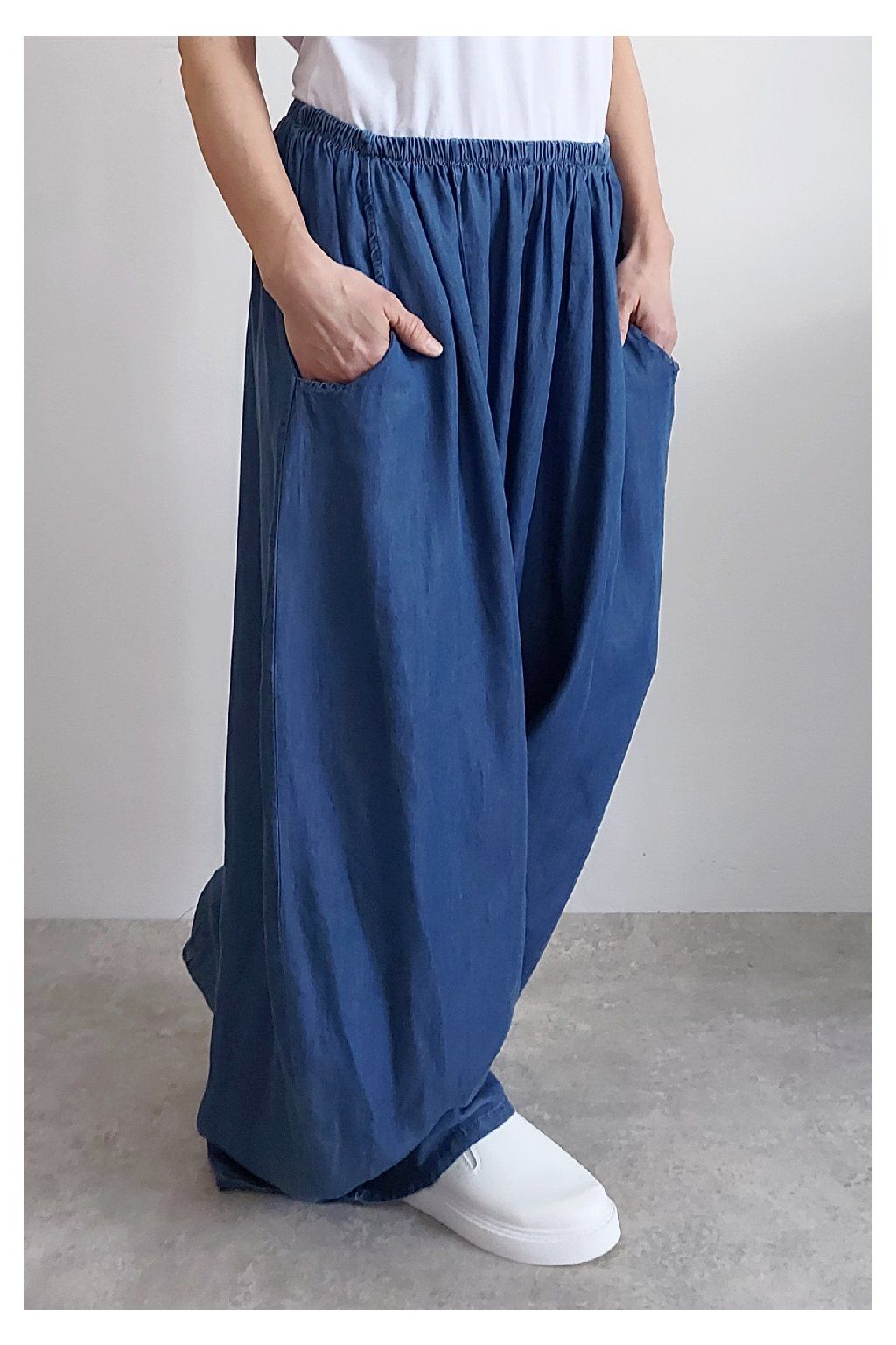 Kalhoty z lehoučkého - vzdušného materiálu. Imitace džínoviny. V pase do gumy, extra široké nohavice. Přední kapsy - vzadu bez kapes. Lehký, vzdušný materiál - ideální na jaro/léto. Není pružný. Foceno na vel. XS, výška 156cm i na vel. 2XL (pas 106cm, boky 122cm), výška 165cm. Vhodné pro vyšší postavy.
