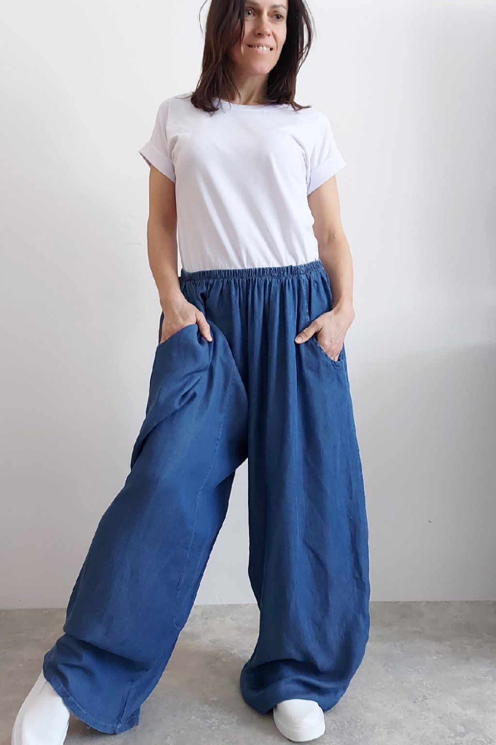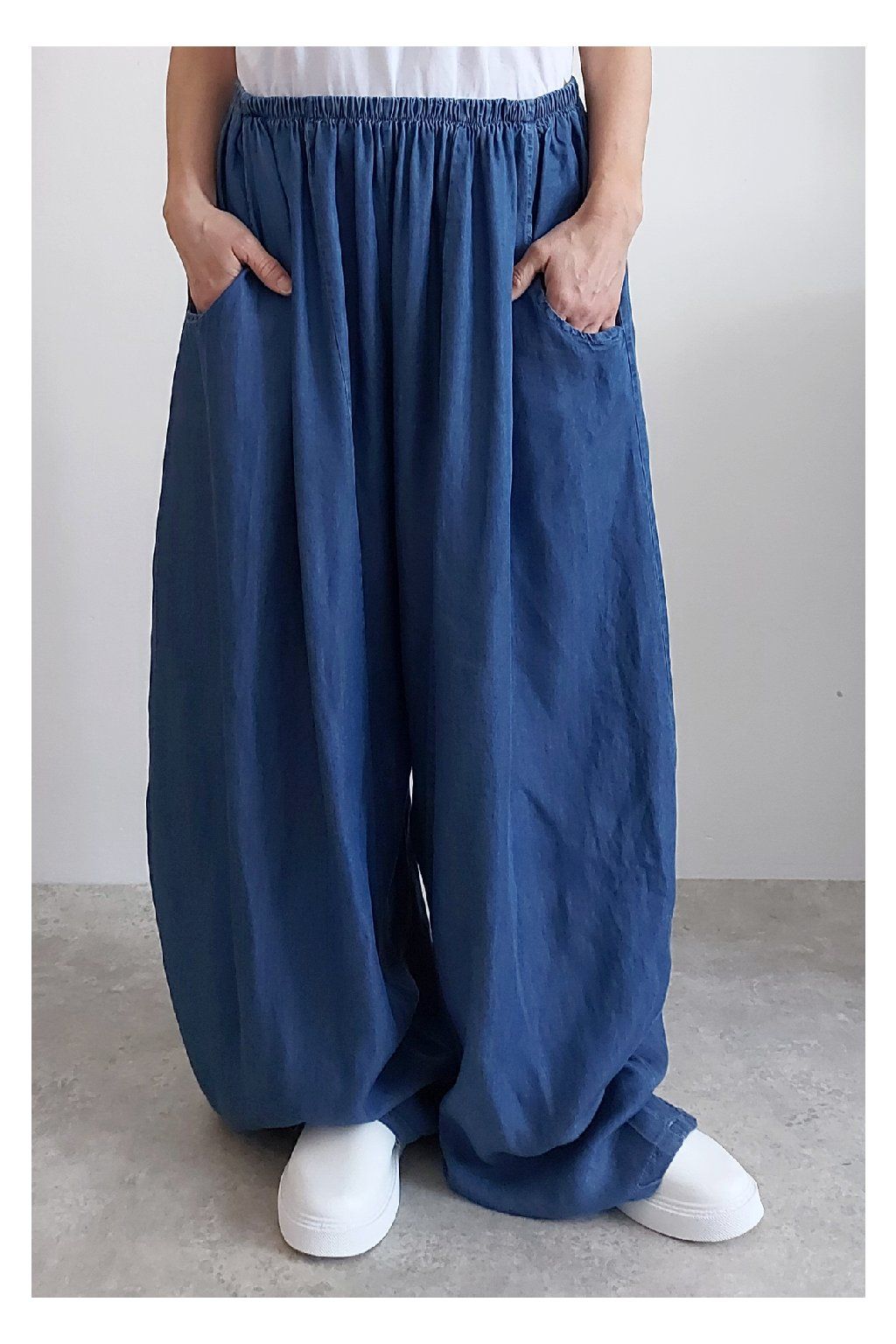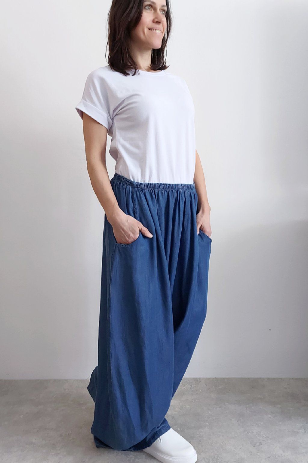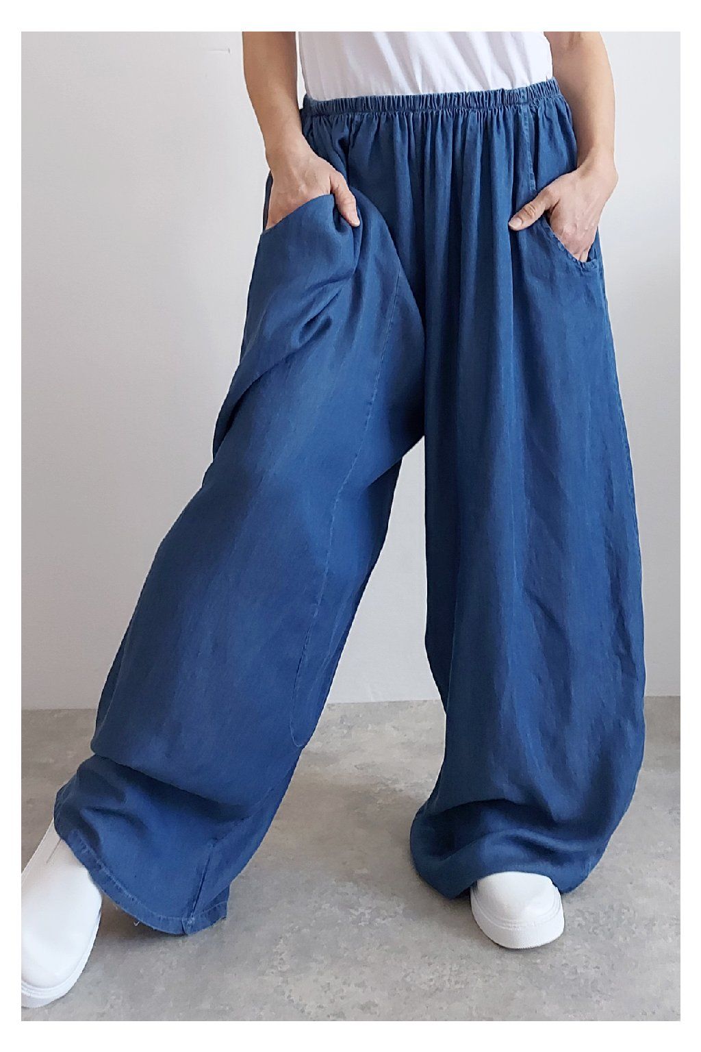 Kalhoty z lehoučkého - vzdušného materiálu. Imitace džínoviny. V pase do gumy, extra široké nohavice. Přední kapsy - vzadu bez kapes. Lehký, vzdušný materiál - ideální na jaro/léto. Není pružný. Foceno na vel. XS, výška 156cm i na vel. 2XL (pas 106cm, boky 122cm), výška 165cm. Vhodné pro vyšší postavy.